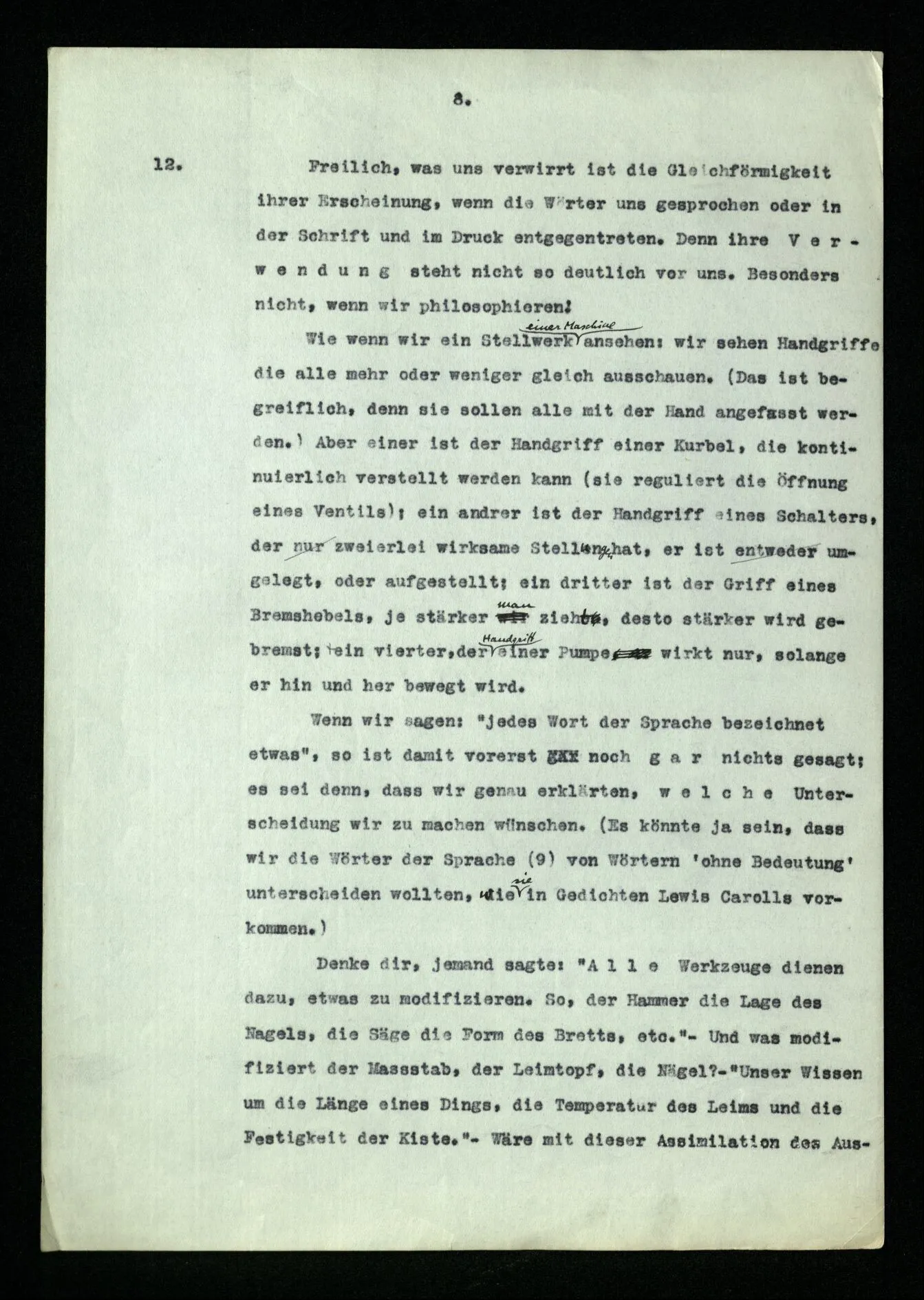 12. Freilich, was uns verwirrt ist die Gleichförmigkeit ihrer Erscheinung, wenn die Wörter uns gesprochen oder in der Schrift und im Druck entgegentreten. Denn ihre Verwendung steht nicht so deutlich vor uns. Besonders nicht, wenn wir philosophieren! Wie wenn wir ein Stellwerk einer Maschine ansehen: wir sehen Handgriffe die alle mehr oder weniger gleich ausschauen. (Das ist begreiflich, denn sie sollen alle mit der Hand angefaßt werden.) Aber einer ist der Handgriff einer Kurbel, die kontinuierlich verstellt werden kann (sie reguliert die Öffnung eines Ventils); ein andrer ist der Handgriff eines Schalters, der zweierlei wirksame Stellungen hat, er ist umgelegt, oder aufgestellt; ein dritter ist der Griff eines Bremshebels, je stärker man zieht, desto stärker wird gebremst; & ein vierter, der einer Pumpe wirkt nur, solange er hin und her bewegt wird. Wenn wir sagen: “jedes Wort der Sprache bezeichnet etwas”, so ist damit vorerst noch gar nichts gesagt; es sei denn, daß wir genau erklärten, welche Unterscheidung wir zu machen wünschen. (Es könnte ja sein, daß wir die Wörter der Sprache (9) von Wörtern ‘ohne Bedeutung’ unterscheiden wollten, wie sie in Gedichten Lewis Carrolls vorkommen.) Denke dir, jemand sagte: “Alle Werkzeuge dienen dazu, etwas zu modifizieren. So, der Hammer die Lage des Nagels, die Säge die Form des Bretts, etc.” – Und was modifiziert der Maßstab, der Leimtopf, die Nägel? – “Unser Wissen um die Länge eines Dings, die Temperatur des Leims und die Festigkeit der Kiste.” – Wäre mit dieser Assimilation des Ausdrucks etwas gewonnen? –