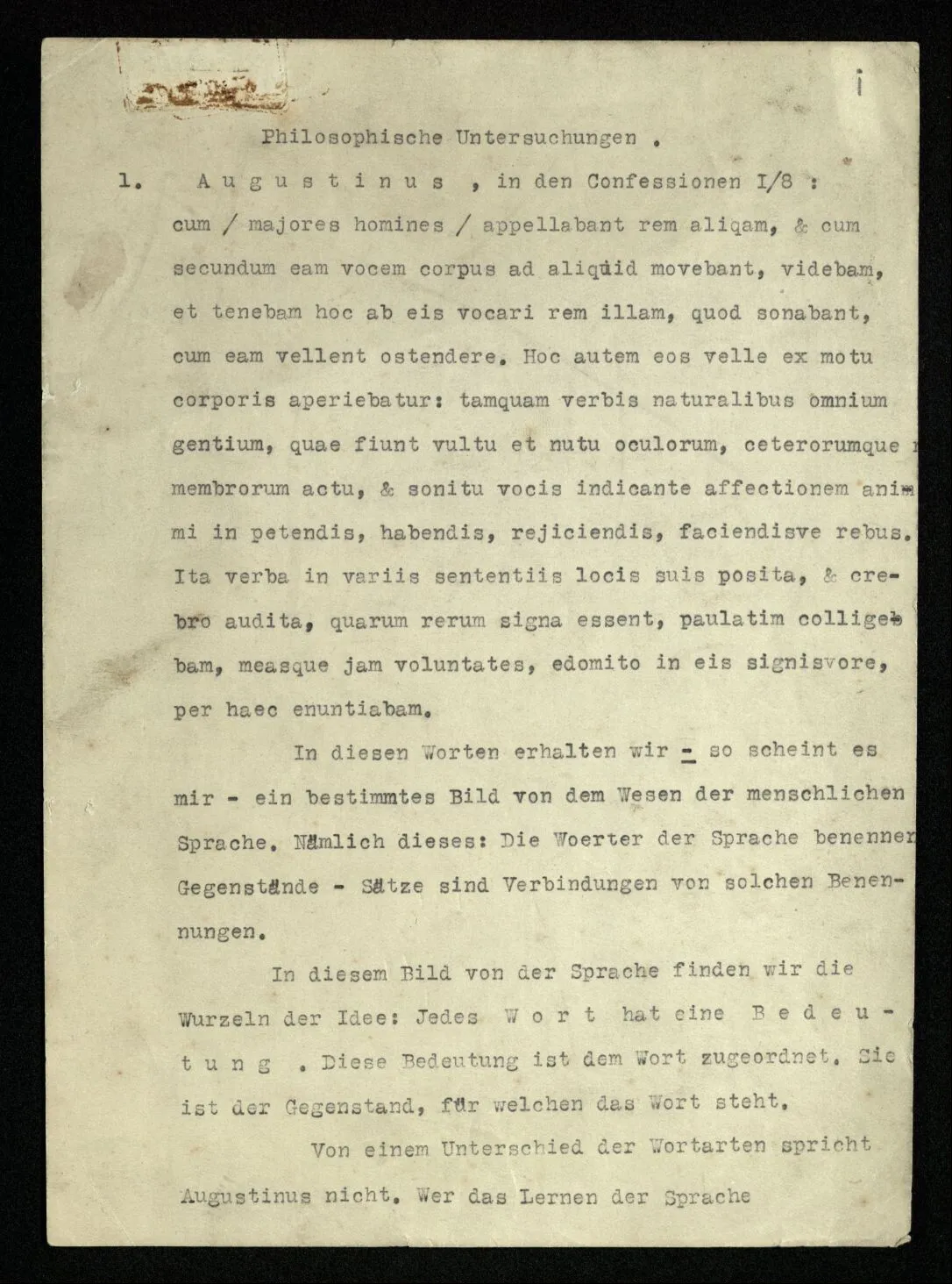 1. Augustinus, in den Confessiones I/8 : cum [majores homines] appellabant rem aliquam, & cum secundum eam vocem corpus ad aliquid movebant, videbam, et tenebam hoc ab eis vocari rem illam, quod sonabant, cum eam vellent ostendere. Hoc autem eos velle ex motu corporis aperiebatur: tamquam verbis naturalibus omnium gentium, quae fiunt vultu et nutu oculorum, ceterorumque membrorum actu, & sonitu vocis indicante affectionem animi in petendis, habendis, rejiciendis, faciendisve rebus. Ita verba in variis sententiis locis suis posita, & crebro audita, quarum rerum signa essent, paulatim colligebam, measque jam voluntates, edomito in eis signis ore, per haec enuntiabam. In diesen Worten erhalten wir – so scheint es mir – ein bestimmtes Bild von dem Wesen der menschlichen Sprache. Nämlich dieses: Die Wörter der Sprache benennen Gegenstände – Sätze sind Verbindungen von solchen Benennungen. In diesem Bild von der Sprache finden wir die Wurzeln der Idee: Jedes Wort hat eine Bedeutung. Diese Bedeutung ist dem Wort zugeordnet. Sie ist der Gegenstand, für welchen das Wort steht. Von einem Unterschied der Wortarten spricht Augustinus nicht. Wer das Lernen der Sprache so beschreibt, denkt – so möchte ich glauben – zunächst an Hauptwörter, wie “Tisch”, “Stuhl”, “Brot” und die Namen von Personen; erst in zweiter Linie an die Namen gewisser Tätigkeiten und Eigenschaften, und an die übrigen Wortarten als an etwas, was sich finden wird.