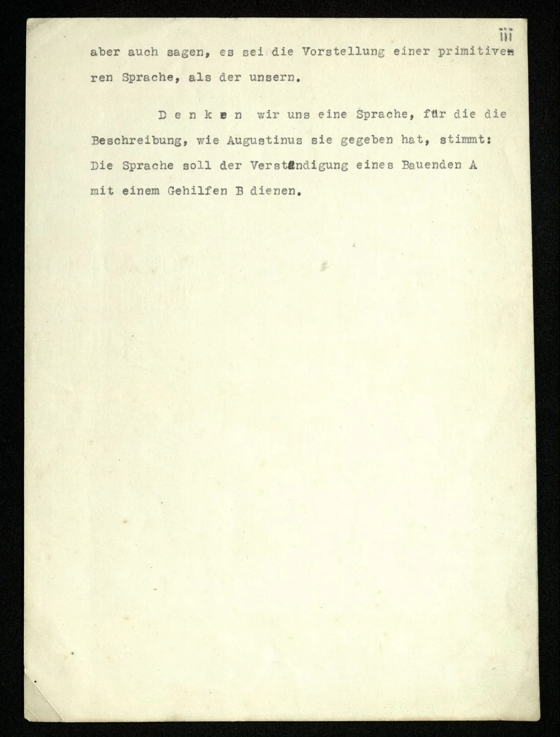 Denken wir uns eine Sprache, für die die Beschreibung, wie Augustinus sie gegeben hat, stimmt: Die Sprache soll der Verständigung eines Bauenden A mit einem Gehilfen B dienen. Jener philosophische Begriff der Bedeutung ist zu Hause in einer primitiven Vorstellung vom Funktionieren unserer Sprache. Wir können aber auch sagen, die Vorstellung trifft zu, nur für eine primitive Sprache. Denken wir uns nun eine Sprache, für die die Darstellung, die Augustinus gegeben hat gänzlich stimmt: Sie soll der Verständigung eines Bauenden A mit seinem Gehilfen B dienen. A führt einen Bau auf aus Bausteinen; es sind Würfel, Säulen, Platten und Balken vorhanden. B hat ihm die Bausteine zuzureichen, und zwar nach der Reihe, wie A sie braucht. Zu dem Zweck bedienen sie sich einer Sprache, bestehend aus den Wörtern: “Würfel”, “Säule”, “Platte”, “Balken”. A ruft sie aus; – B bringt den Stein, den er gelernt hat, auf diesen Ruf zu bringen. Fasse dies als vollständige primitive Sprache auf!