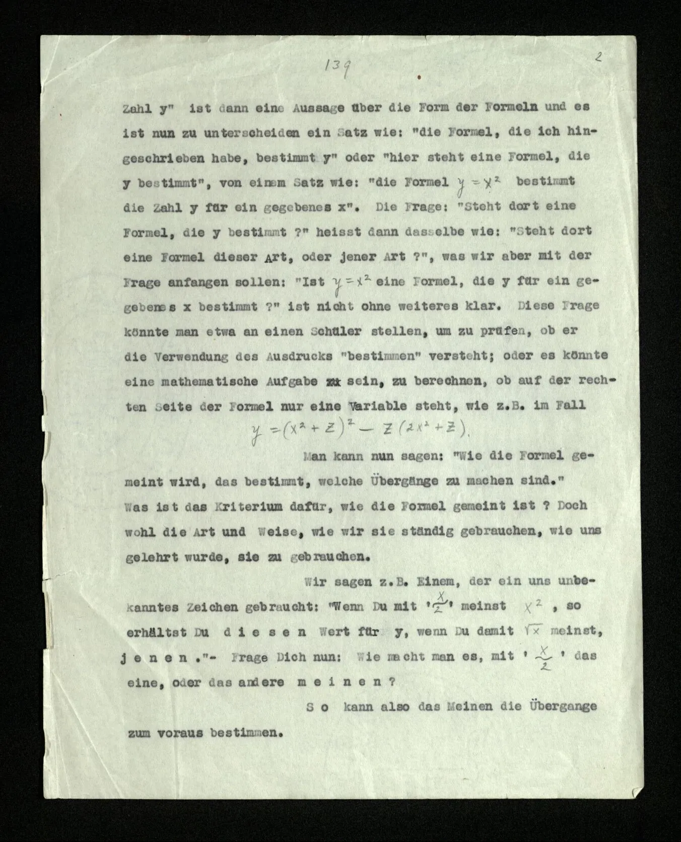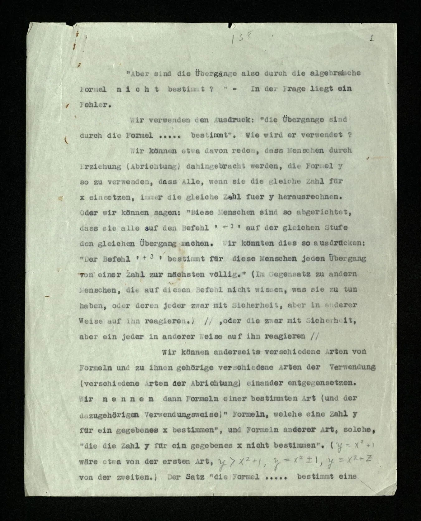 “Aber sind die Übergänge also durch die algebraische Formel nicht bestimmt?” – In der Frage liegt ein Fehler. Wir verwenden den Ausdruck: “die Übergänge sind durch die Formel ‥‥․ bestimmt”. Wie wird er verwendet? Wir können etwa davon reden, daß Menschen durch Erziehung (Abrichtung) dahingebracht werden, die Formel y = x² so zu verwenden, daß Alle, wenn sie die gleiche Zahl für x einsetzen, immer die gleiche Zahl für y herausrechnen. Oder wir können sagen: “Diese Menschen sind so abgerichtet, daß sie alle auf den Befehl ‘+3’ auf der gleichen Stufe den gleichen Übergang machen.” Wir könnten dies so ausdrücken: “Der Befehl ‘+3’ bestimmt für diese Menschen jeden Übergang von einer Zahl zur nächsten völlig.” (Im Gegensatz zu andern Menschen, die auf diesen Befehl nicht wissen, was sie zu tun haben, oder deren jeder zwar mit Sicherheit, aber in anderer Weise auf ihn reagieren.) Wir können anderseits verschiedene Arten von Formeln und zu ihnen gehörige verschiedene Arten der Verwendung (verschiedene Arten der Abrichtung) einander entgegensetzen. Wir nennen dann Formeln einer bestimmten Art (und der dazugehörigen Verwendungsweise) “Formeln, welche eine Zahl y für ein gegebenes x bestimmen”, und Formeln anderer Art, solche, “die die Zahl y für ein gegebenes x nicht bestimmen”. (y = x² + 1 wäre etwa von der ersten Art, y > x² + 1, y = x² ± 1, y = x² + Z von der zweiten.) Der Satz “die Formel ‥‥․ bestimmt eine Zahl y” ist dann eine Aussage über die Form der Formeln und es ist nun zu unterscheiden ein Satz wie: “die Formel, die ich hingeschrieben habe, bestimmt y” oder “hier steht eine Formel, die y bestimmt”, von einem Satz wie: “die Formel y = x² bestimmt die Zahl y für ein gegebenes x”. Die Frage: “Steht dort eine Formel, die y bestimmt?” heißt dann dasselbe wie: “Steht dort eine Formel dieser Art, oder jener Art?”, was wir aber mit der Frage anfangen sollen: “Ist y = x² eine Formel, die y für ein gegebenes x bestimmt?” ist nicht ohne weiteres klar. Diese Frage könnte man etwa an einen Schüler stellen, um zu prüfen, ob er die Verwendung des Ausdrucks “bestimmen” versteht; oder es könnte eine mathematische Aufgabe sein, zu berechnen, ob auf der rechten Seite der Formel nur eine Variable steht, wie z.B. im Fall