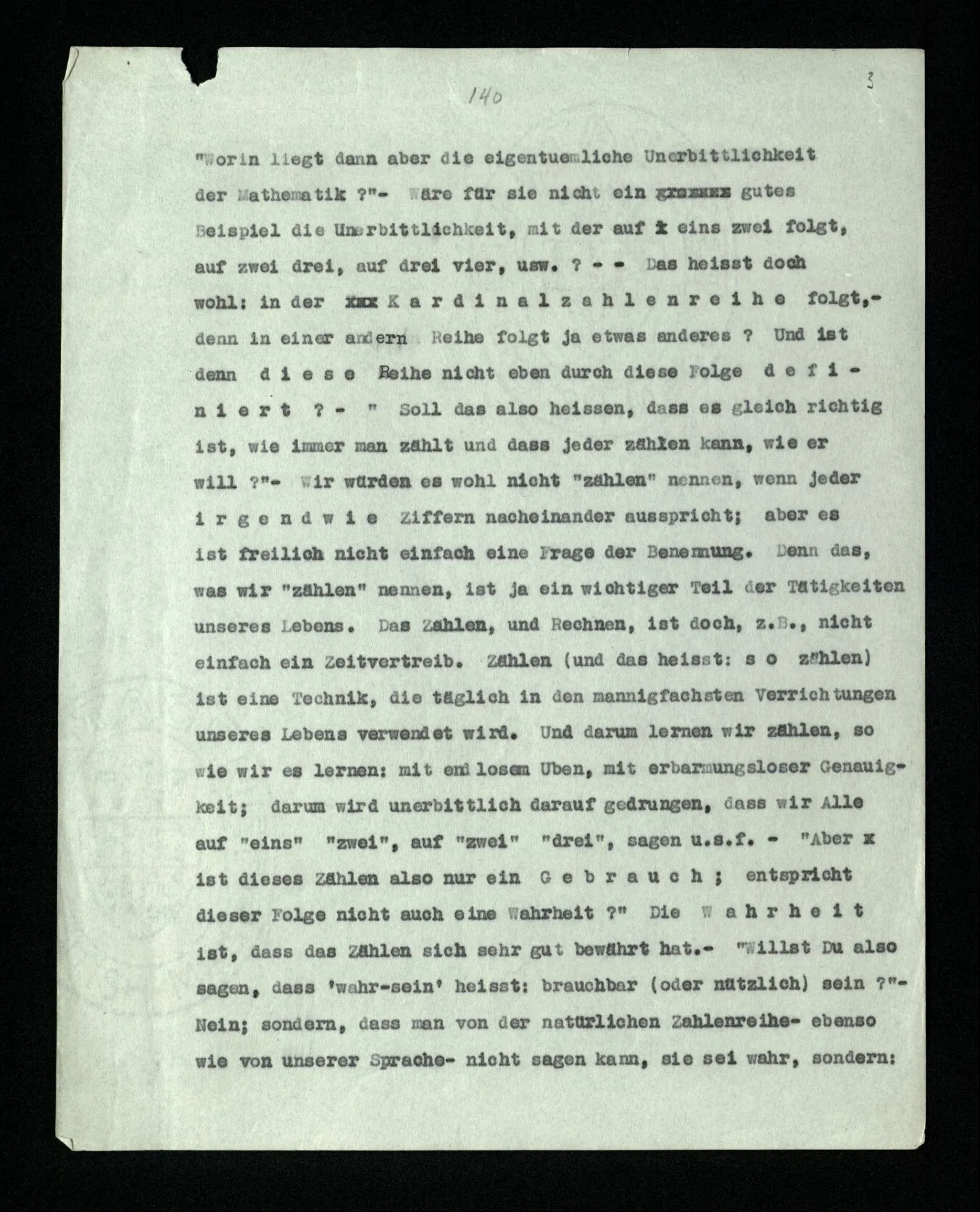 “Worin liegt dann aber die eigentümliche Unerbittlichkeit der Mathematik?” – Wäre für sie nicht ein gutes Beispiel die Unerbittlichkeit, mit der auf eins zwei folgt, auf zwei drei, auf drei vier, usw.? ‒ ‒ Das heißt doch wohl: in der Kardinalzahlenreihe folgt, – denn in einer andern Reihe folgt ja etwas anderes? Und ist denn diese Reihe nicht eben durch diese Folge definiert? – “Soll das also heißen, daß es gleich richtig ist, wie immer man zählt und daß jeder zählen kann, wie er will?” – Wir würden es wohl nicht “zählen” nennen, wenn jeder irgendwie Ziffern nacheinander ausspricht; aber es ist freilich nicht einfach eine Frage der Benennung. Denn das, was wir “zählen” nennen, ist ja ein wichtiger Teil der Tätigkeiten unseres Lebens. Das Zählen, und Rechnen, ist doch, z.B., nicht einfach ein Zeitvertreib. Zählen (und das heißt: so zählen) ist eine Technik, die täglich in den mannigfachsten Verrichtungen unseres Lebens verwendet wird. Und darum lernen wir zählen, so wie wir es lernen: mit endlosem Üben, mit erbarmungsloser Genauigkeit; darum wird unerbittlich darauf gedrungen, daß wir Alle auf “eins” “zwei”, auf “zwei” “drei”, sagen u.s.f. – “Aber ist dieses Zählen also nur ein Gebrauch; entspricht dieser Folge nicht auch eine Wahrheit?” Die Wahrheit ist, daß das Zählen sich sehr gut bewährt hat. – “Willst du also sagen, daß ‘wahr-sein’ heißt: brauchbar (oder nützlich) sein?” – Nein; sondern, daß man von der natürlichen Zahlenreihe – ebenso wie von unserer Sprache – nicht sagen kann, sie sei wahr, sondern: sie sei brauchbar und, vor allem, sie werde verwendet.