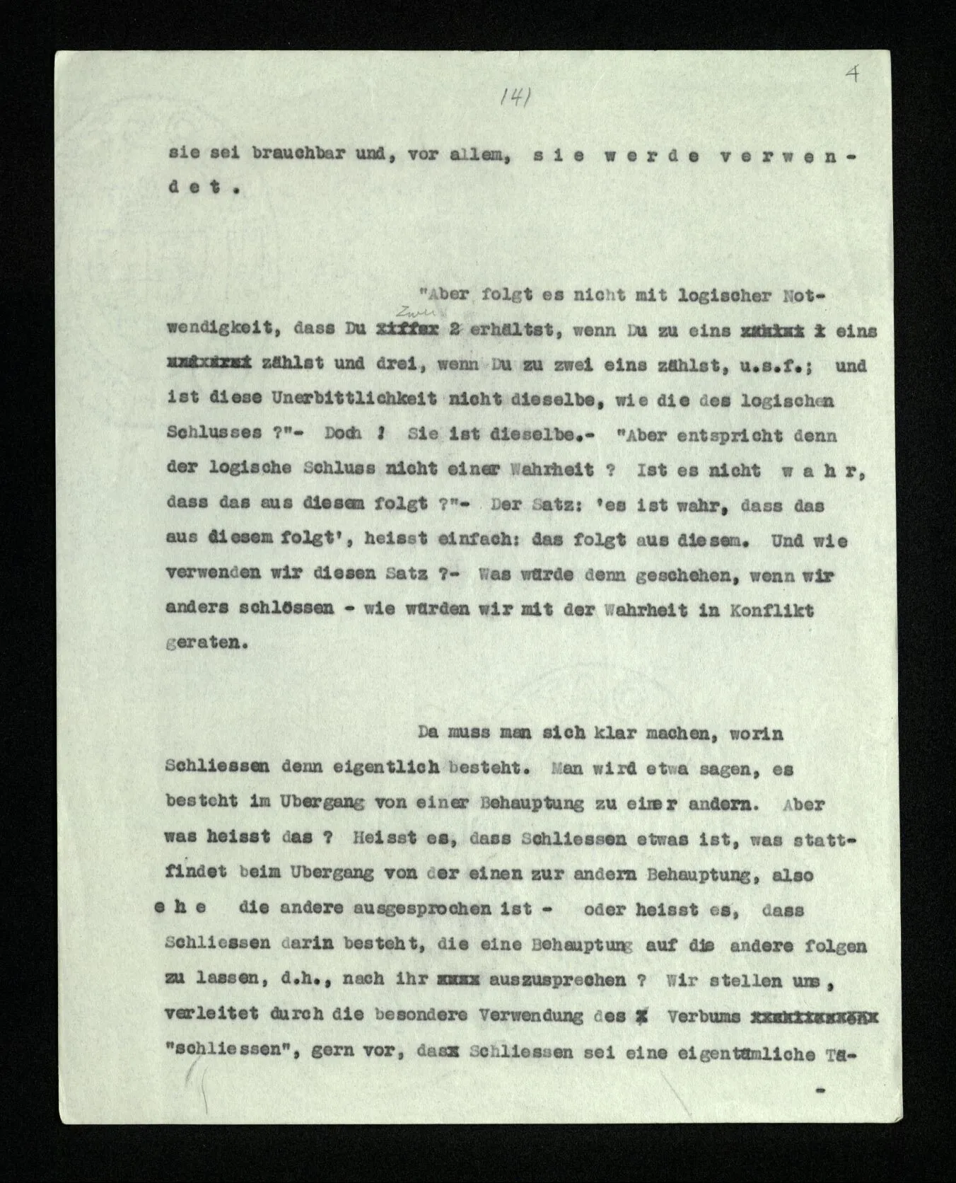 “Aber folgt es nicht mit logischer Notwendigkeit, daß Du zwei erhältst, wenn Du zu eins eins zählst und drei, wenn Du zu zwei eins zählst, u.s.f.; und ist diese Unerbittlichkeit nicht dieselbe, wie die des logischen Schlusses?” – Doch! Sie ist dieselbe. – “Aber entspricht denn der logische Schluß nicht einer Wahrheit? Ist es nicht wahr, daß das aus diesem folgt?” – Der Satz: ‘es ist wahr, daß das aus diesem folgt’, heißt einfach: das folgt aus diesem. Und wie verwenden wir diesen Satz? – Was würde denn geschehen, wenn wir anders schlössen – wie würden wir mit der Wahrheit in Konflikt geraten.