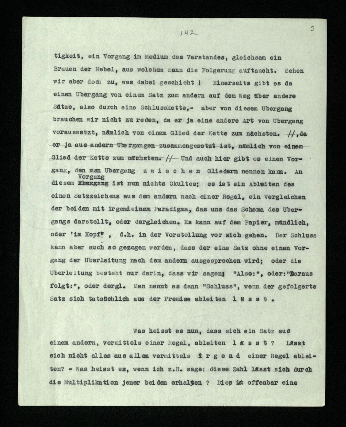 Da muß man sich klar machen, worin Schließen denn eigentlich besteht. Man wird etwa sagen, es besteht im Übergang von einer Behauptung zu einer andern. Aber was heißt das? Heißt es, daß Schließen etwas ist, was stattfindet beim Übergang von der einen zur andern Behauptung, also ehe die andere ausgesprochen ist – oder heißt es, daß Schließen darin besteht, die eine Behauptung auf die andere folgen zu lassen, d.h., nach ihr auszusprechen? Wir stellen uns, verleitet durch die besondere Verwendung des Verbums “schließen”, gern vor, das Schließen sei eine eigentümliche Tätigkeit, ein Vorgang im Medium des Verstandes, gleichsam ein Brauen der Nebel, aus welchem dann die Folgerung auftaucht. Sehen wir aber doch zu, was dabei geschieht! Einerseits gibt es da einen Übergang von einem Satz zum andern auf dem Weg über andere Sätze, also durch eine Schlußkette, – aber von diesem Übergang brauchen wir nicht zu reden, da er ja eine andere Art von Übergang voraussetzt, nämlich von einem Glied der Kette zum nächsten. Und auch hier gibt es einen Vorgang, den man Übergang zwischen Gliedern nennen kann. An diesem Vorgang ist nun nichts Okkultes; es ist ein Ableiten des einen Satzzeichens aus dem andern nach einer Regel, ein Vergleichen der beiden mit irgendeinem Paradigma, das uns das Schema des Übergangs darstellt, oder dergleichen. Es kann auf dem Papier, mündlich, oder ‘im Kopf’, d.h. in der Vorstellung vor sich gehen. Der Schluß kann aber auch so gezogen werden, daß der eine Satz ohne einen Vorgang der Überleitung nach dem andern ausgesprochen wird; oder die Überleitung besteht nur darin, daß wir sagen; “Also:”, oder: “Daraus folgt:”, oder dergl. Man nennt es dann “Schluß”, wenn der gefolgerte Satz sich tatsächlich aus der Prämisse ableiten läßt.