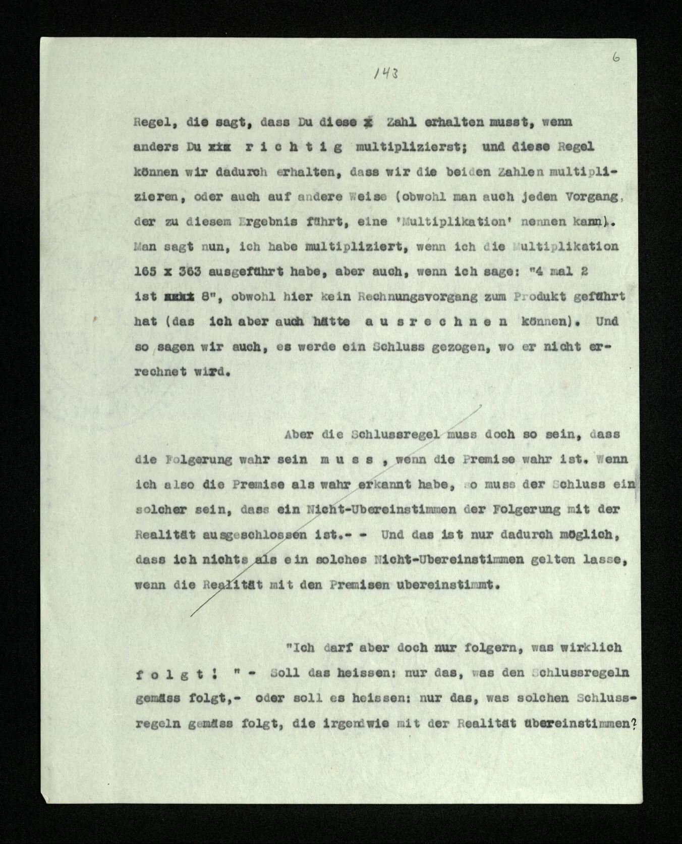 Was heißt es nun, daß sich ein Satz aus einem andern, vermittels einer Regel, ableiten läßt? Läßt sich nicht alles aus allem vermittels irgend einer Regel ableiten? – Was heißt es, wenn ich z.B. sage: diese Zahl läßt sich durch die Multiplikation jener beiden erhalten? Dies ist offenbar eine Regel, die sagt, daß Du diese Zahl erhalten mußt, wenn anders Du richtig multiplizierst; und diese Regel können wir dadurch erhalten, daß wir die beiden Zahlen multiplizieren, oder auch auf andere Weise (obwohl man auch jeden Vorgang, der zu diesem Ergebnis führt, eine ‘Multiplikation’ nennen kann). Man sagt nun, ich habe multipliziert, wenn ich die Multiplikation 165 × 363 ausgeführt habe, aber auch, wenn ich sage: “4 mal 2 ist 8”, obwohl hier kein Rechnungsvorgang zum Produkt geführt hat (das ich aber auch hätte ausrechnen können). Und so sagen wir auch, es werde ein Schluß gezogen, wo er nicht errechnet wird.