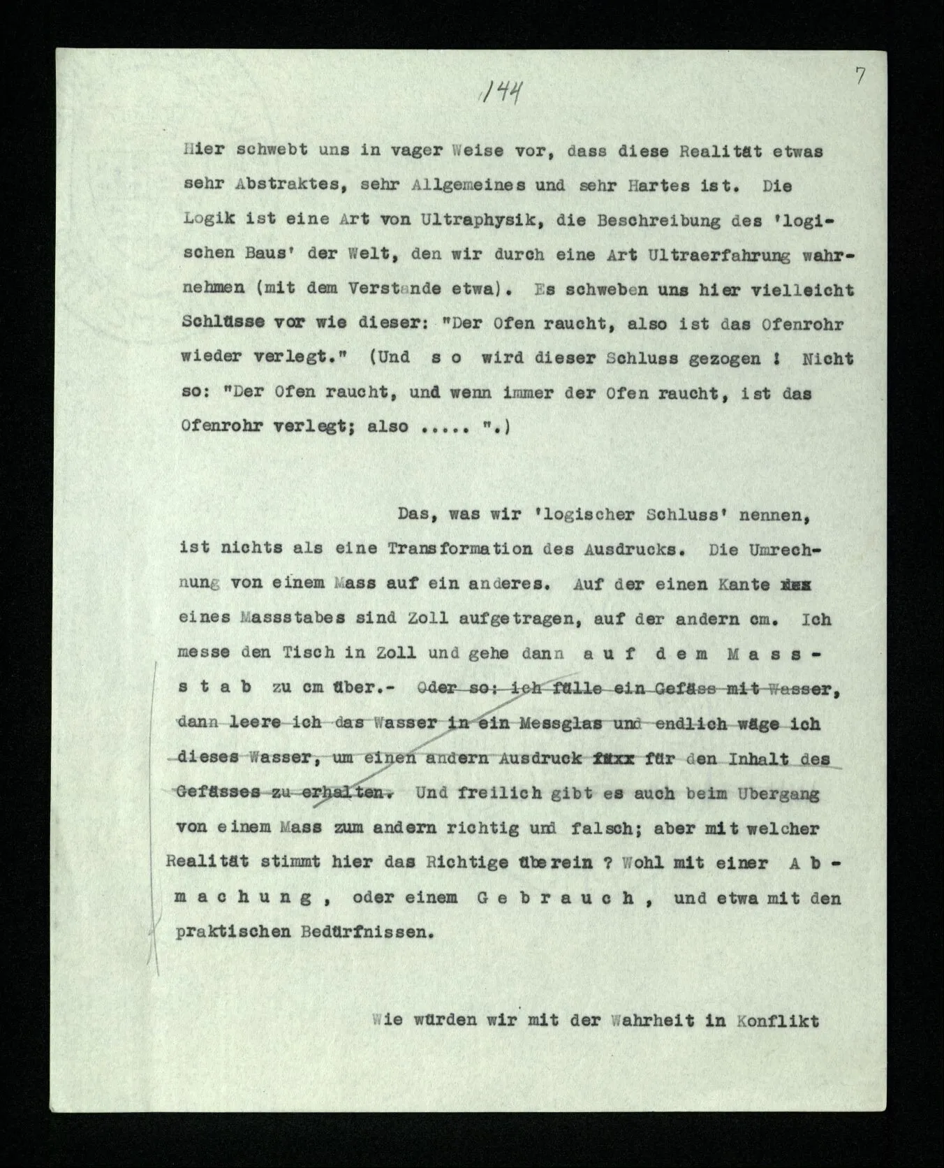 Das, was wir ‘logischer Schluß’ nennen, ist nichts als eine Transformation des Ausdrucks. Die Umrechnung von einem Maß auf ein anderes. Auf der einen Kante eines Maßstabes sind Zoll aufgetragen, auf der andern cm. Ich messe den Tisch in Zoll und gehe dann auf dem Maßstab zu cm über. – Und freilich gibt es auch beim Übergang von einem Maß zum andern richtig und falsch; aber mit welcher Realität stimmt hier das Richtige überein? Wohl mit einer Abmachung, oder einem Gebrauch, und etwa mit den praktischen Bedürfnissen.