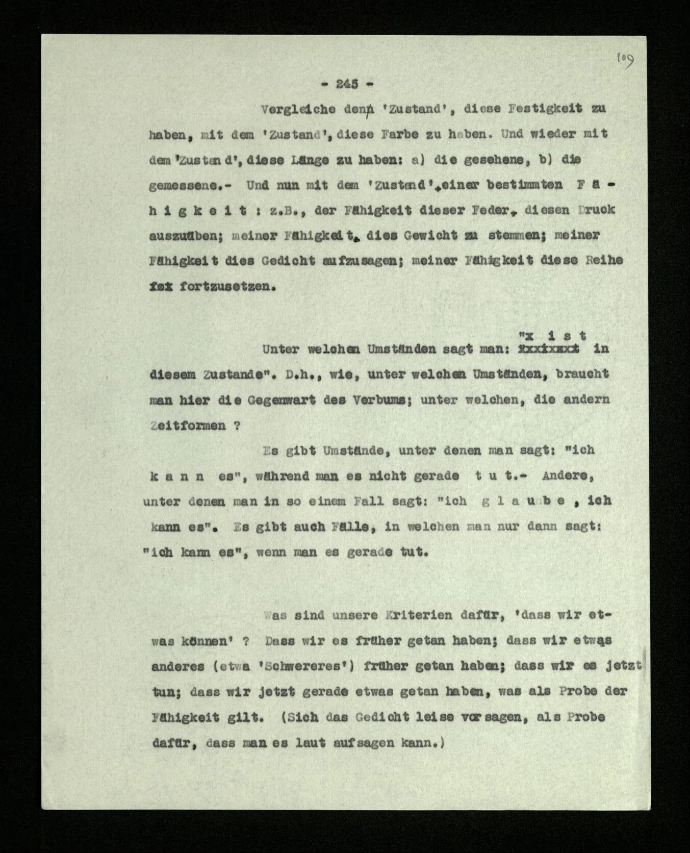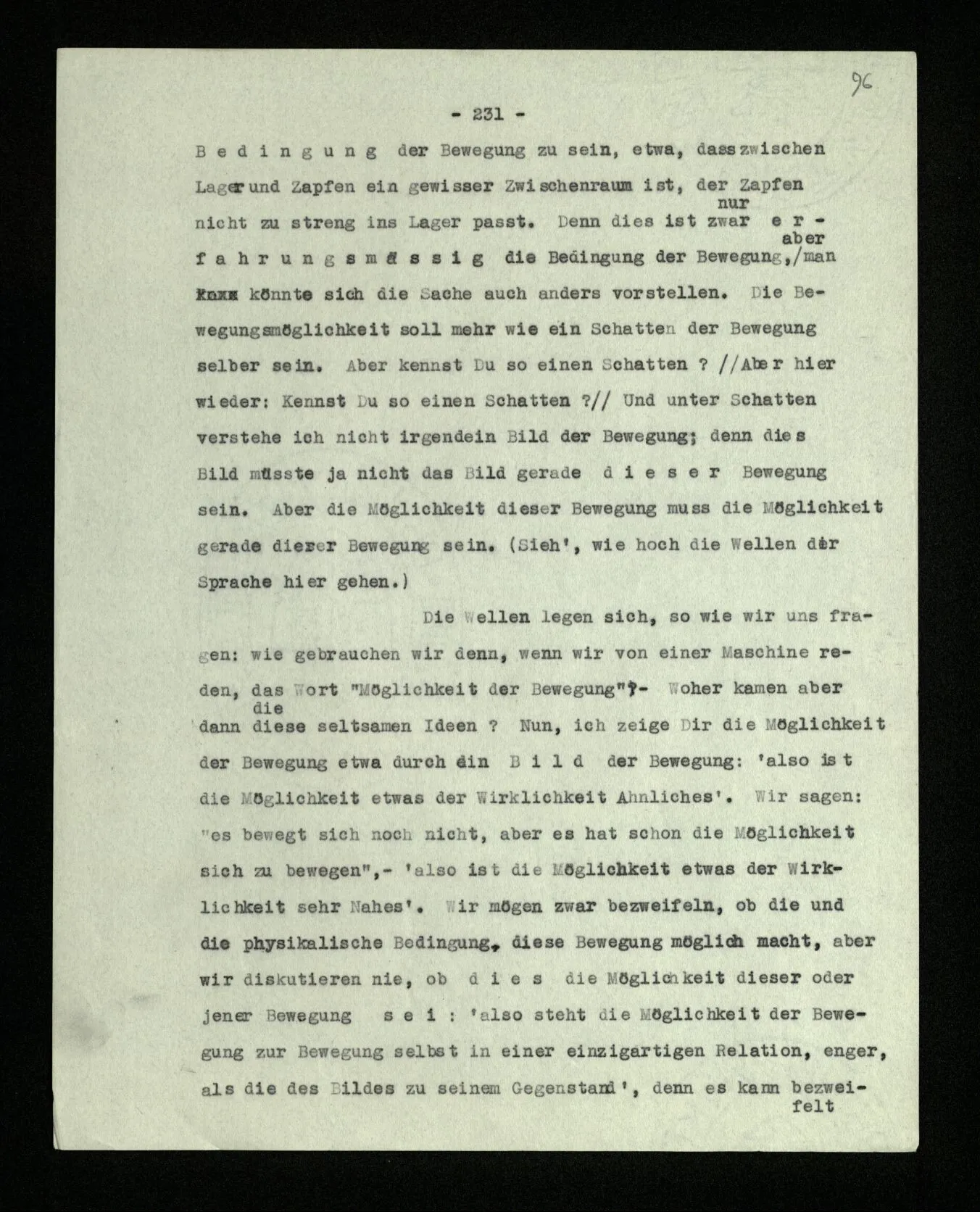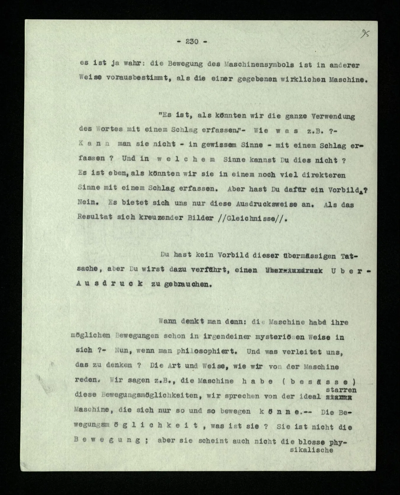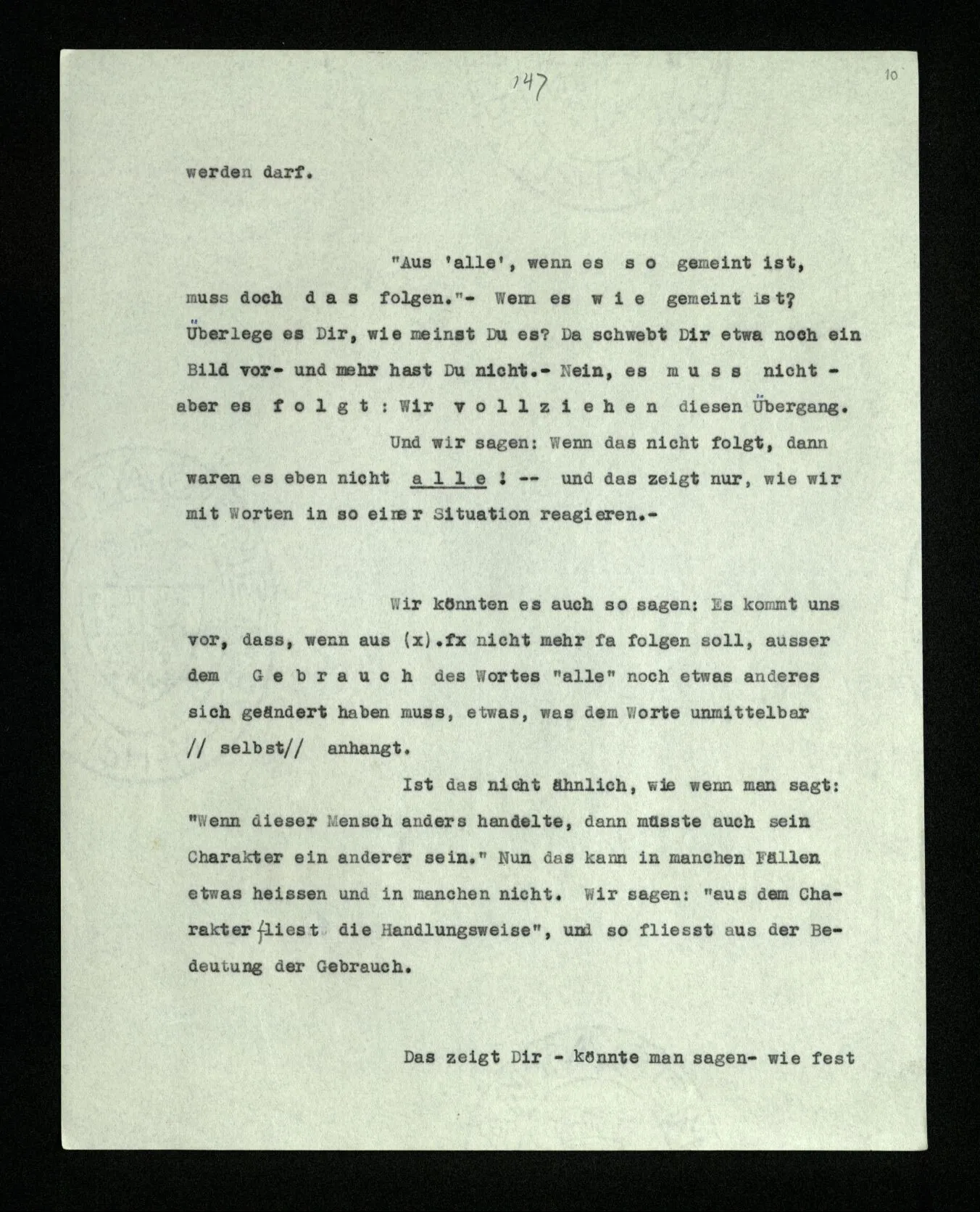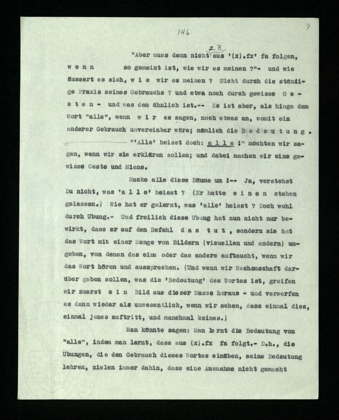 “Aus ‘alle’, wenn es so gemeint ist, muß doch das folgen.” – Wenn es wie gemeint ist? Überlege es Dir, wie meinst Du es? Da schwebt Dir etwa noch ein Bild vor – und mehr hast Du nicht. – Nein, es muß nicht – aber es folgt: Wir vollziehen diesen Übergang. Und wir sagen: Wenn das nicht folgt, dann waren es eben nicht alle! – – und das zeigt nur, wie wir mit Worten in so einer Situation reagieren. –