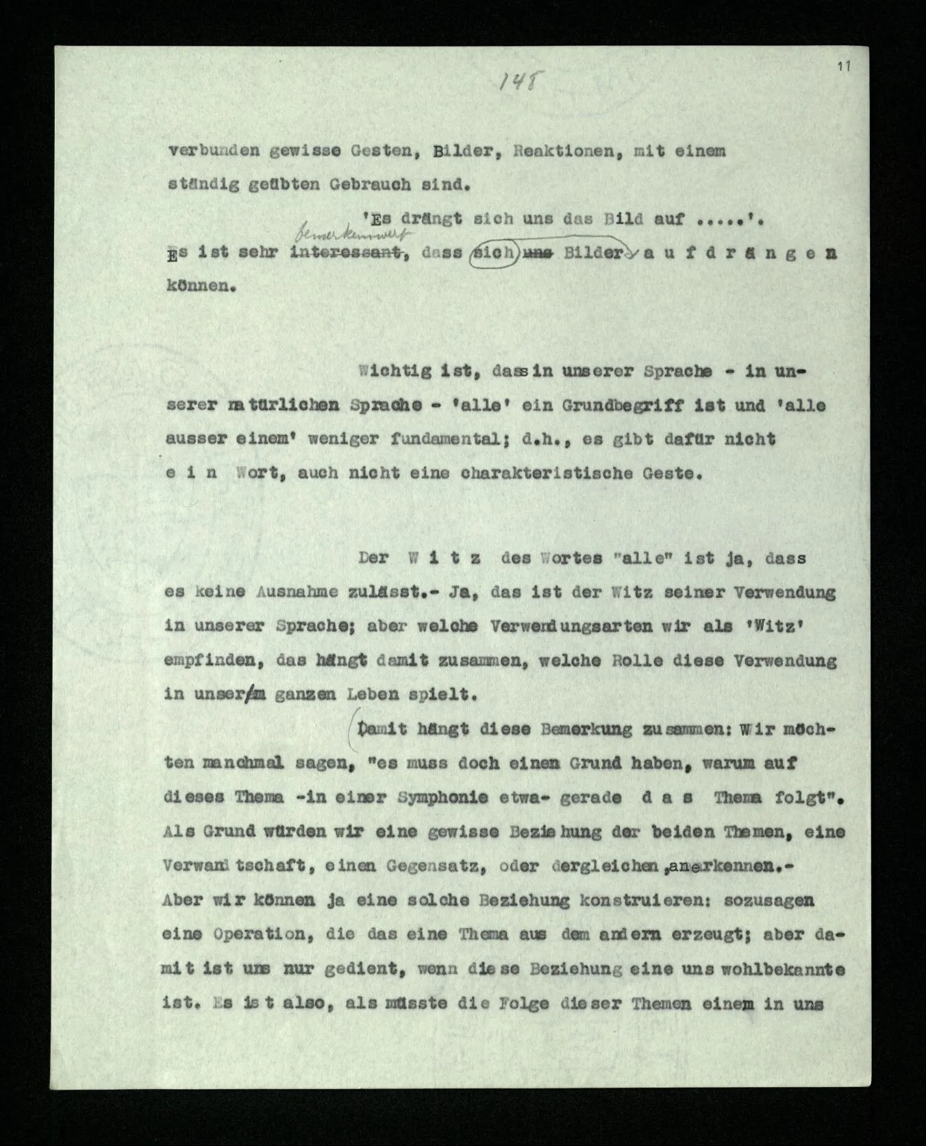 Der Witz des Wortes “alle” ist ja, daß es keine Ausnahme zuläßt. – Ja, das ist der Witz seiner Verwendung in unserer Sprache; aber welche Verwendungsarten wir als ‘Witz’ empfinden, das hängt damit zusammen, welche Rolle diese Verwendung in unserm ganzen Leben spielt. (Damit hängt diese Bemerkung zusammen: Wir möchten manchmal sagen, “es muß doch einen Grund haben, warum auf dieses Thema – in einer Symphonie etwa – gerade das Thema folgt”. Als Grund würden wir eine gewisse Beziehung der beiden Themen, eine Verwandtschaft, einen Gegensatz, oder dergleichen, anerkennen. – Aber wir können ja eine solche Beziehung konstruieren: sozusagen eine Operation, die das eine Thema aus dem andern erzeugt; aber damit ist uns nur gedient, wenn diese Beziehung eine uns wohlbekannte ist. Es ist also, als müßte die Folge dieser Themen einem in uns schon vorhandenen Paradigma entsprechen. Von einem Gemälde, das zwei menschliche Gestalten zeigt, könnte man ähnlich sagen: “Es muß einen Grund haben, warum gerade diese zwei Gesichter uns einen solchen Eindruck machen.” Wir möchten – heißt das – diesen Eindruck der beiden Gesichter wo anders wieder finden – in einem anderen Gebiet. – Aber ob er wieder zu finden ist? Man könnte auch fragen: Welche Zusammenstellung von Themen hat eine Pointe, welche keine? Oder: Warum hat diese Zusammenstellung eine Pointe und die keine? Das mag nicht leicht zu sagen sein! Oft können wir sagen: “Diese entspricht einer Geste, diese nicht.”)