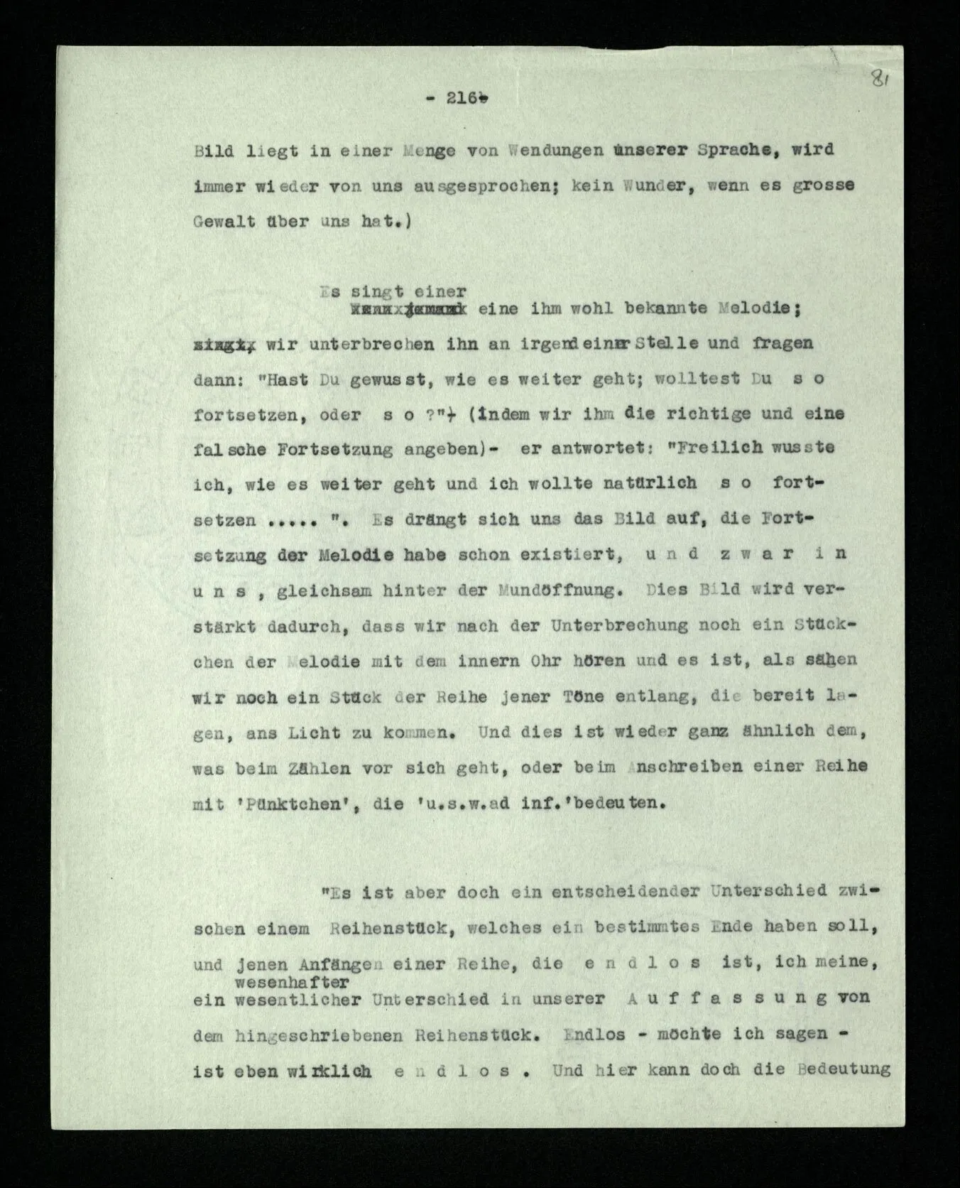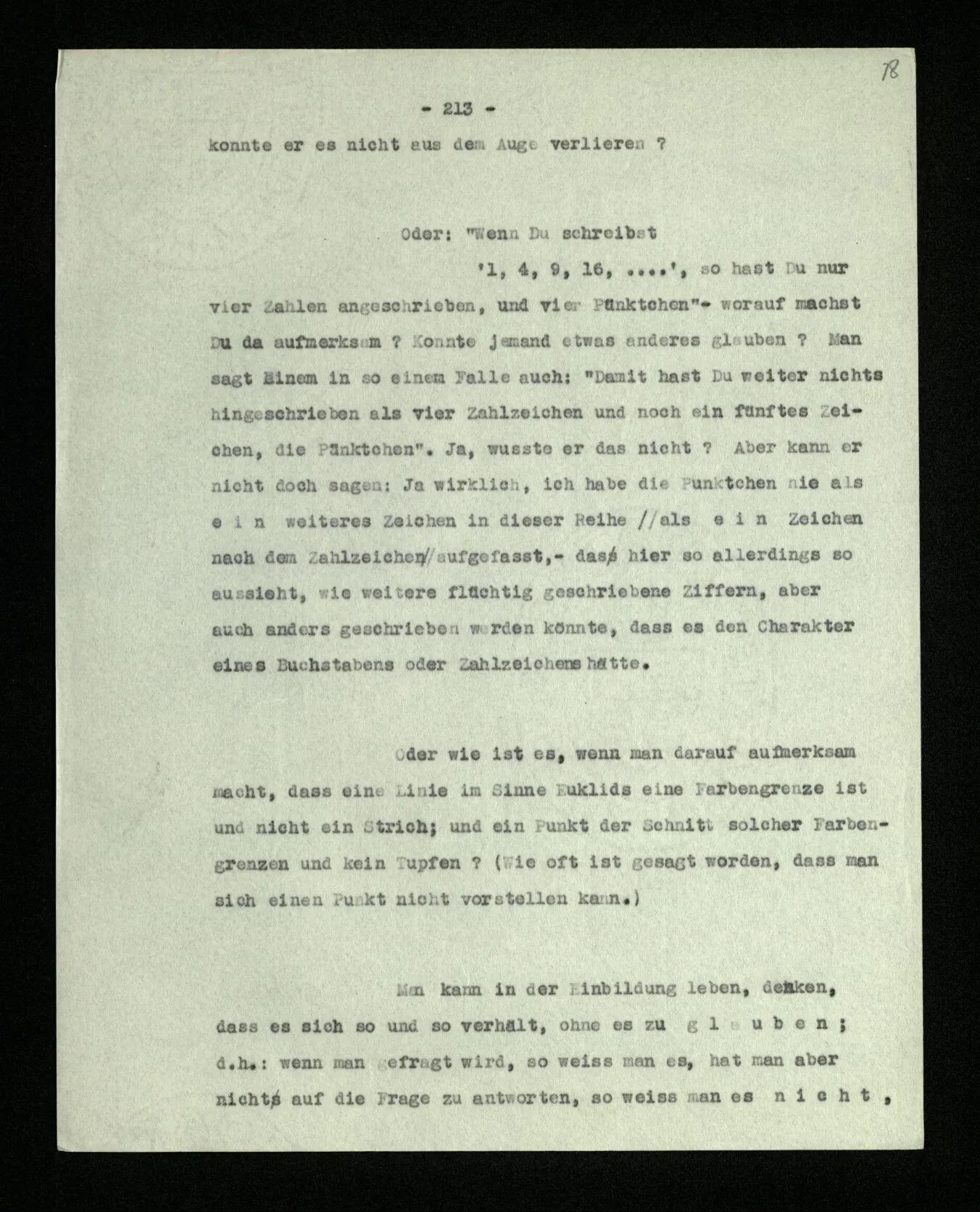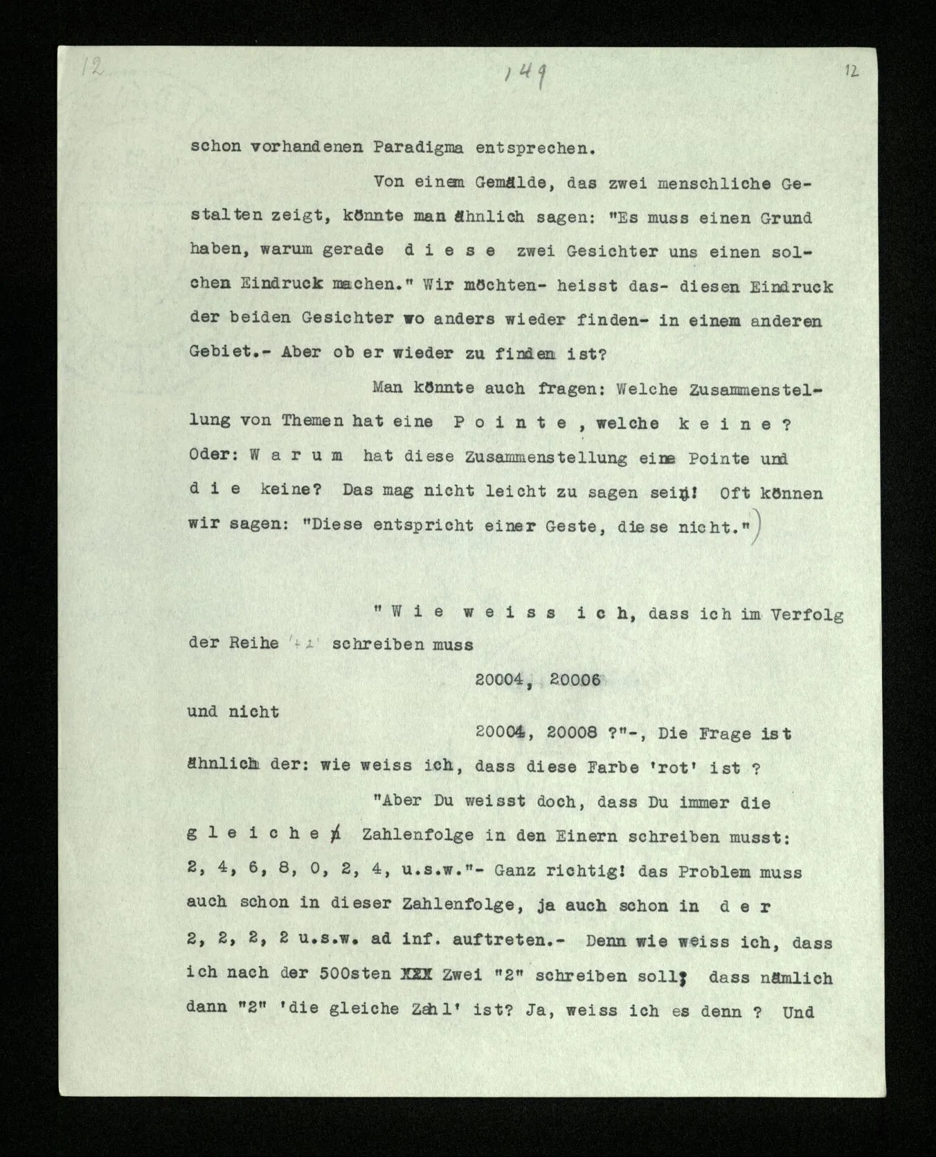 Die Frage ist ähnlich der: wie weiß ich, daß diese Farbe ‘rot’ ist? “Aber Du weißt doch, daß Du immer die gleiche Zahlenfolge in den Einern schreiben mußt: 2, 4, 6, 8, 0, 2, 4, u.s.w.” – Ganz richtig! das Problem muß auch schon in dieser Zahlenfolge, ja auch schon in der 2, 2, 2, 2 u.s.w. ad inf. auftreten. – Denn wie weiß ich, daß ich nach der 500sten Zwei “2” schreiben soll; daß nämlich dann “2” ‘die gleiche Zahl’ ist? Ja, weiß ich es denn? Und wenn ich es zuvor weiß, was hilft mir dieses Wissen für später? Ich meine: wie weiß ich dann, wenn der Schritt wirklich zu machen ist, was ich mit diesem Wissen anzufangen habe? Wenn zur Fortsetzung der Reihe eine Intuition nötig ist, dann auch zur Fortsetzung der Reihe .