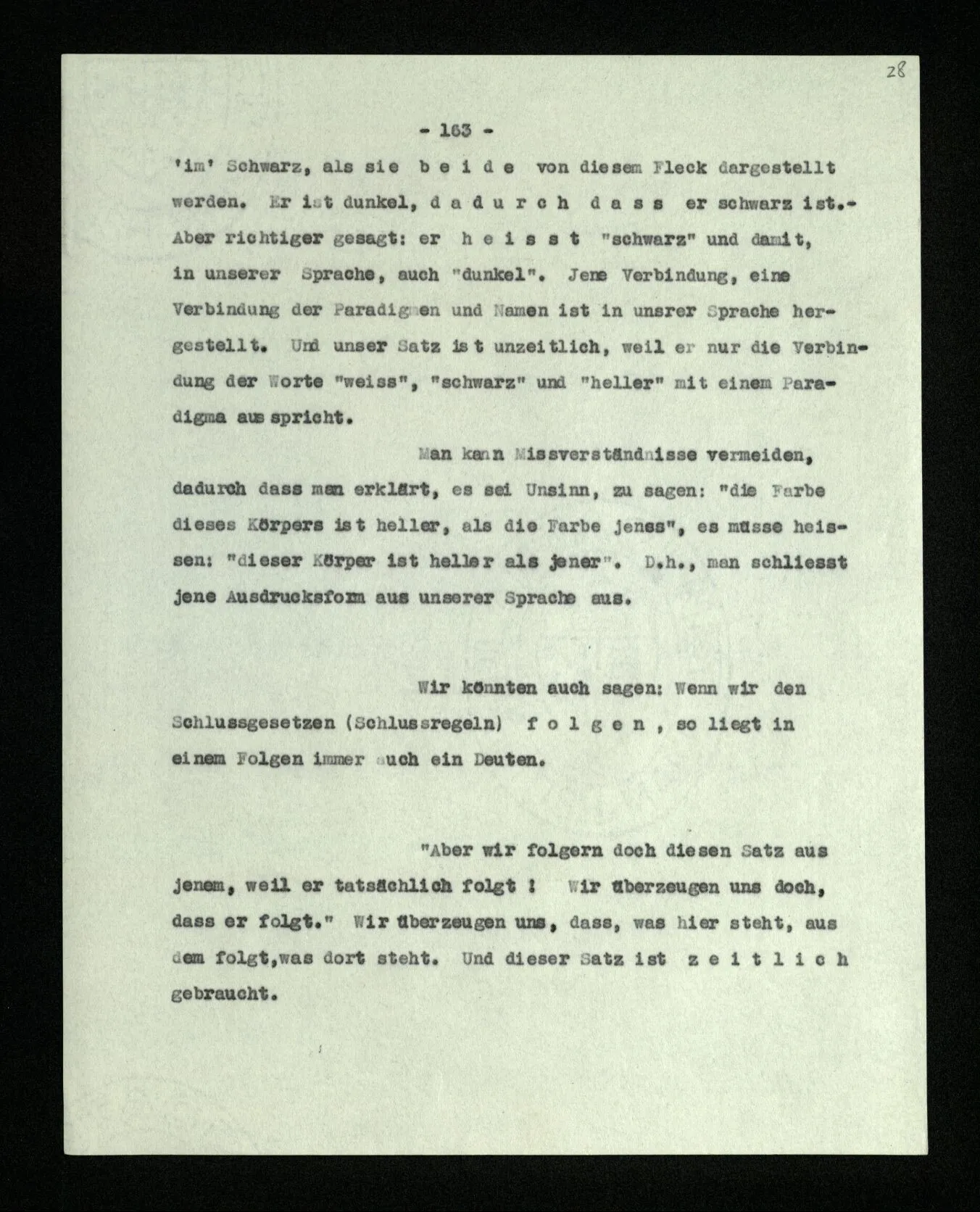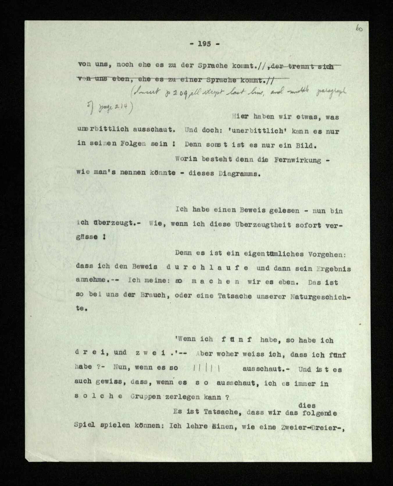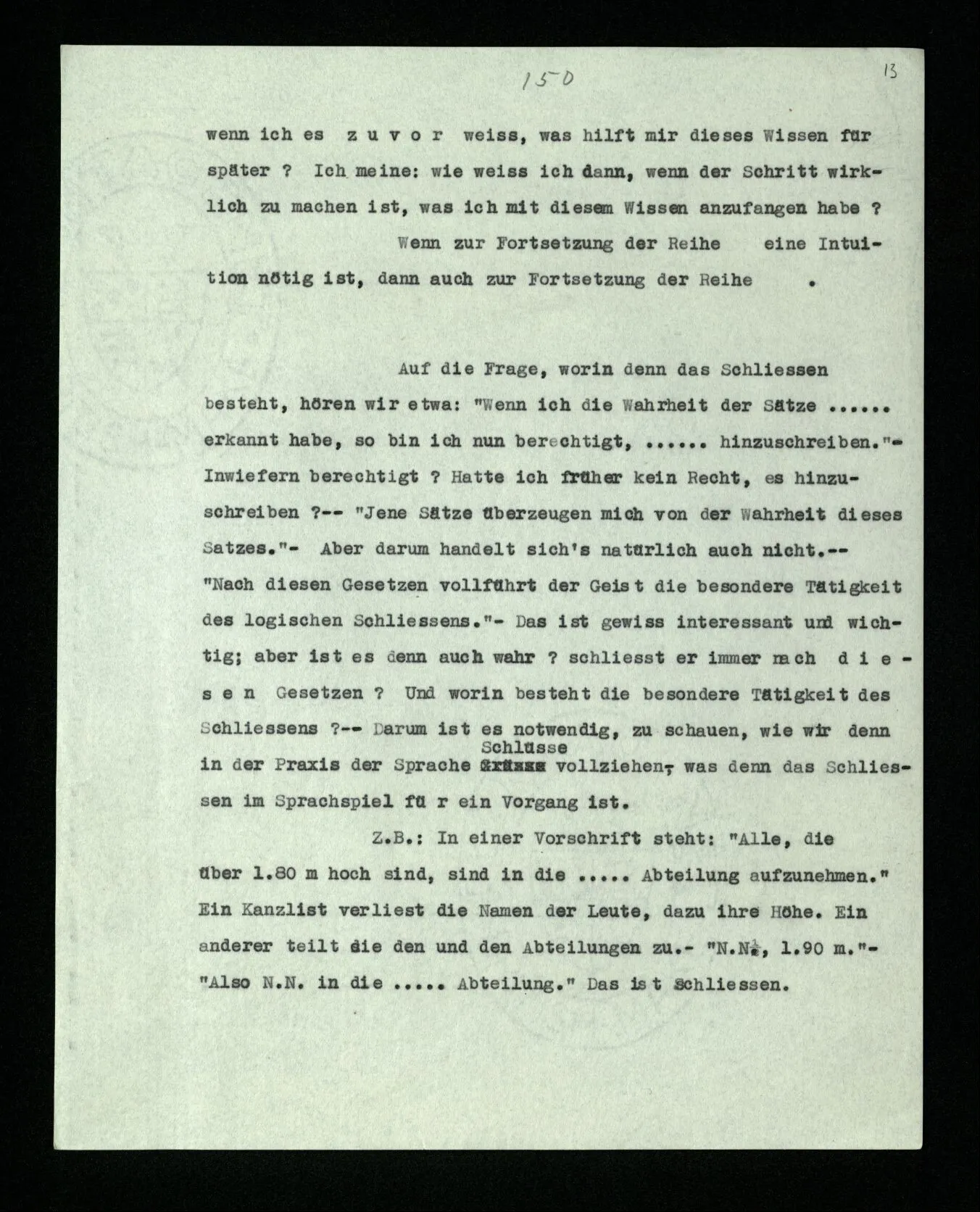 Auf die Frage, worin denn das Schließen besteht, hören wir etwa: “Wenn ich die Wahrheit der Sätze ‥‥‥ erkannt habe, so bin ich nun berechtigt, ‥‥‥ hinzuschreiben.” – Inwiefern berechtigt? Hatte ich früher kein Recht, es hinzuschreiben? ‒ ‒ “Jene Sätze überzeugen mich von der Wahrheit dieses Satzes.” – Aber darum handelt sich’s natürlich auch nicht. ‒ ‒ “Nach diesen Gesetzen vollführt der Geist die besondere Tätigkeit des logischen Schließens.” – Das ist gewiß interessant und wichtig; aber ist es denn auch wahr? schließt er immer nach diesen Gesetzen? Und worin besteht die besondere Tätigkeit des Schließens? ‒ ‒ Darum ist es notwendig, zu schauen, wie wir denn in der Praxis der Sprache Schlüsse vollziehen, – was denn das Schließen im Sprachspiel für ein Vorgang ist. Z.B.: In einer Vorschrift steht: “Alle, die über 1.80 m hoch sind, sind in die ‥‥․ Abteilung aufzunehmen.” Ein Kanzlist verliest die Namen der Leute, dazu ihre Höhe. Ein anderer teilt sie den und den Abteilungen zu. – N.N., 1.90 m. – “Also N.N. in die ‥‥․ Abteilung.” Das ist Schließen.