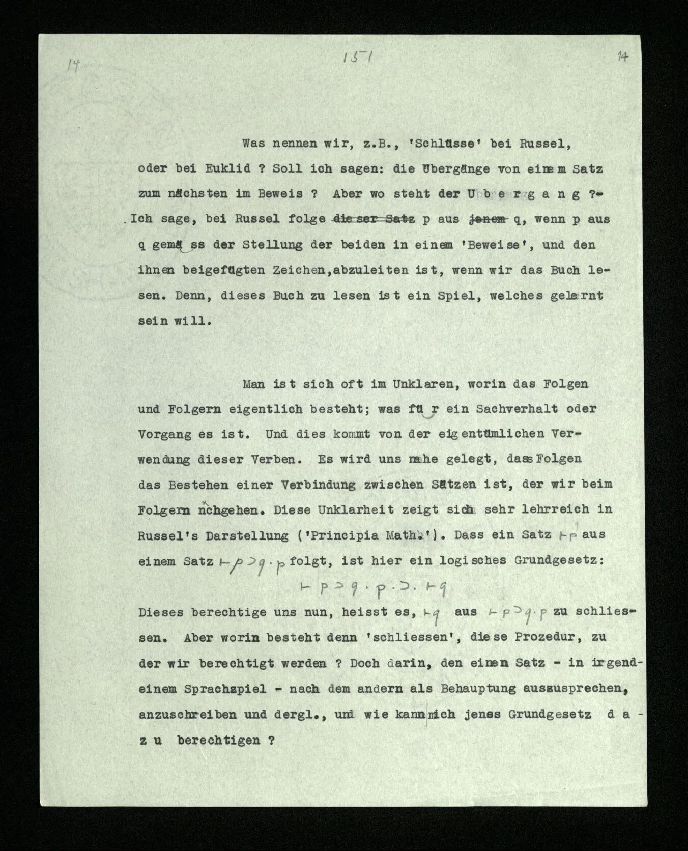 Man ist sich oft im Unklaren, worin das Folgen und Folgern eigentlich besteht; was für ein Sachverhalt oder Vorgang es ist. Und dies kommt von der eigentümlichen Verwendung dieser Verben. Es wird uns nahe gelegt, daß Folgen das Bestehen einer Verbindung zwischen Sätzen ist, der wir beim Folgern nachgehen. Diese Unklarheit zeigt sich sehr lehrreich in Russell’s Darstellung (‘Principia Mathematica’). Daß ein Satz ⊢p aus einem Satz ⊢p⊃q.p folgt, ist hier ein logisches Grundgesetz: