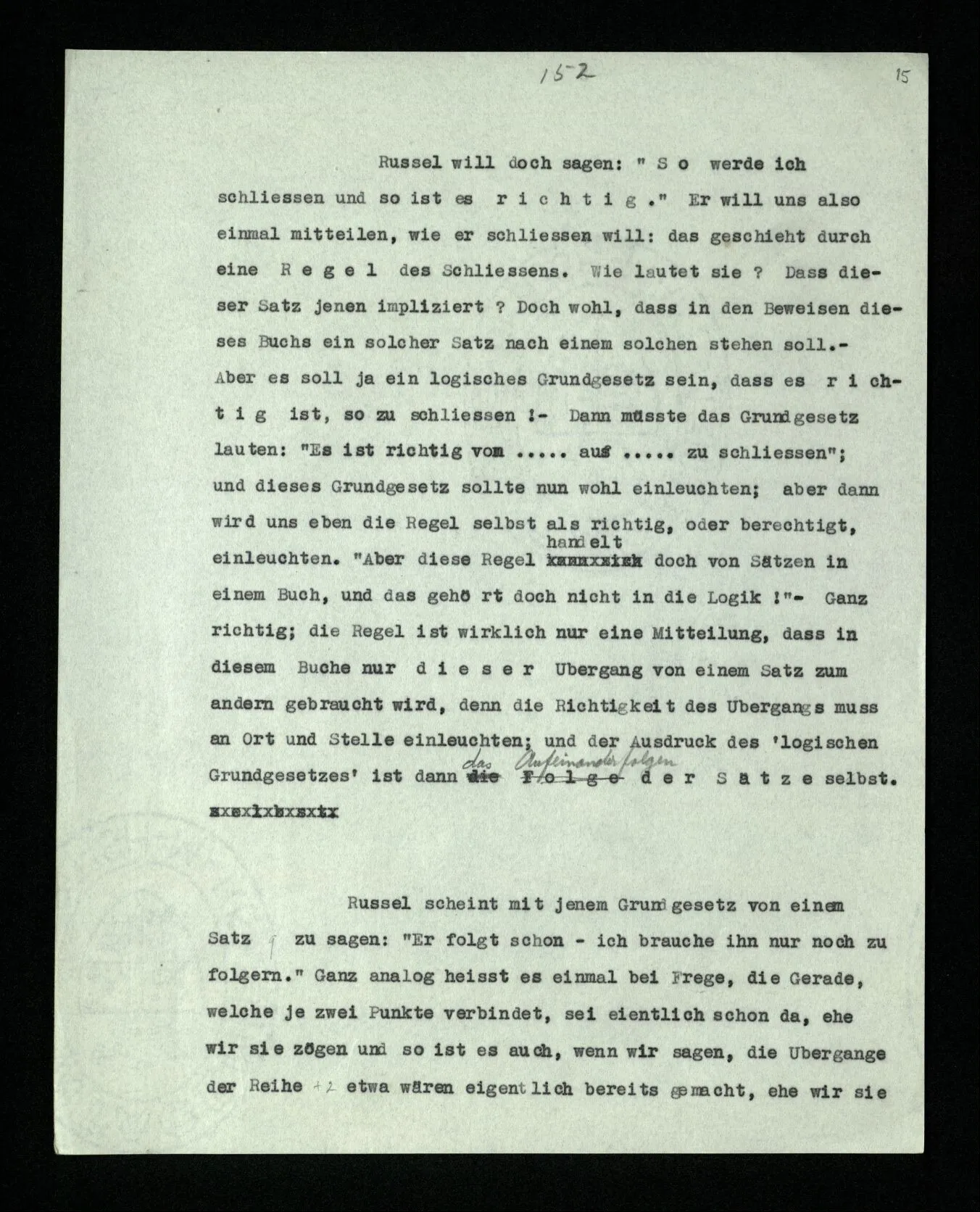 Russell scheint mit jenem Grundgesetz von einem Satz q zu sagen: “Er folgt schon – ich brauche ihn nur noch zu folgern.” Ganz analog heißt es einmal bei Frege, die Gerade, welche je zwei Punkte verbindet, sei eigentlich schon da, ehe wir sie zögen und so ist es auch, wenn wir sagen, die Übergänge der Reihe +2 etwa wären eigentlich bereits gemacht, ehe wir sie mündlich oder schriftlich machen, – gleichsam nachzögen.