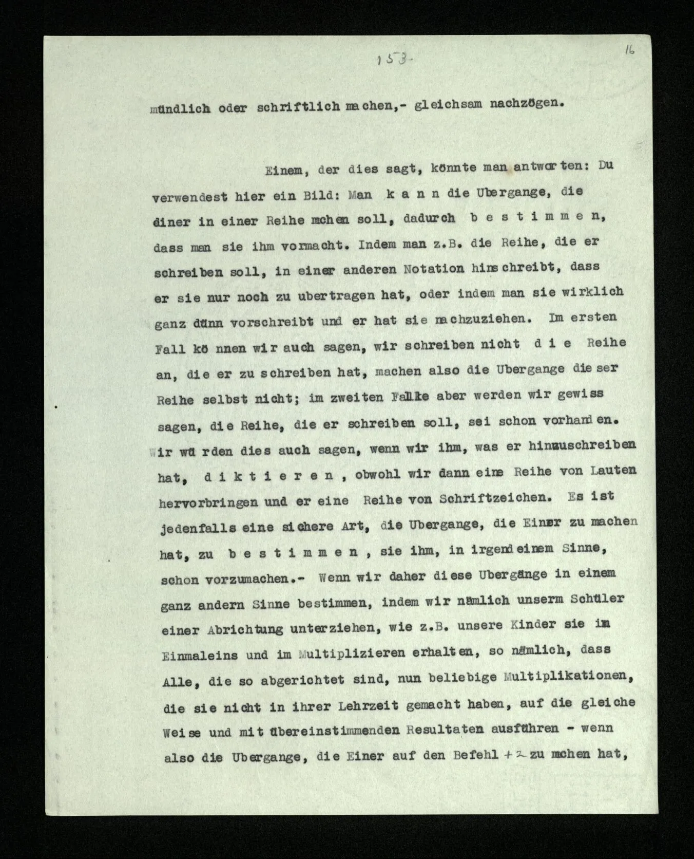 Einem, der dies sagt, könnte man antworten: Du verwendest hier ein Bild: Man kann die Übergänge, die einer in einer Reihe machen soll, dadurch bestimmen, daß man sie ihm vormacht. Indem man z.B. die Reihe, die er schreiben soll, in einer anderen Notation hinschreibt, daß er sie nur noch zu übertragen hat, oder indem man sie wirklich ganz dünn vorschreibt und er hat sie nachzuziehen. Im ersten Fall können wir auch sagen, wir schreiben nicht die Reihe an, die er zu schreiben hat, machen also die Übergänge dieser Reihe selbst nicht; im zweiten Falle aber werden wir gewiß sagen, die Reihe, die er schreiben soll, sei schon vorhanden. Wir würden dies auch sagen, wenn wir ihm, was er hinzuschreiben hat, diktieren, obwohl wir dann eine Reihe von Lauten hervorbringen und er eine Reihe von Schriftzeichen. Es ist jedenfalls eine sichere Art, die Übergänge, die Einer zu machen hat, zu bestimmen, sie ihm, in irgendeinem Sinne, schon vorzumachen. – Wenn wir daher diese Übergänge in einem ganz andern Sinne bestimmen, indem wir nämlich unsern Schüler einer Abrichtung unterziehen, wie z.B. unsere Kinder sie im Einmaleins und im Multiplizieren erhalten, so nämlich, daß Alle, die so abgerichtet sind, nun beliebige Multiplikationen, die sie nicht in ihrer Lehrzeit gemacht haben, auf die gleiche Weise und mit übereinstimmenden Resultaten ausführen – wenn also die Übergänge, die Einer auf den Befehl +2 zu machen hat, durch Abrichtung so bestimmt sind, daß wir mit Sicherheit voraussagen können, wie er gehen wird, auch wenn er diesen Übergang bis jetzt noch nie gemacht hat, – dann kann es uns natürlich sein, als Bild dieses Sachverhalts den zu gebrauchen: die Übergänge seien bereits alle gemacht, er schriebe sie nur noch hin.