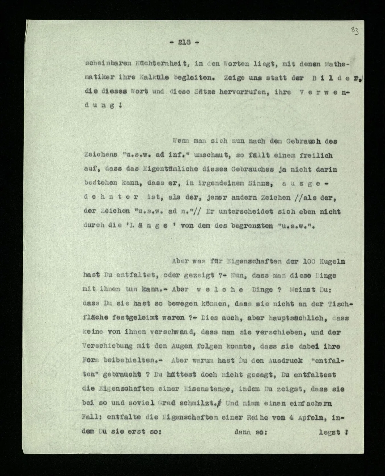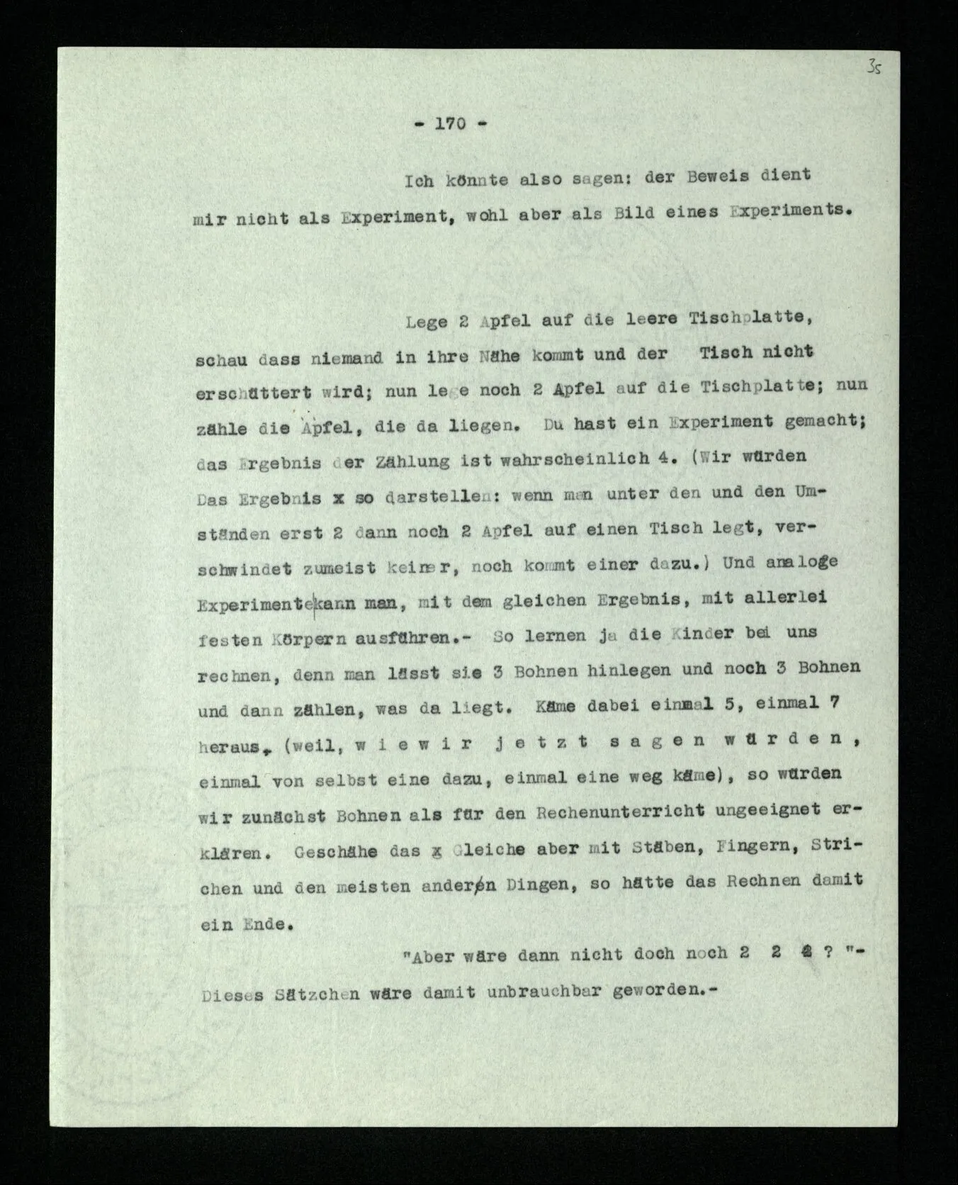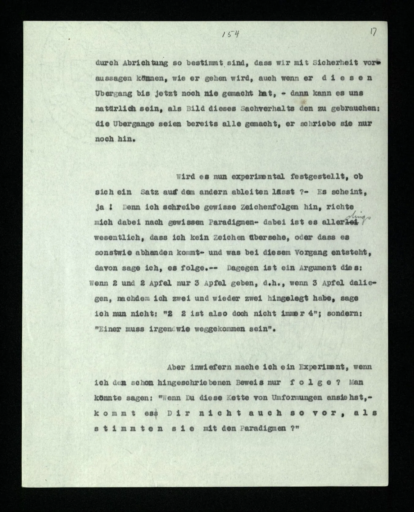 Wird es nun experimentell festgestellt, ob sich ein Satz aus dem andern ableiten läßt? – Es scheint, ja! Denn ich schreibe gewisse Zeichenfolgen hin, richte mich dabei nach gewissen Paradigmen – dabei ist es allerdings wesentlich, daß ich kein Zeichen übersehe, oder daß es sonstwie abhanden kommt – und was bei diesem Vorgang entsteht, davon sage ich, es folge. ‒ ‒ Dagegen ist ein Argument dies: Wenn 2 und 2 Äpfel nur 3 Äpfel geben, d.h., wenn 3 Äpfel daliegen, nachdem ich zwei und wieder zwei hingelegt habe, sage ich nun nicht: “2 + 2 ist also doch nicht immer 4”; sondern: “Einer muß irgendwie weggekommen sein”.