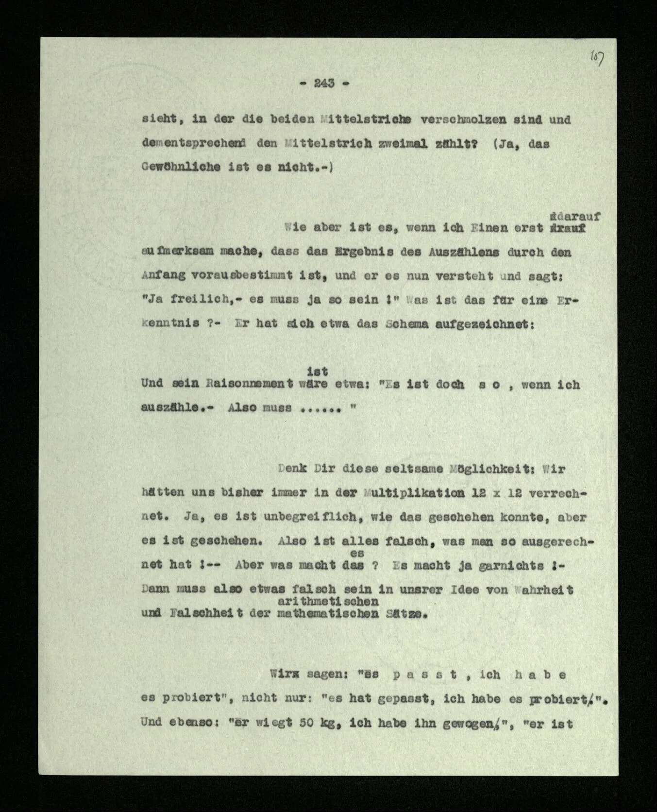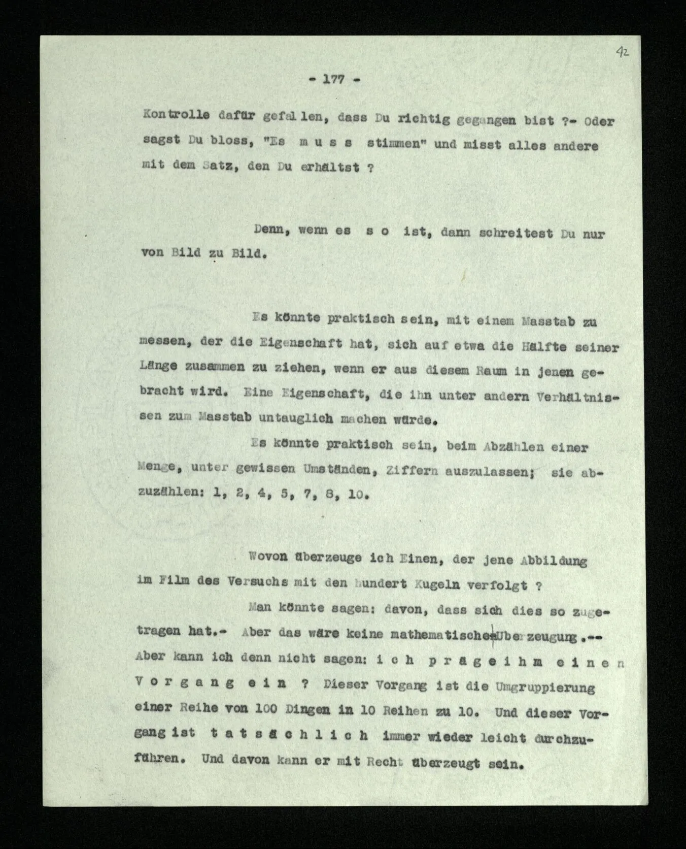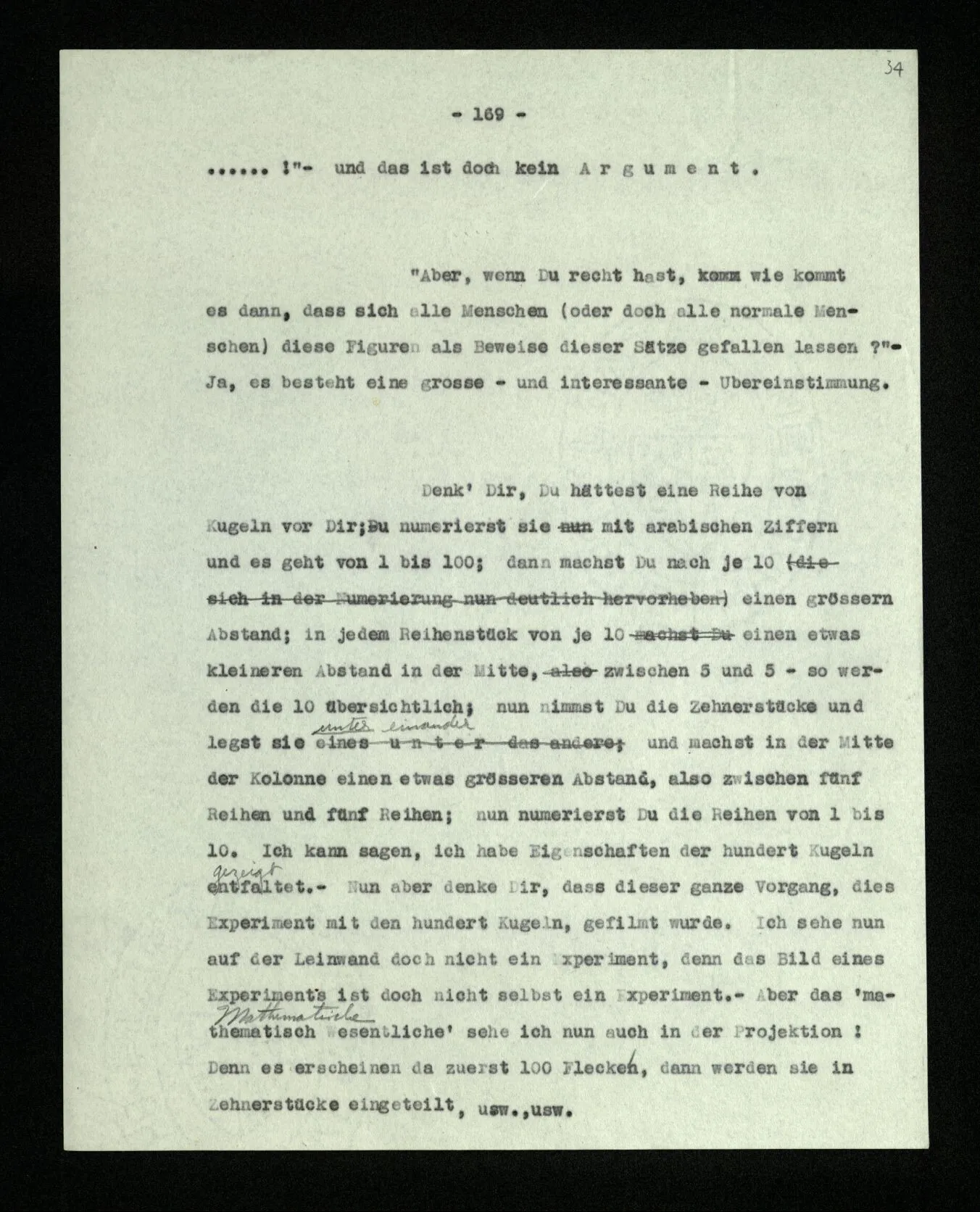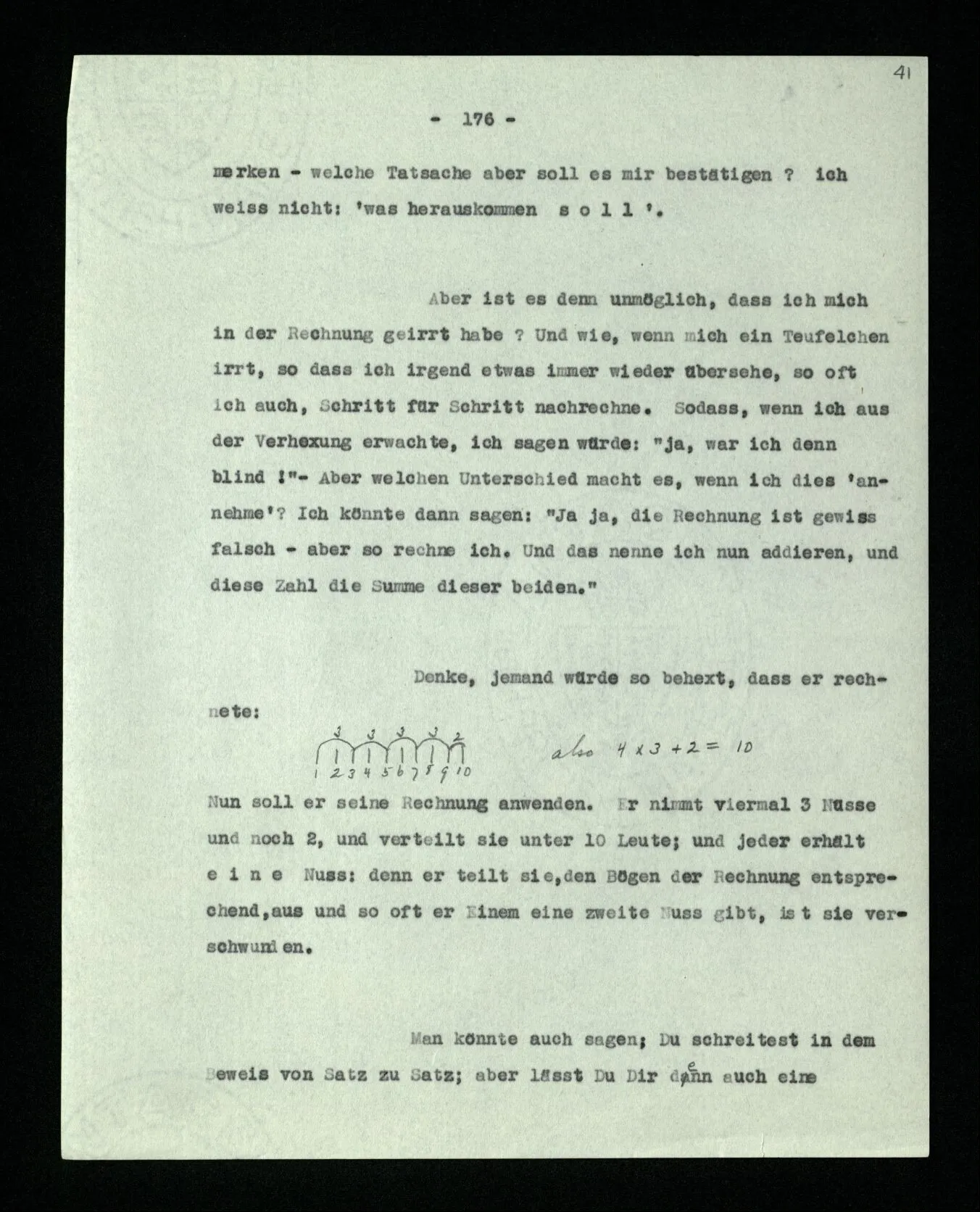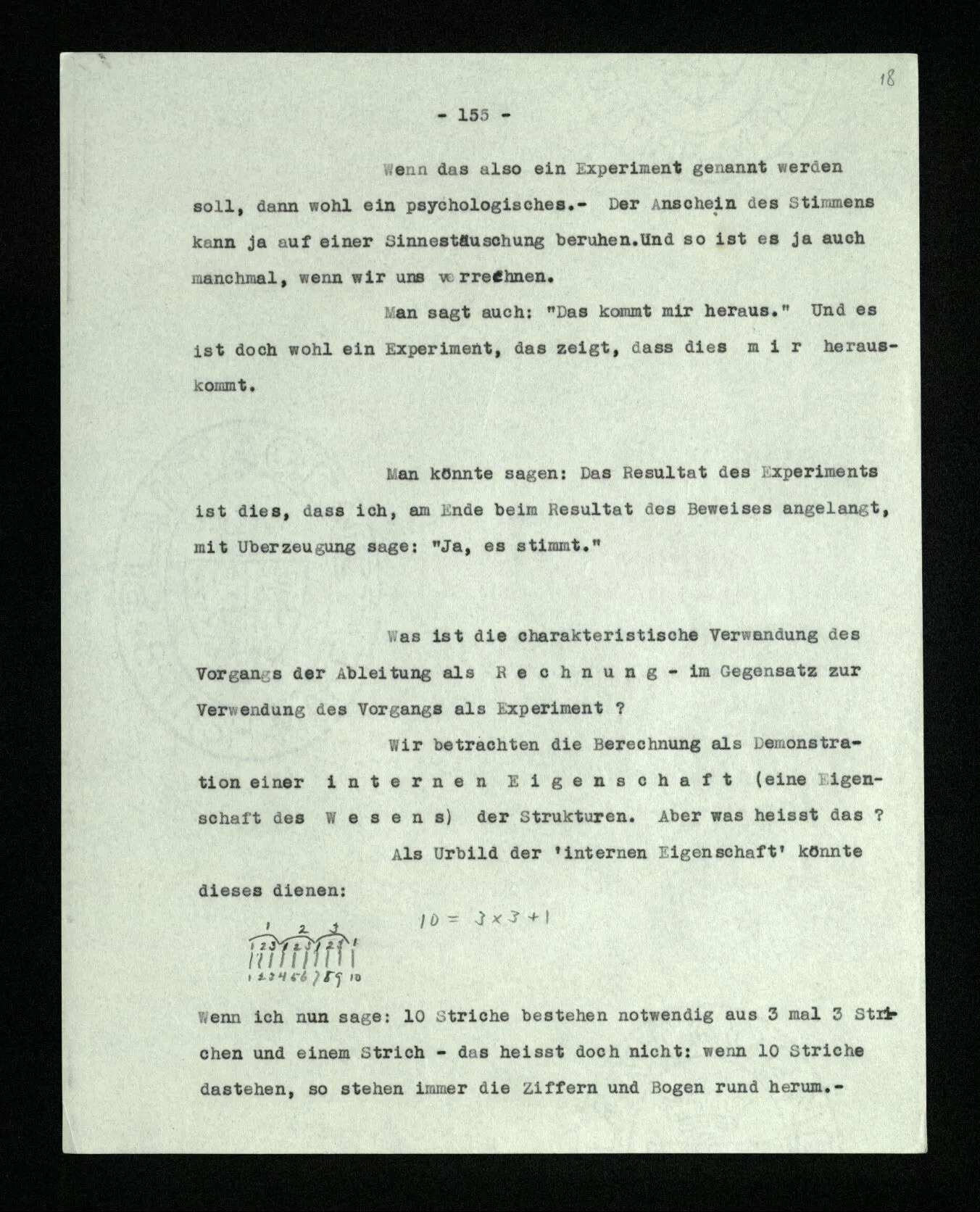 Wenn ich nun sage: 10 Striche bestehen notwendig aus 3 mal 3 Strichen und einem Strich – das heißt doch nicht: wenn 10 Striche dastehen, so stehen immer die Ziffern und Bogen rund herum. – Setze ich sie aber zu den Strichen hinzu, so sage ich, ich demonstrierte nur das Wesen jener Gruppe von Strichen. – Aber bist Du sicher, daß sich die Gruppe beim Dazuschreiben jener Zeichen nicht verändert hat? – “Ich weiß nicht; aber eine bestimmte Zahl von Strichen stand da; und wenn nicht 10, so eine andre und dann hatte die eben andre Eigenschaften. –”