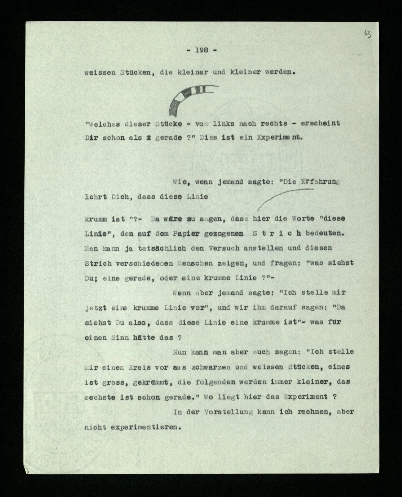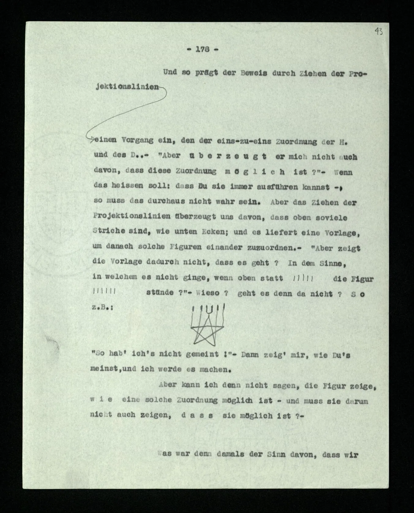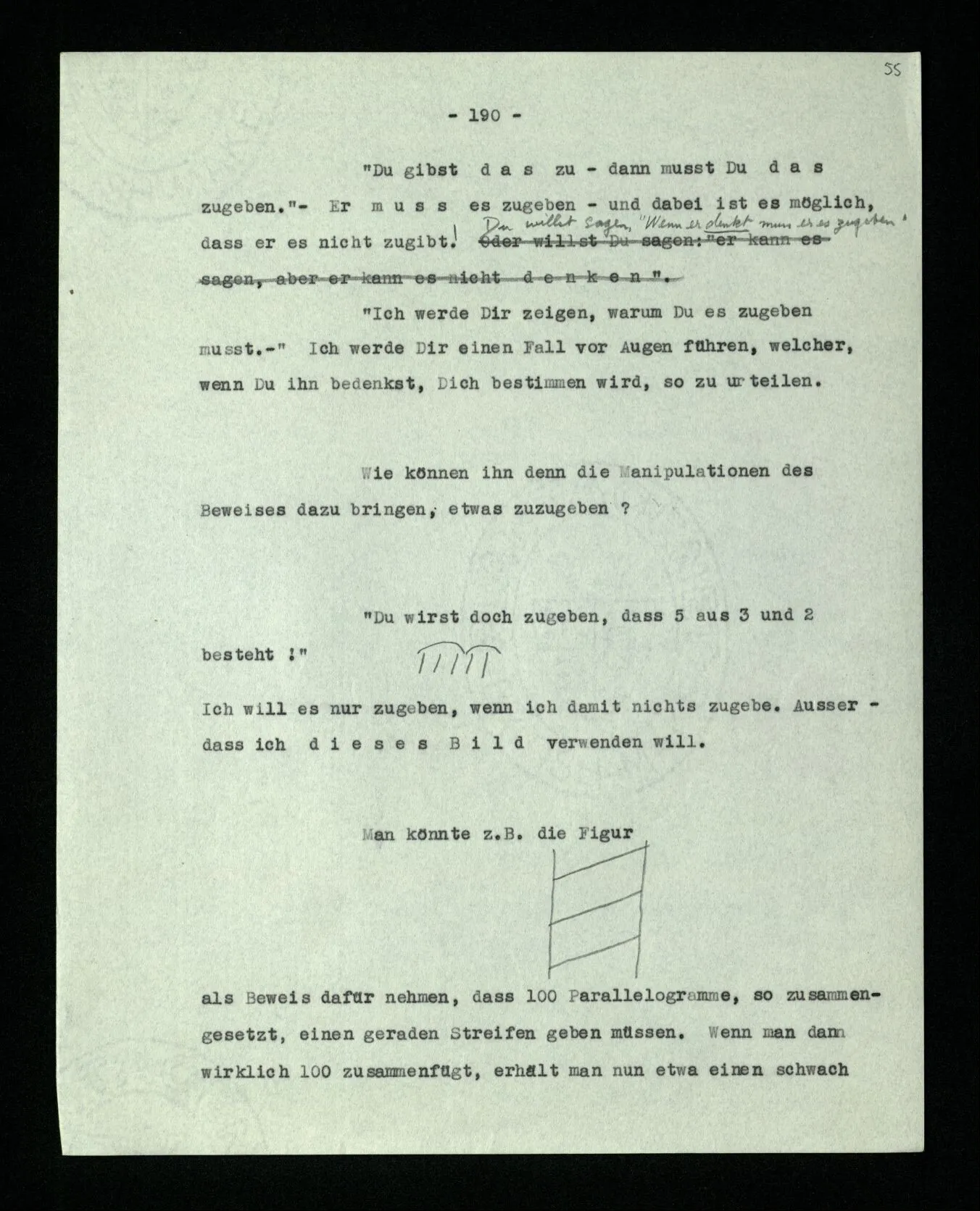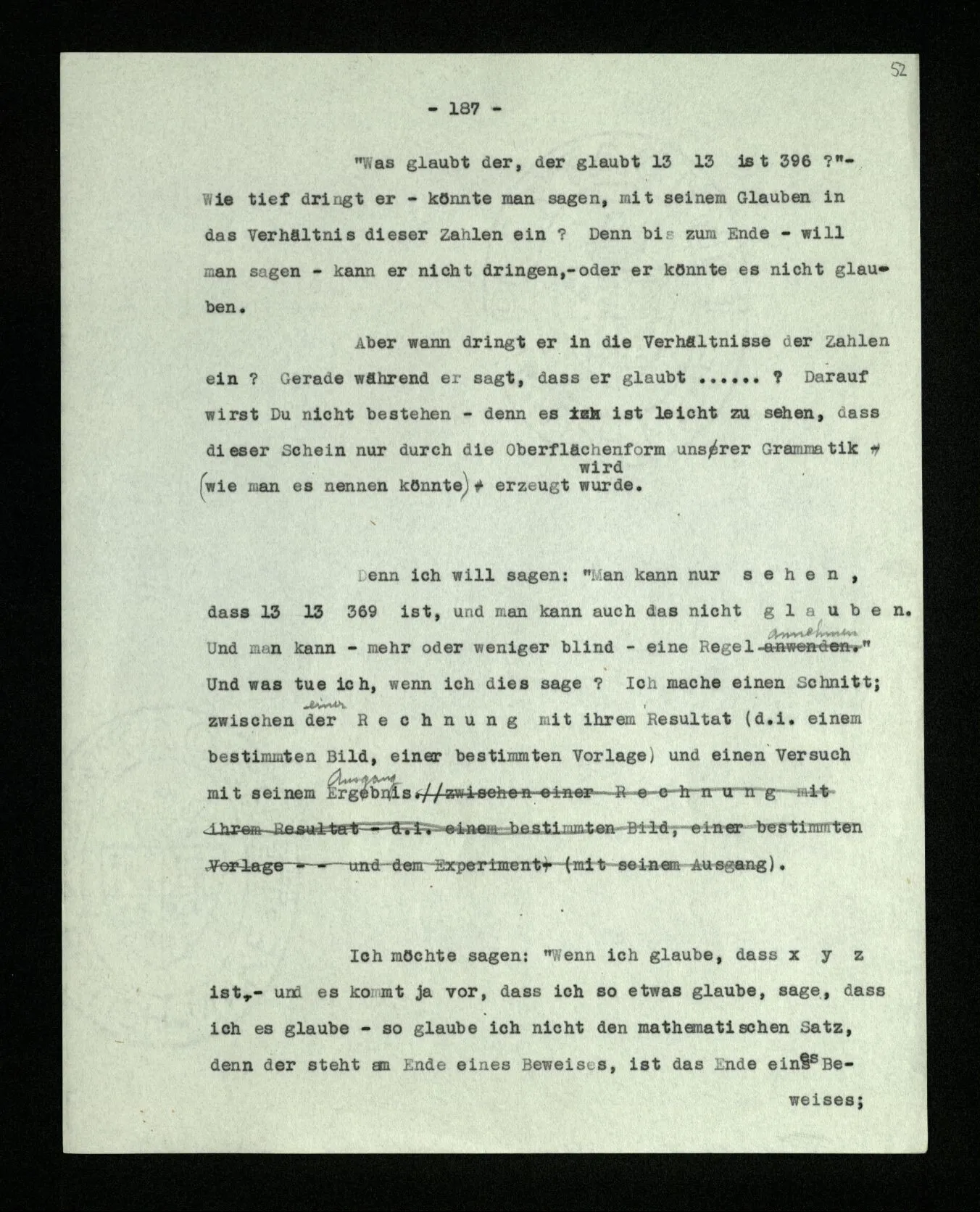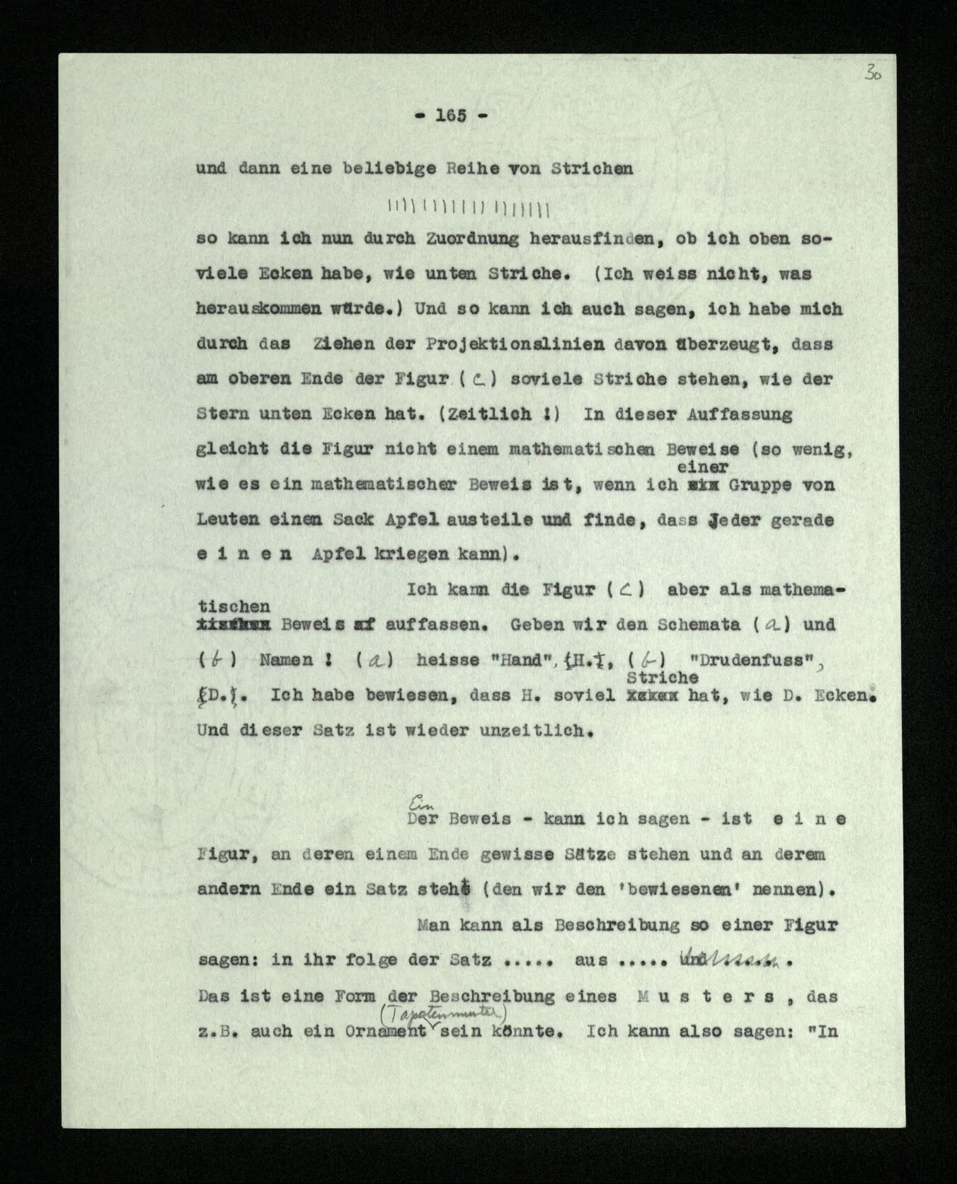 Wenn ich nun sage: 10 Striche bestehen notwendig aus 3 mal 3 Strichen und einem Strich – das heißt doch nicht: wenn 10 Striche dastehen, so stehen immer die Ziffern und Bogen rund herum. – Setze ich sie aber zu den Strichen hinzu, so sage ich, ich demonstrierte nur das Wesen jener Gruppe von Strichen. – Aber bist Du sicher, daß sich die Gruppe beim Dazuschreiben jener Zeichen nicht verändert hat? – “Ich weiß nicht; aber eine bestimmte Zahl von Strichen stand da; und wenn nicht 10, so eine andre und dann hatte die eben andre Eigenschaften. –”
