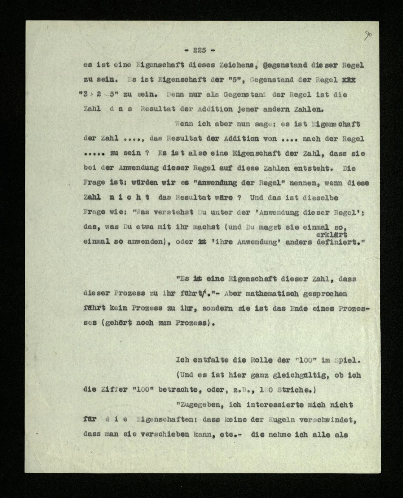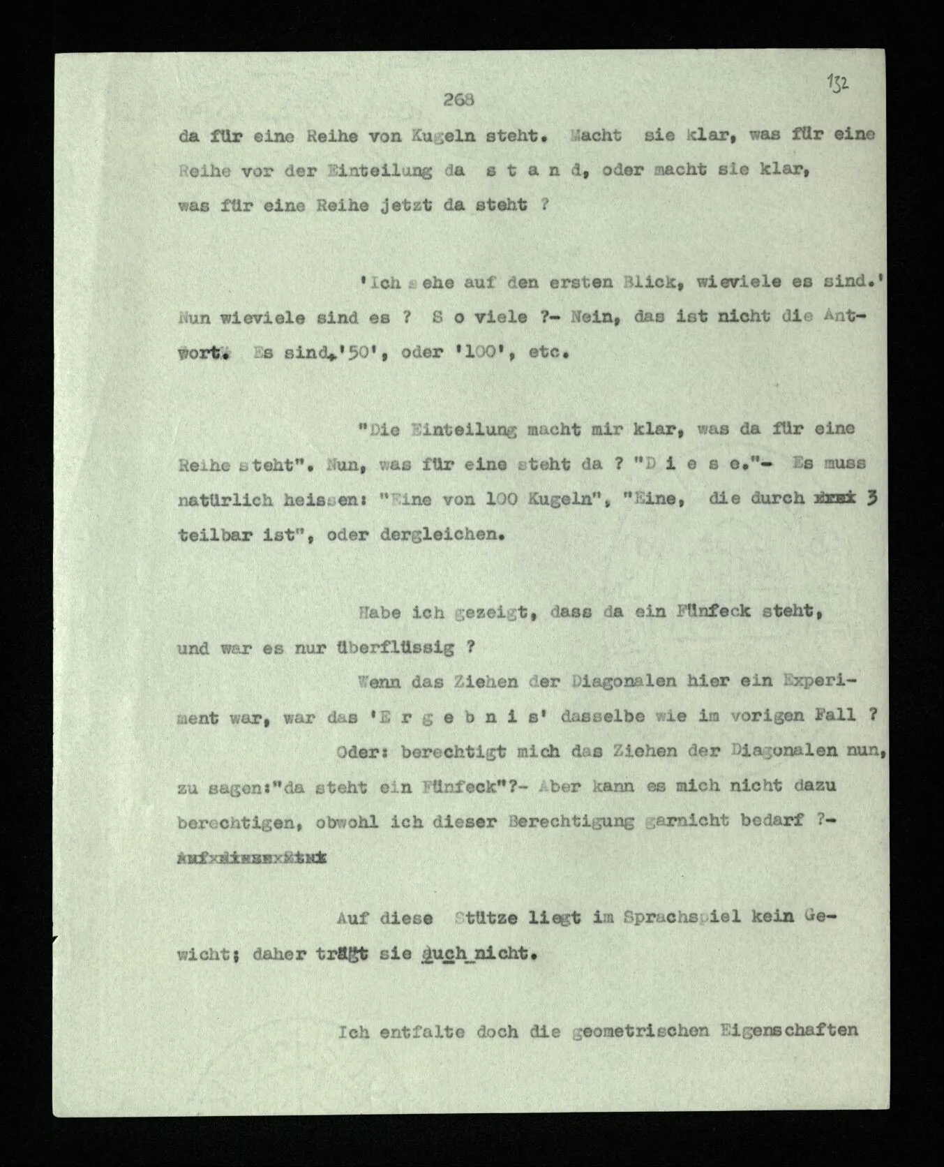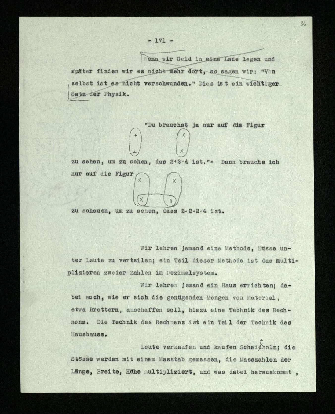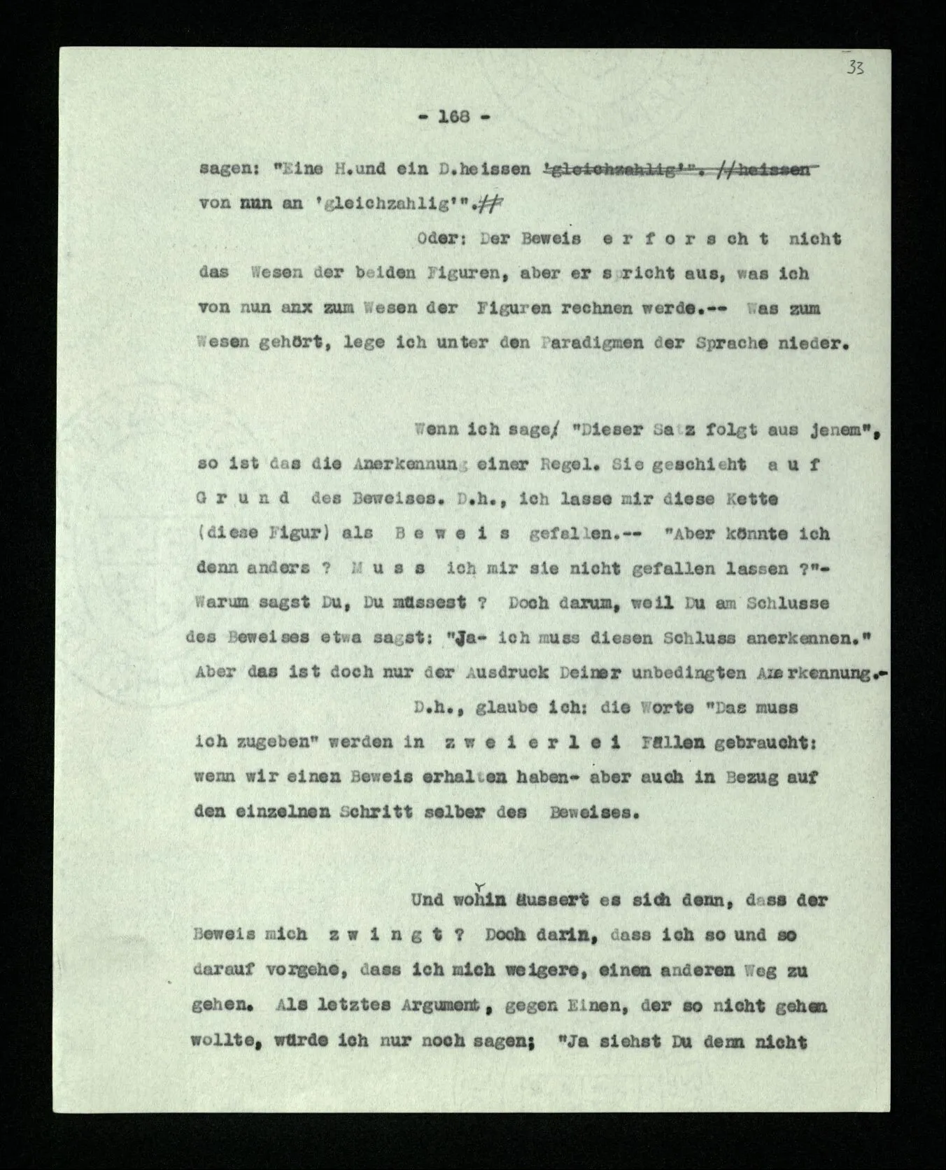 Wenn ich nun sage: 10 Striche bestehen notwendig aus 3 mal 3 Strichen und einem Strich – das heißt doch nicht: wenn 10 Striche dastehen, so stehen immer die Ziffern und Bogen rund herum. – Setze ich sie aber zu den Strichen hinzu, so sage ich, ich demonstrierte nur das Wesen jener Gruppe von Strichen. – Aber bist Du sicher, daß sich die Gruppe beim Dazuschreiben jener Zeichen nicht verändert hat? – “Ich weiß nicht; aber eine bestimmte Zahl von Strichen stand da; und wenn nicht 10, so eine andre und dann hatte die eben andre Eigenschaften. –”