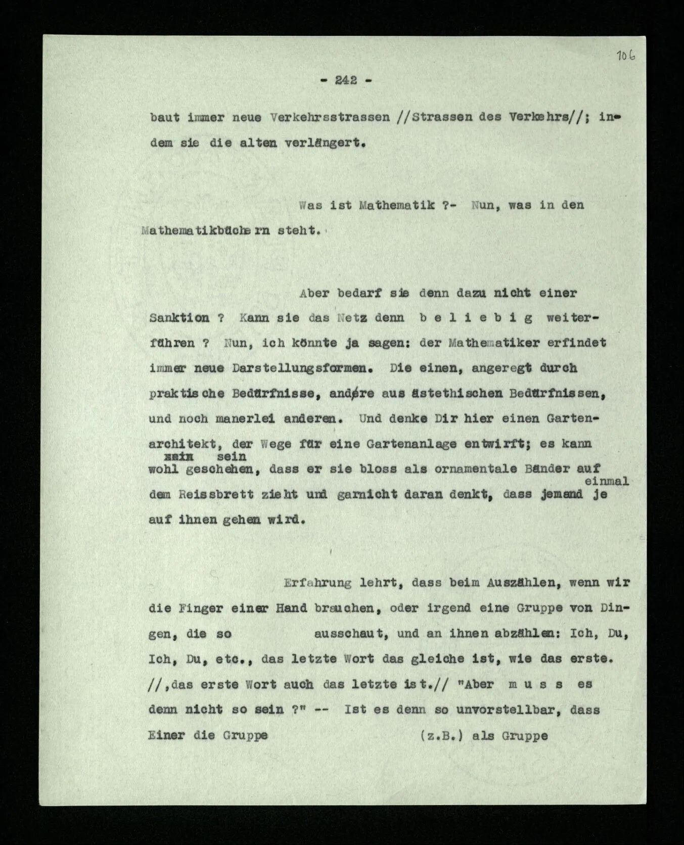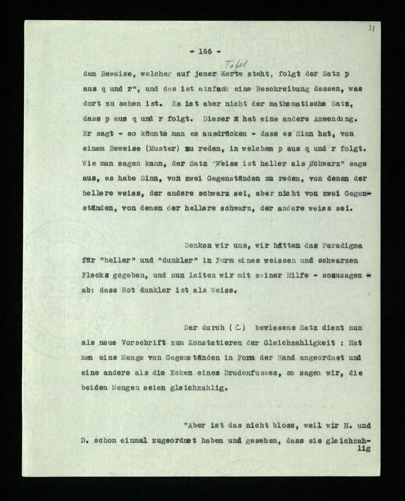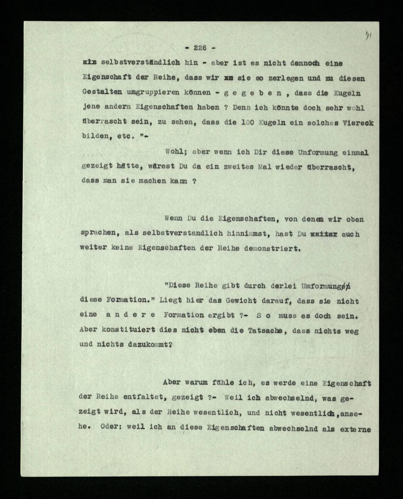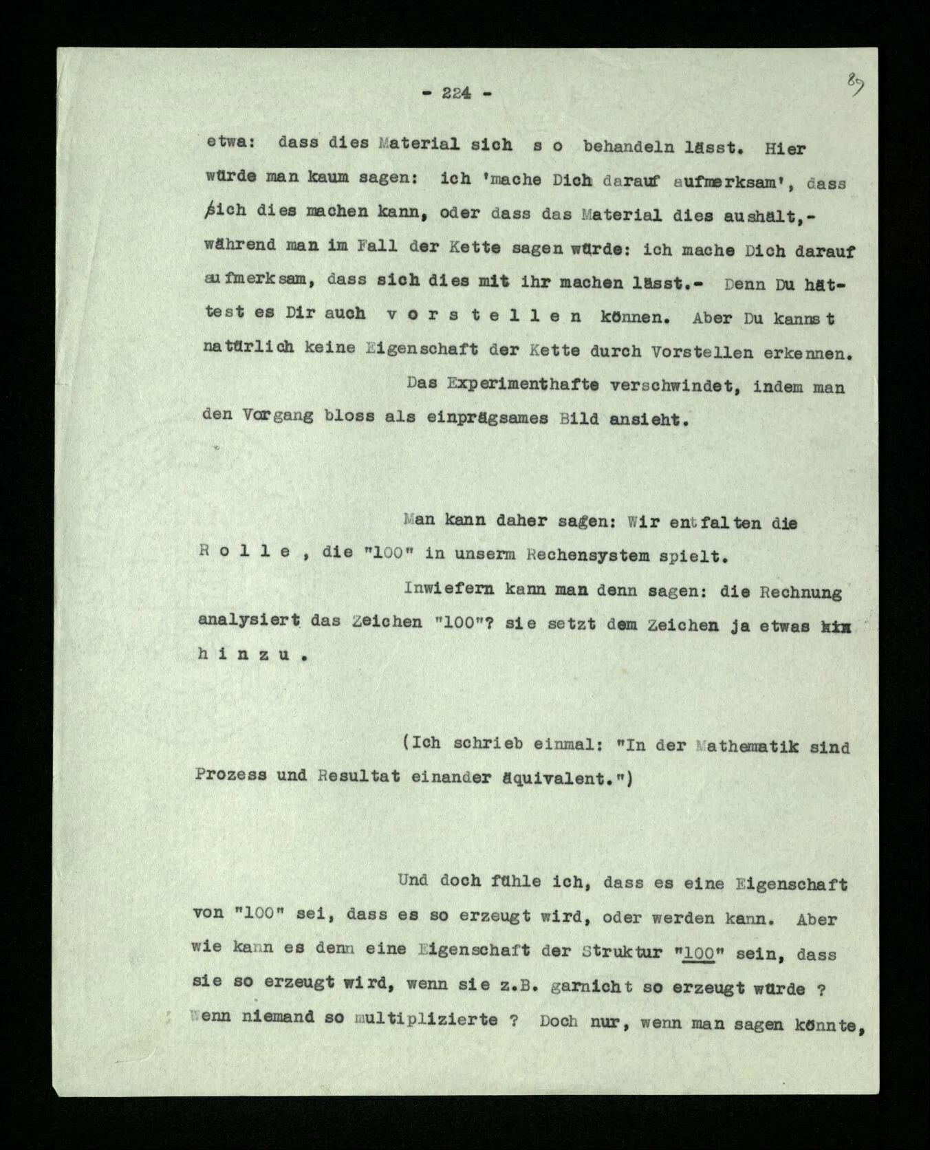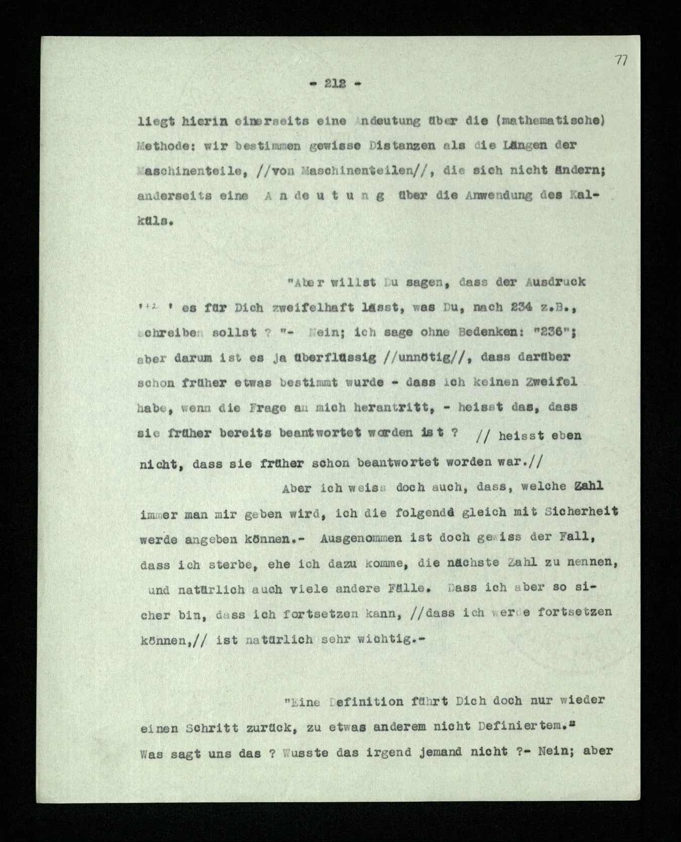 Wenn ich nun sage: 10 Striche bestehen notwendig aus 3 mal 3 Strichen und einem Strich – das heißt doch nicht: wenn 10 Striche dastehen, so stehen immer die Ziffern und Bogen rund herum. – Setze ich sie aber zu den Strichen hinzu, so sage ich, ich demonstrierte nur das Wesen jener Gruppe von Strichen. – Aber bist Du sicher, daß sich die Gruppe beim Dazuschreiben jener Zeichen nicht verändert hat? – “Ich weiß nicht; aber eine bestimmte Zahl von Strichen stand da; und wenn nicht 10, so eine andre und dann hatte die eben andre Eigenschaften. –”
