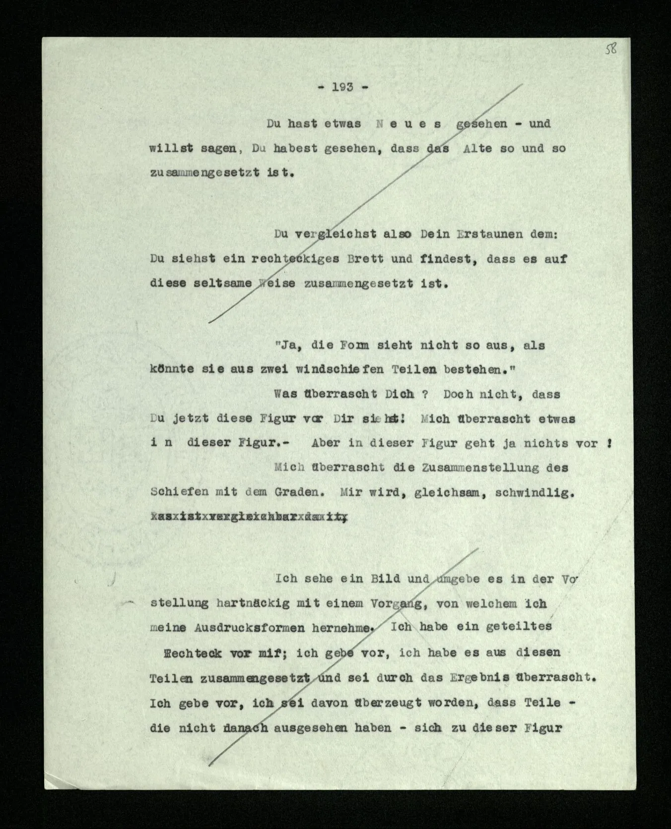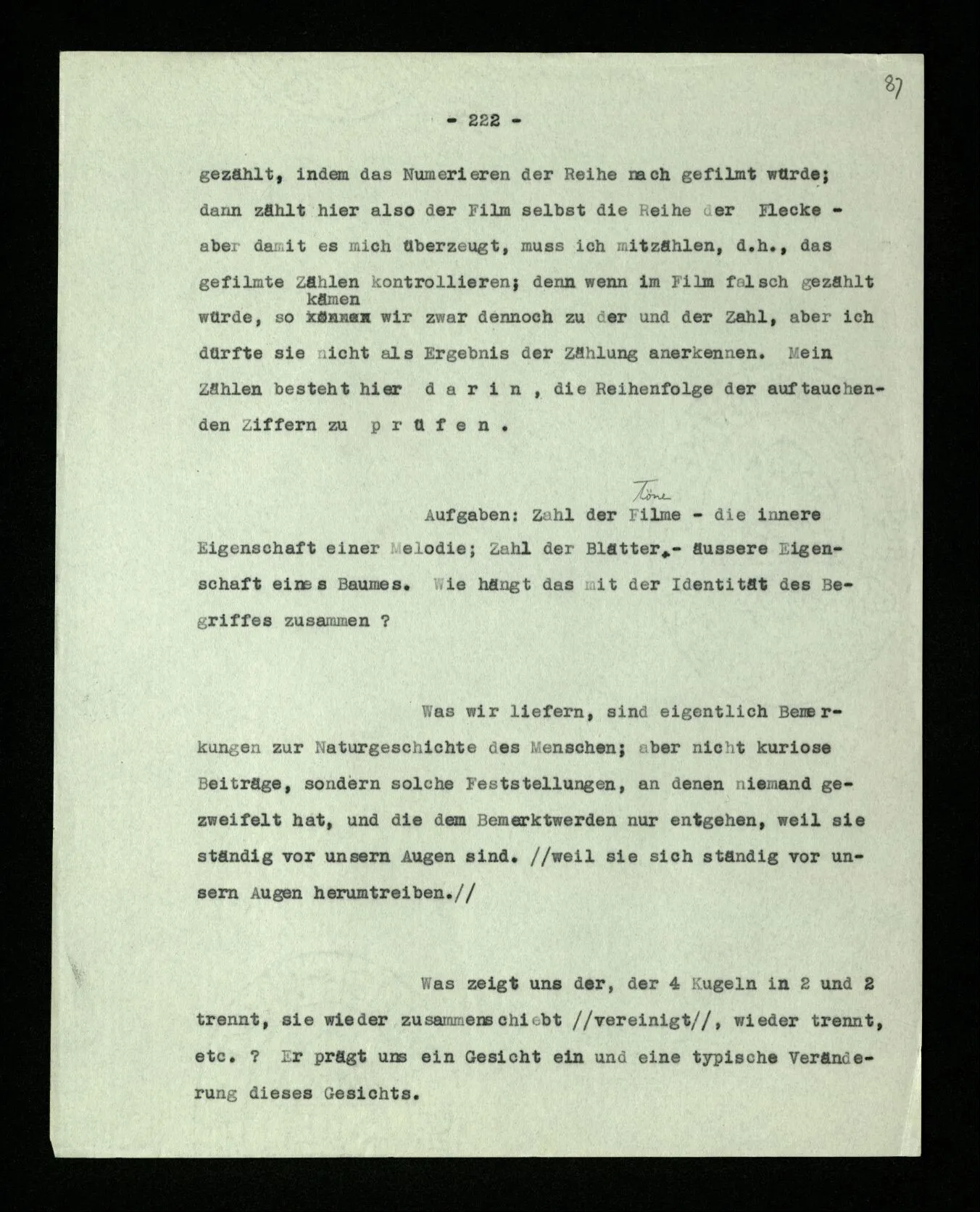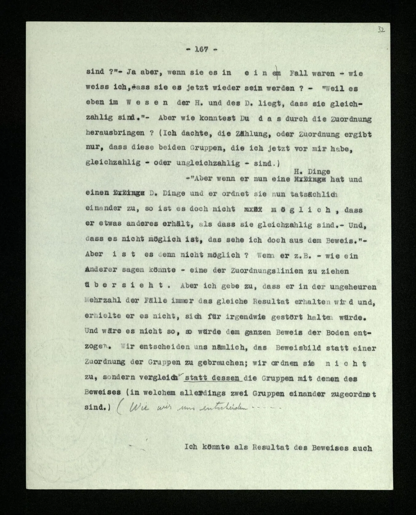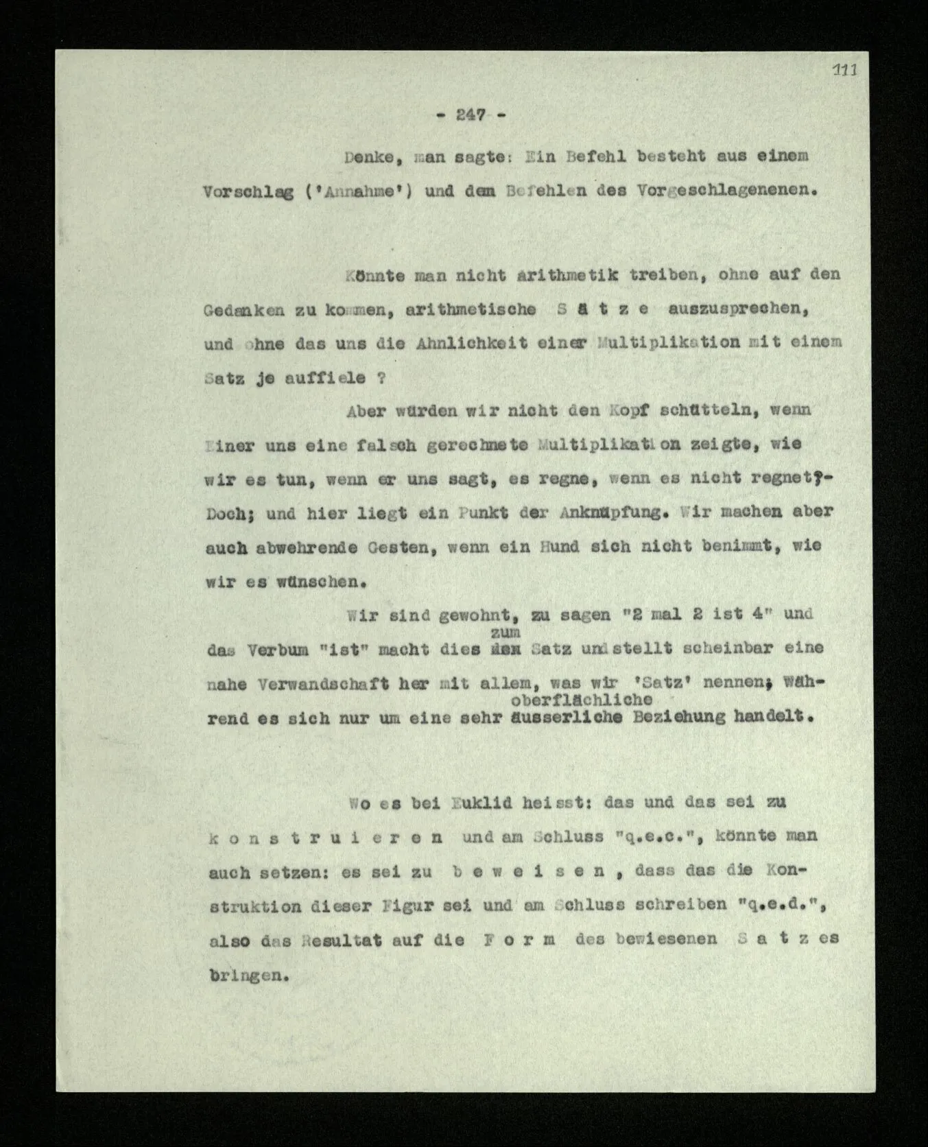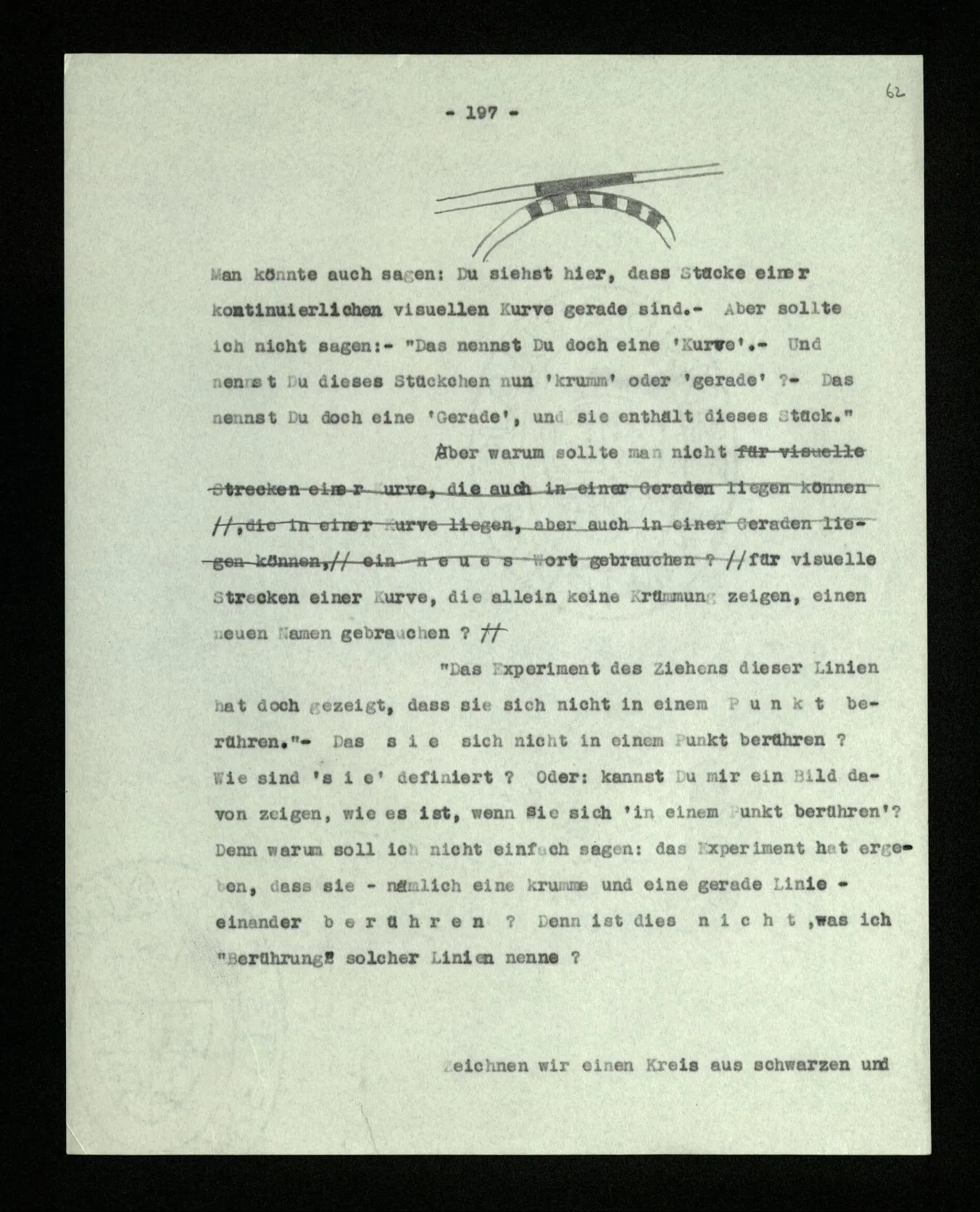 Wenn ich nun sage: 10 Striche bestehen notwendig aus 3 mal 3 Strichen und einem Strich – das heißt doch nicht: wenn 10 Striche dastehen, so stehen immer die Ziffern und Bogen rund herum. – Setze ich sie aber zu den Strichen hinzu, so sage ich, ich demonstrierte nur das Wesen jener Gruppe von Strichen. – Aber bist Du sicher, daß sich die Gruppe beim Dazuschreiben jener Zeichen nicht verändert hat? – “Ich weiß nicht; aber eine bestimmte Zahl von Strichen stand da; und wenn nicht 10, so eine andre und dann hatte die eben andre Eigenschaften. –”