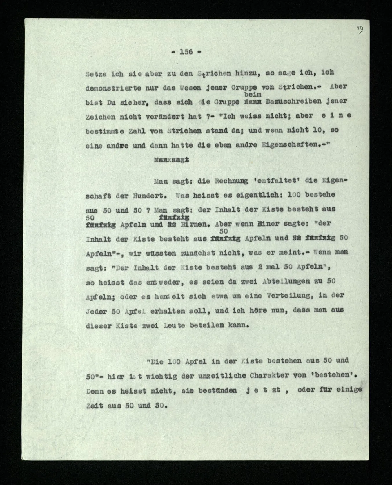 Man sagt: die Rechnung ‘entfaltet’ die Eigenschaft der Hundert. Was heißt es eigentlich: 100 bestehe aus 50 und 50? Man sagt: der Inhalt der Kiste besteht aus 50 Äpfeln und 50 Birnen. Aber wenn Einer sagte: “der Inhalt der Kiste besteht aus 50 Äpfeln und 50 Äpfeln” –, wir wüßten zunächst nicht, was er meint. – Wenn man sagt: “Der Inhalt der Kiste besteht aus 2 mal 50 Äpfeln”, so heißt das entweder, es seien da zwei Abteilungen zu 50 Äpfeln; oder es handelt sich etwa um eine Verteilung, in der Jeder 50 Äpfel erhalten soll, und ich höre nun, daß man aus dieser Kiste zwei Leute beteilen kann.