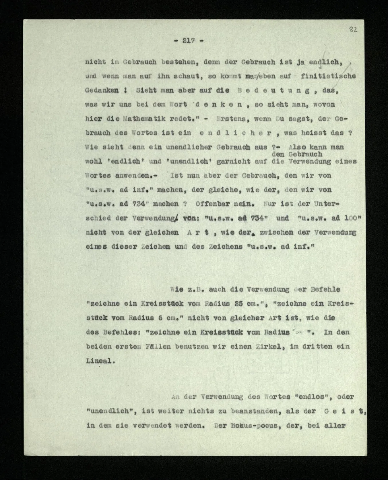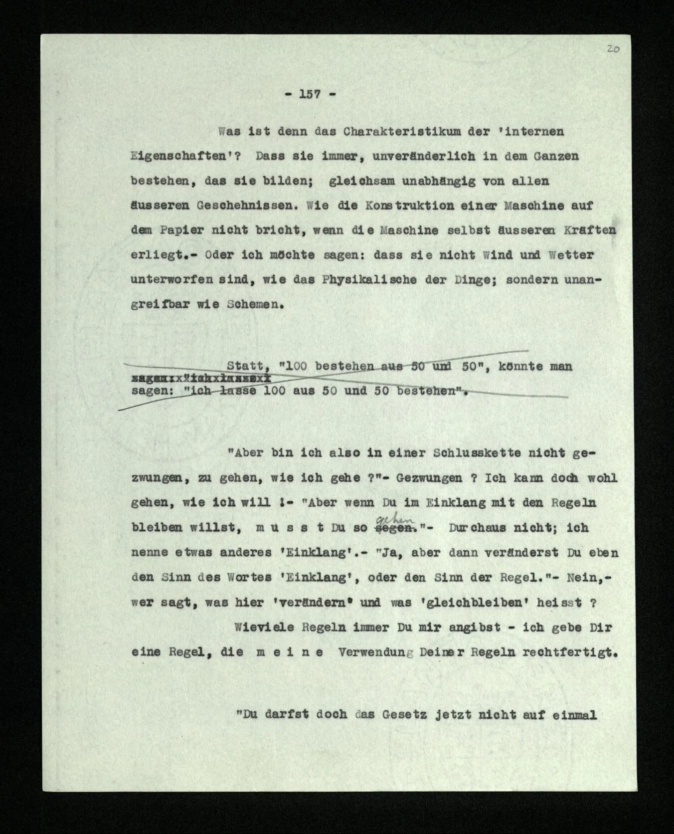 “Aber bin ich also in einer Schlußkette nicht gezwungen, zu gehen, wie ich gehe?” – Gezwungen? Ich kann doch wohl gehen, wie ich will! – “Aber wenn Du im Einklang mit den Regeln bleiben willst, mußt Du so gehen.” – Durchaus nicht; ich nenne etwas anderes ‘Einklang’. – Ja, aber dann veränderst Du eben den Sinn des Wortes ‘Einklang’, oder den Sinn der Regel.” – Nein, – wer sagt, was hier ‘verändern’ und was ‘gleichbleiben’ heißt? Wieviele Regeln immer Du mir angibst – ich gebe Dir eine Regel, die meine Verwendung Deiner Regeln rechtfertigt.