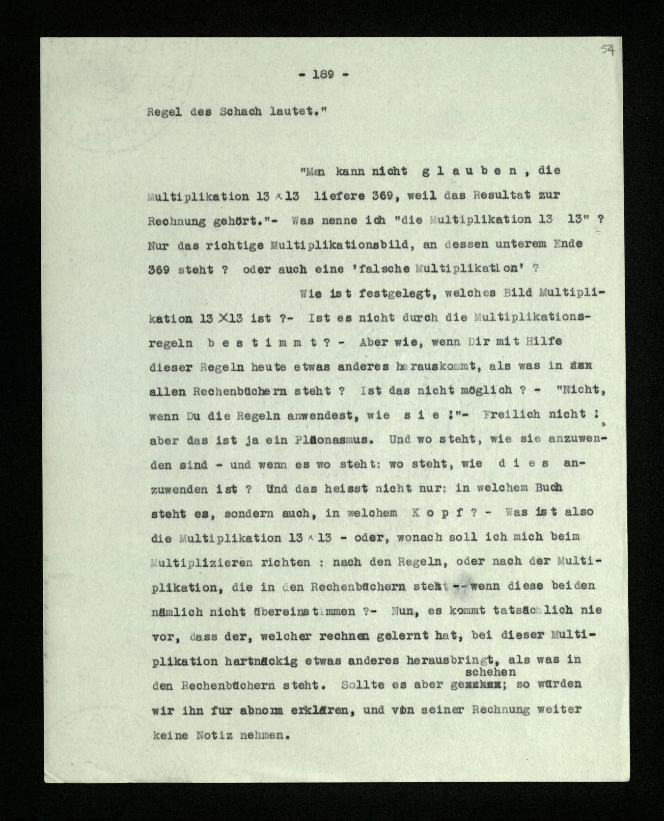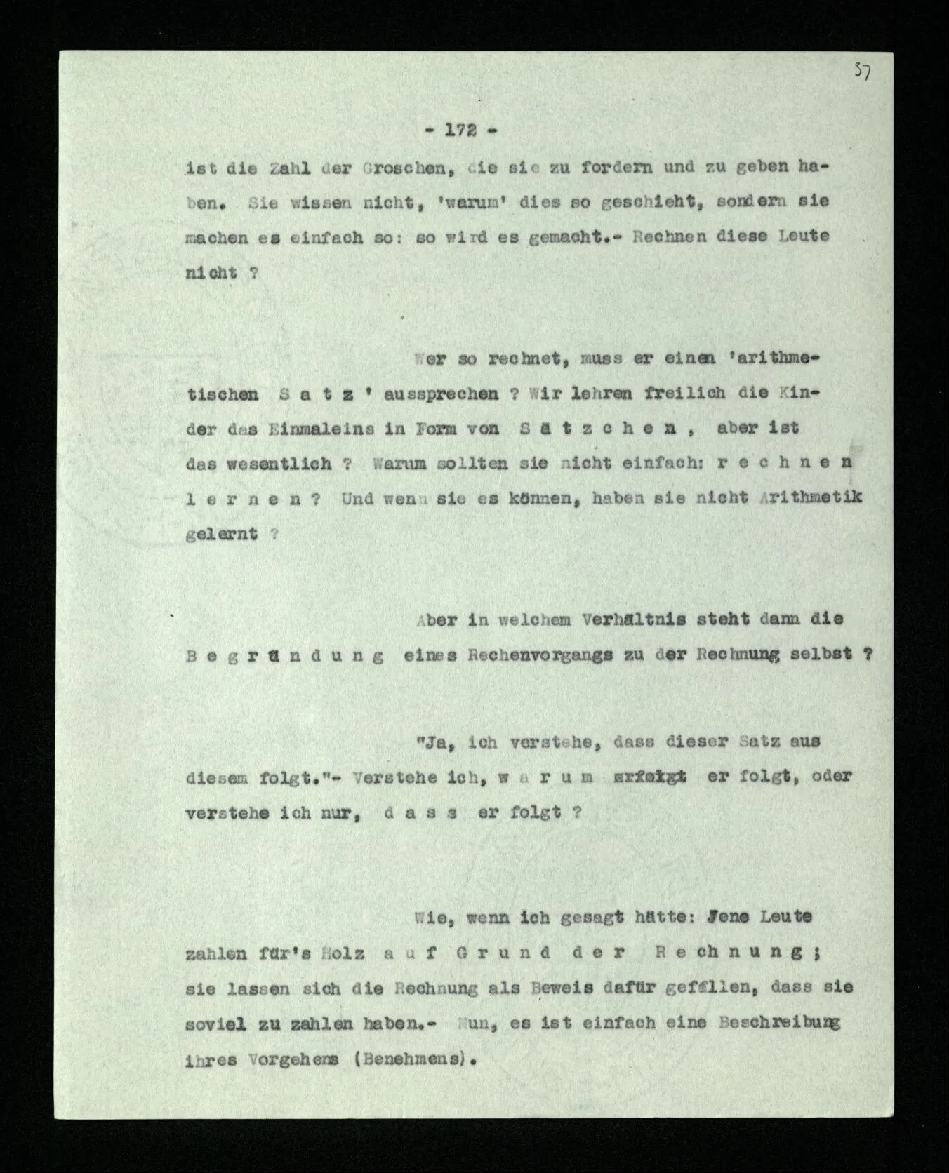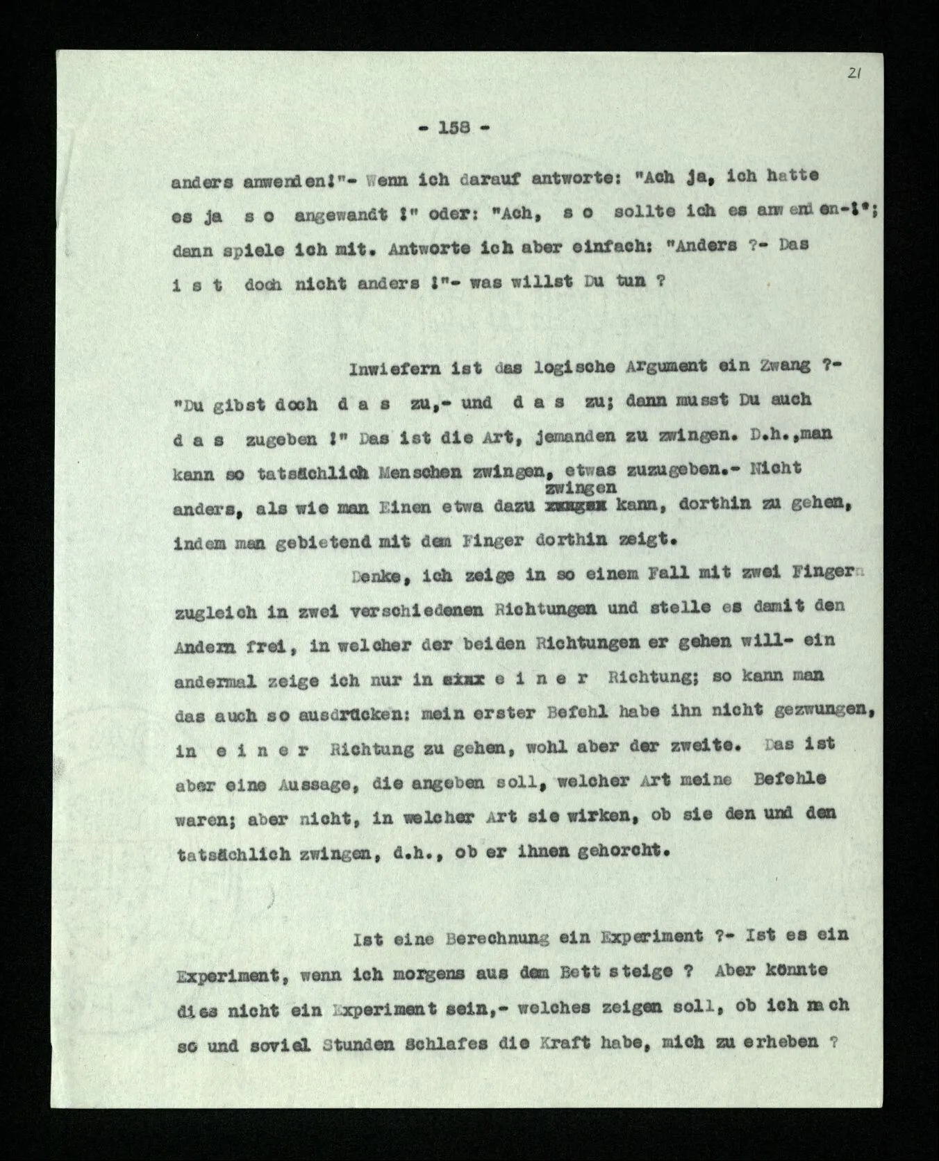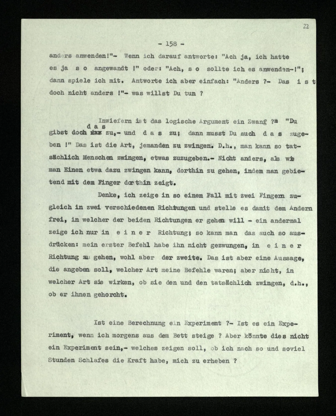 Ist eine Berechnung ein Experiment? – Ist es ein Experiment, wenn ich morgens aus dem Bett steige? Aber könnte dies nicht ein Experiment sein, – welches zeigen soll, ob ich nach so und soviel Stunden Schlafes die Kraft habe, mich zu erheben? “Du darfst doch das Gesetz jetzt nicht auf einmal anders anwenden!” – Wenn ich darauf antworte: “Ach ja, ich hatte es ja so angewandt!” oder: “Ach, so sollte ich es anwenden –!”; dann spiele ich mit. Antworte ich aber einfach: “Anders? – Das ist doch nicht anders!” – was willst Du tun?