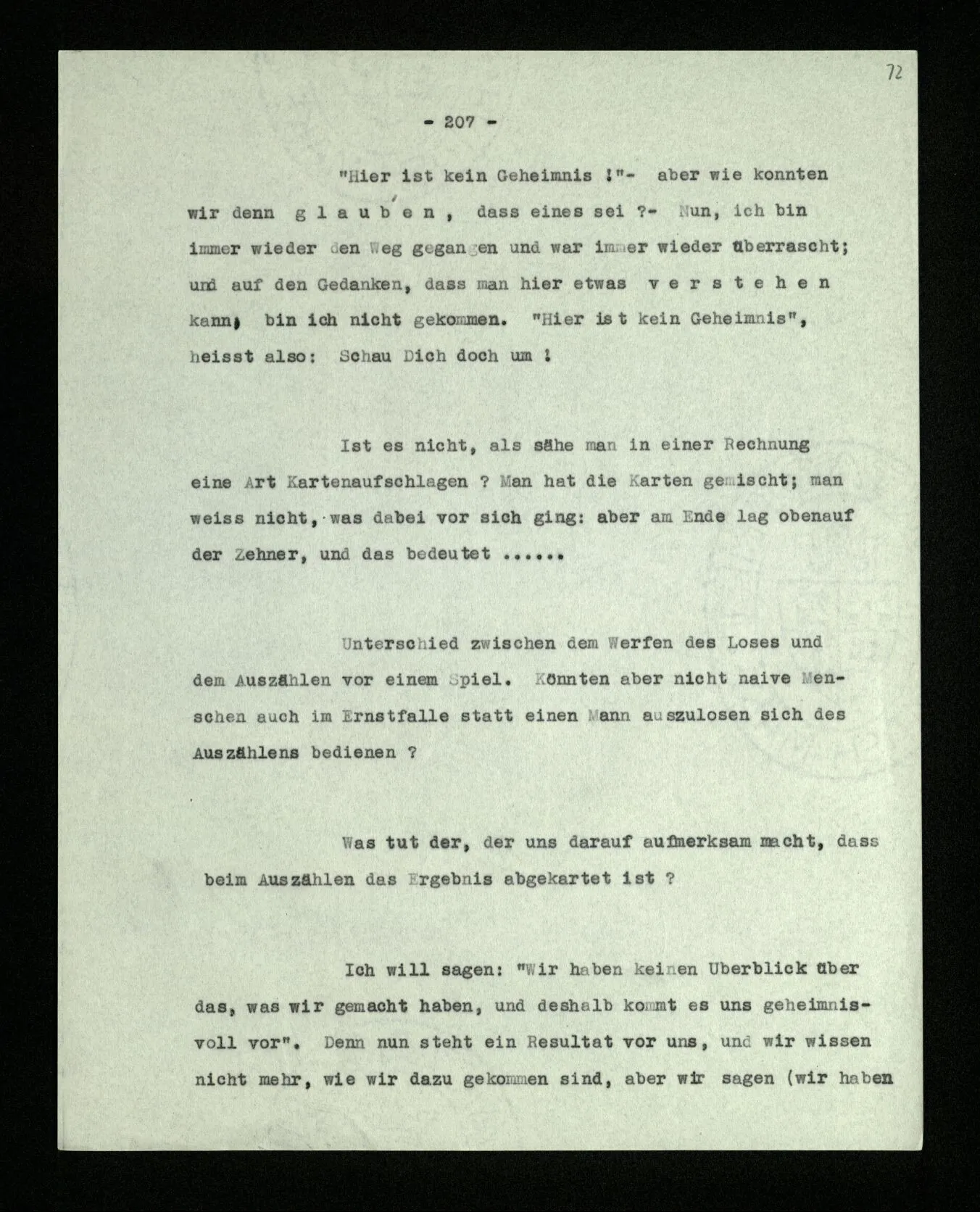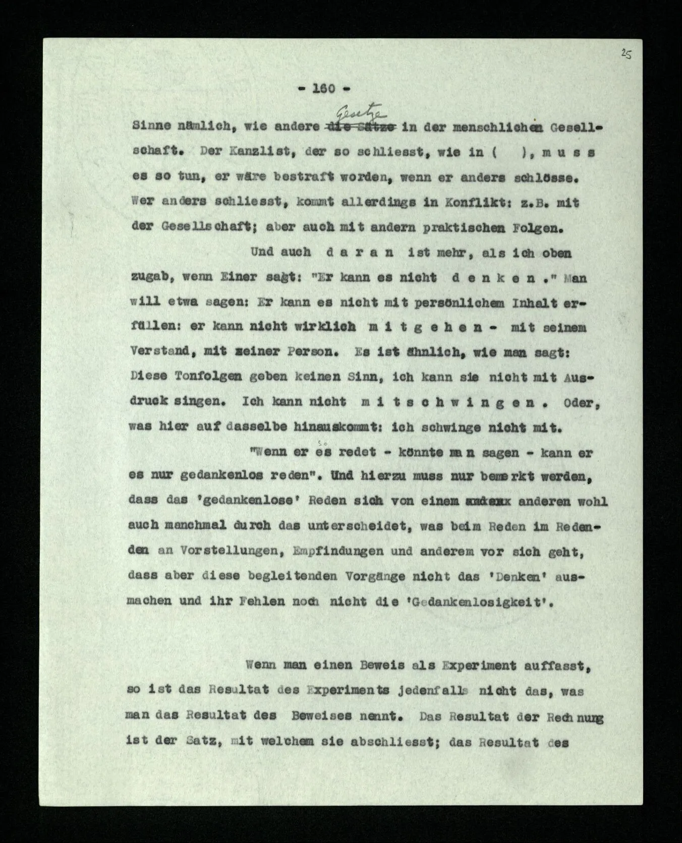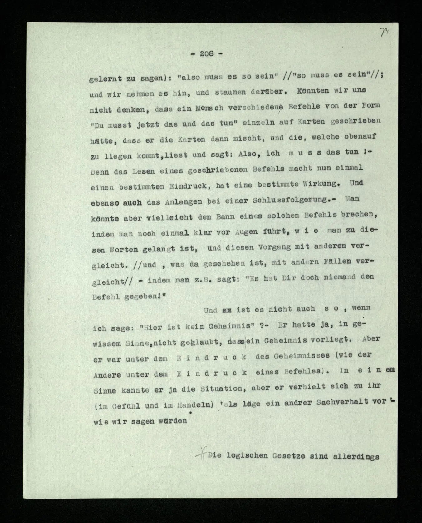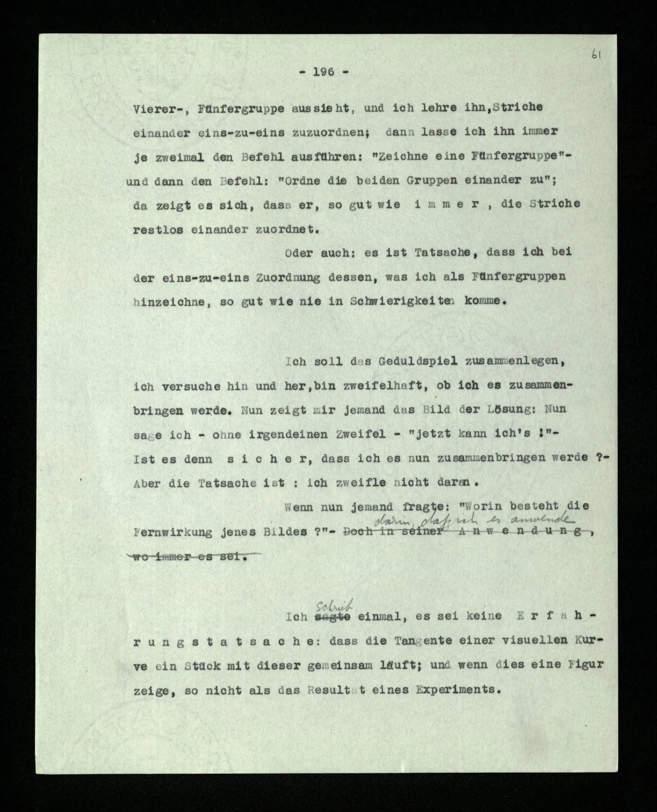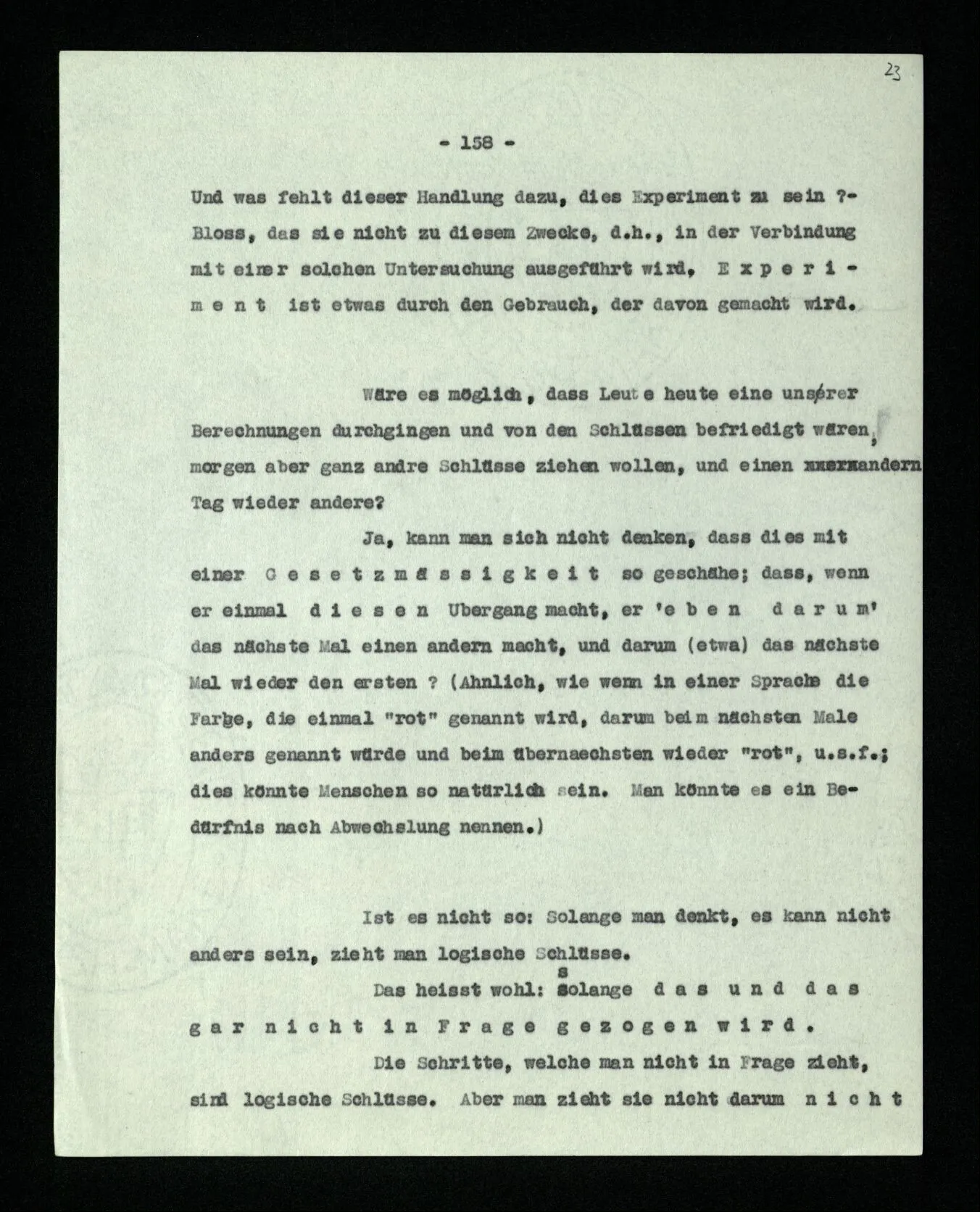 Ist eine Berechnung ein Experiment? – Ist es ein Experiment, wenn ich morgens aus dem Bett steige? Aber könnte dies nicht ein Experiment sein, – welches zeigen soll, ob ich nach so und soviel Stunden Schlafes die Kraft habe, mich zu erheben? “Du darfst doch das Gesetz jetzt nicht auf einmal anders anwenden!” – Wenn ich darauf antworte: “Ach ja, ich hatte es ja so angewandt!” oder: “Ach, so sollte ich es anwenden –!”; dann spiele ich mit. Antworte ich aber einfach: “Anders? – Das ist doch nicht anders!” – was willst Du tun?