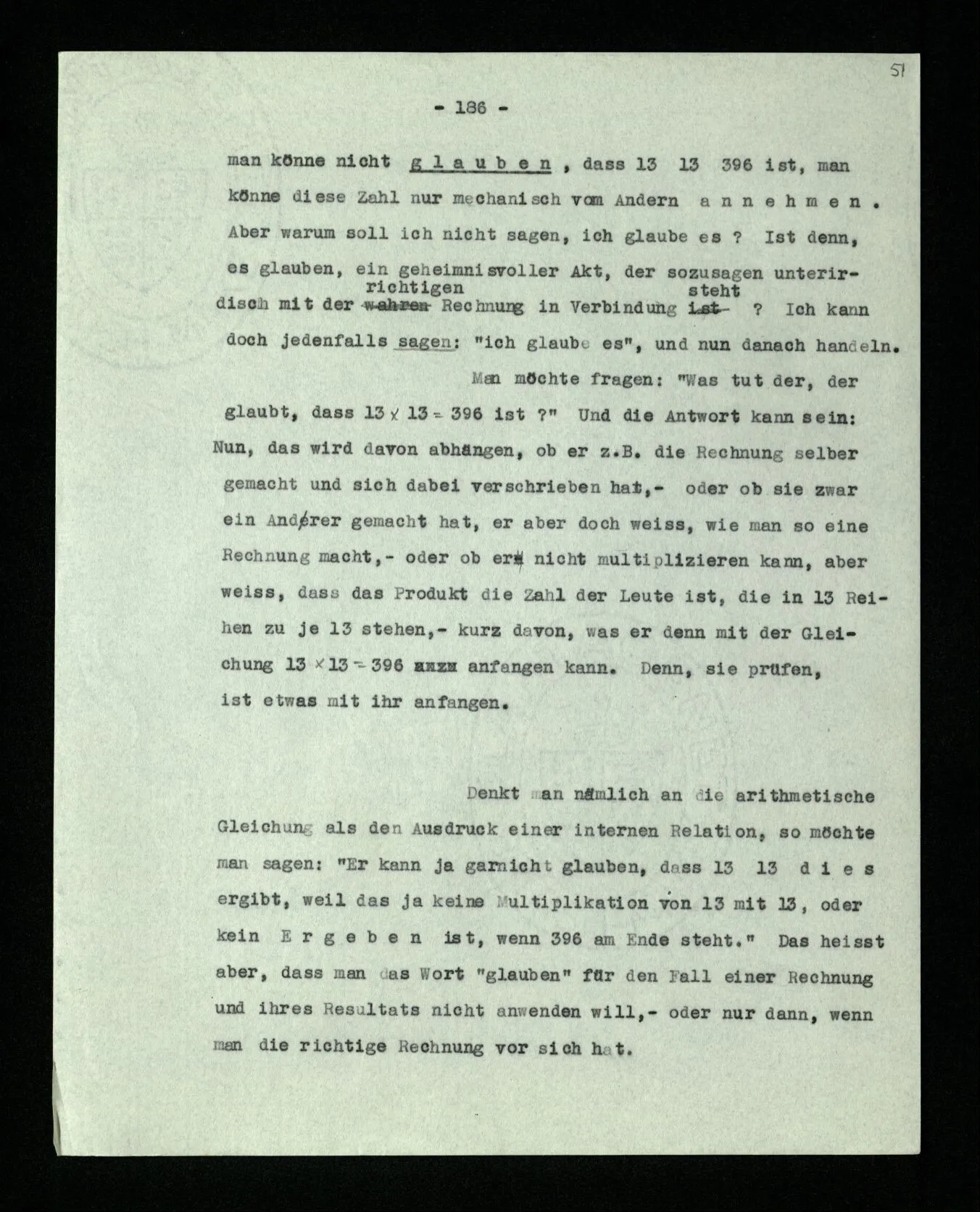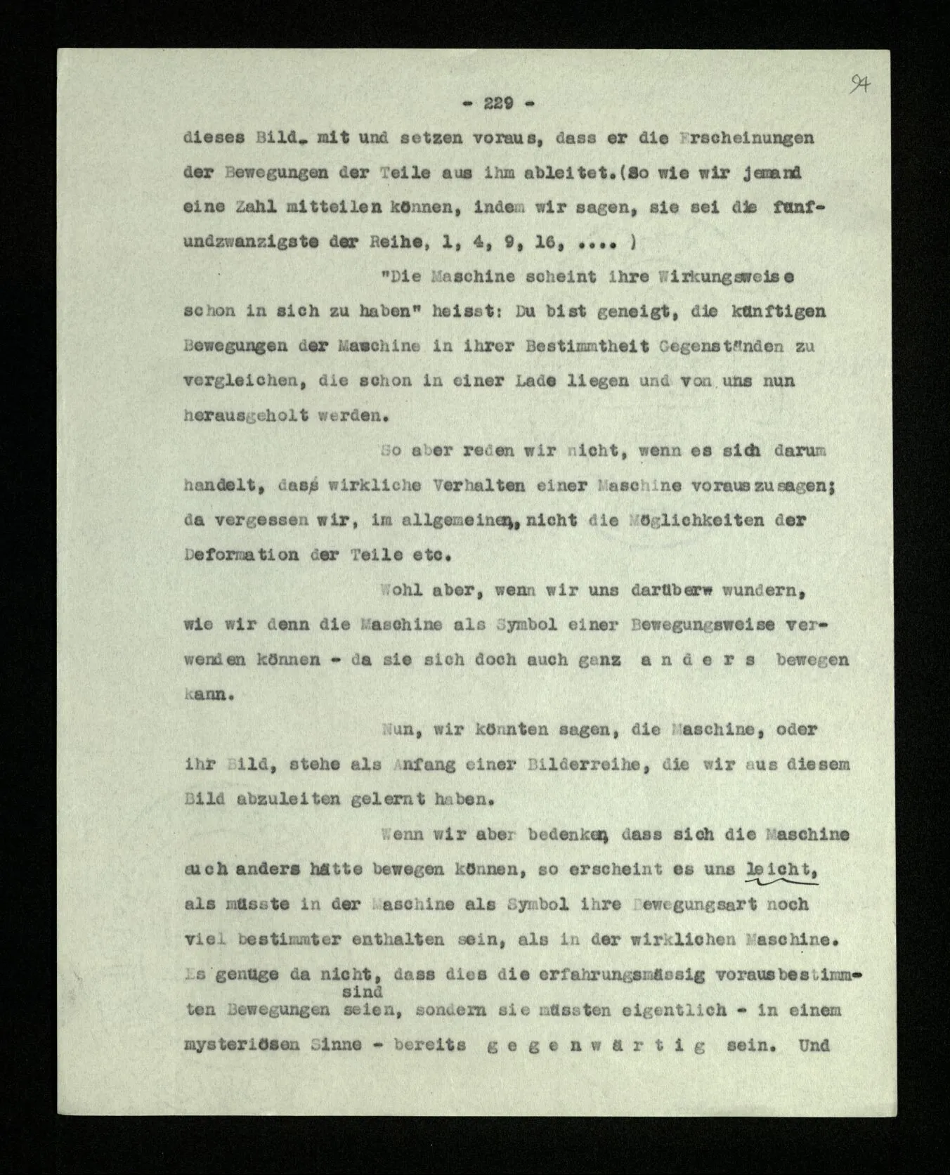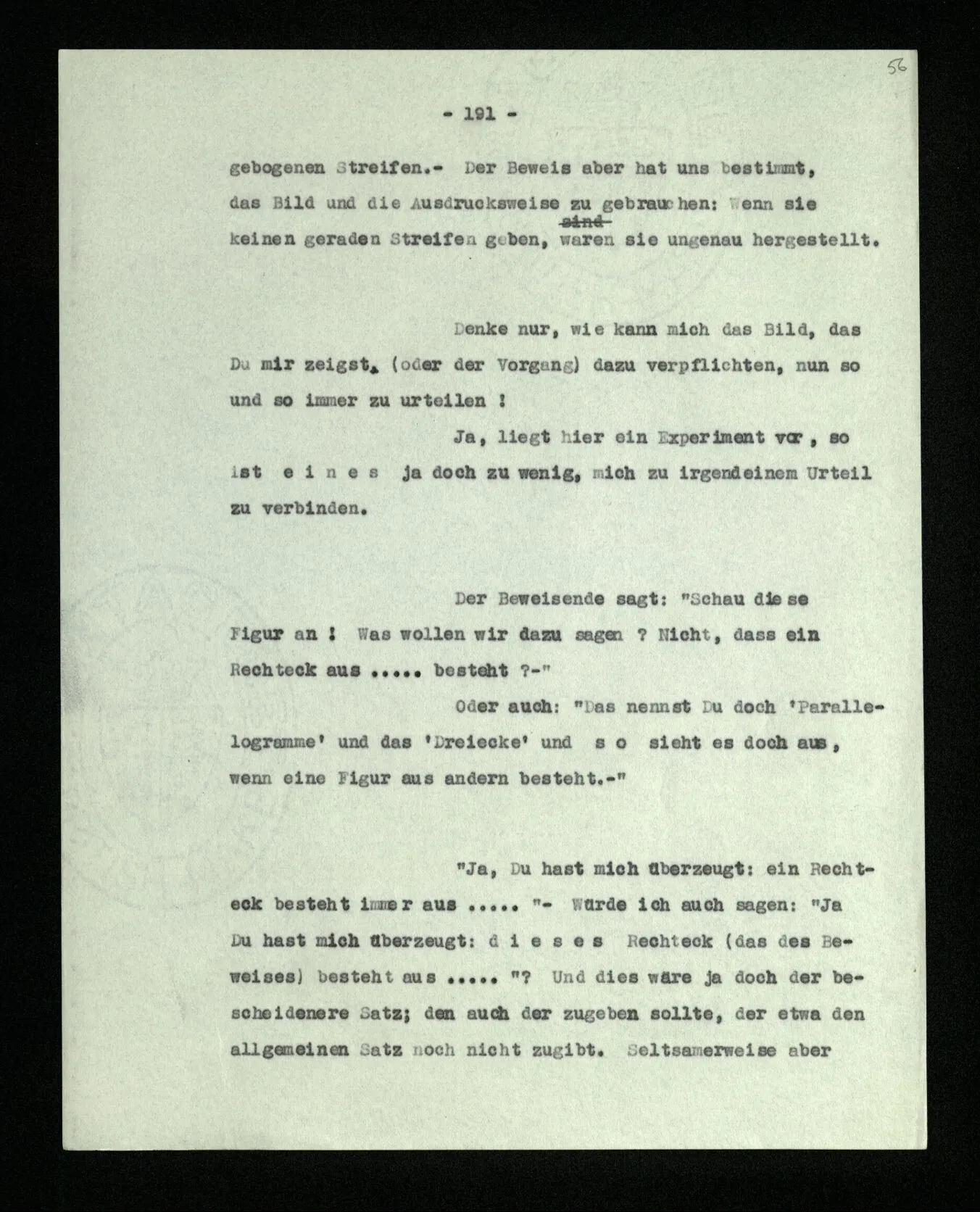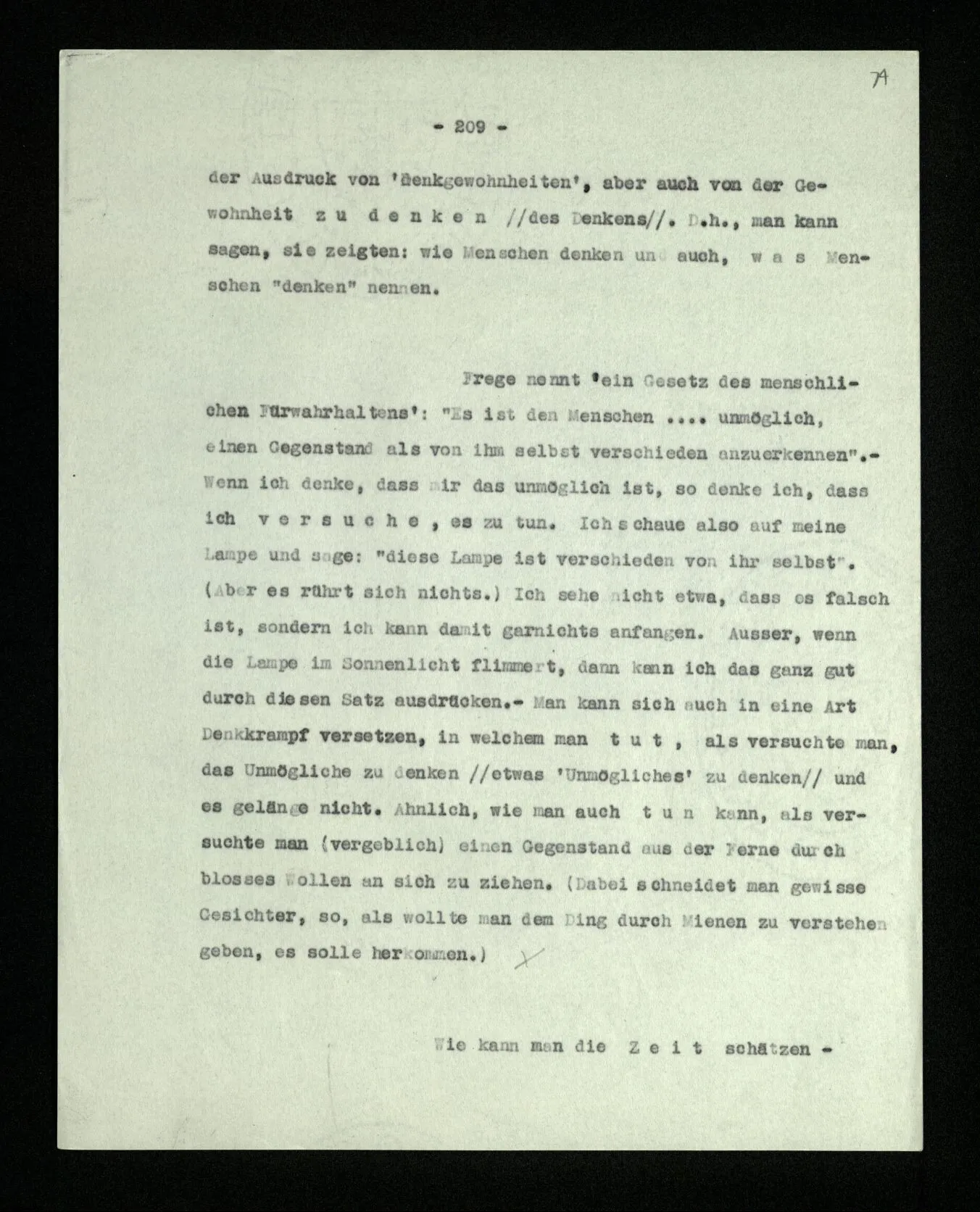 Ist eine Berechnung ein Experiment? – Ist es ein Experiment, wenn ich morgens aus dem Bett steige? Aber könnte dies nicht ein Experiment sein, – welches zeigen soll, ob ich nach so und soviel Stunden Schlafes die Kraft habe, mich zu erheben? “Du darfst doch das Gesetz jetzt nicht auf einmal anders anwenden!” – Wenn ich darauf antworte: “Ach ja, ich hatte es ja so angewandt!” oder: “Ach, so sollte ich es anwenden –!”; dann spiele ich mit. Antworte ich aber einfach: “Anders? – Das ist doch nicht anders!” – was willst Du tun?