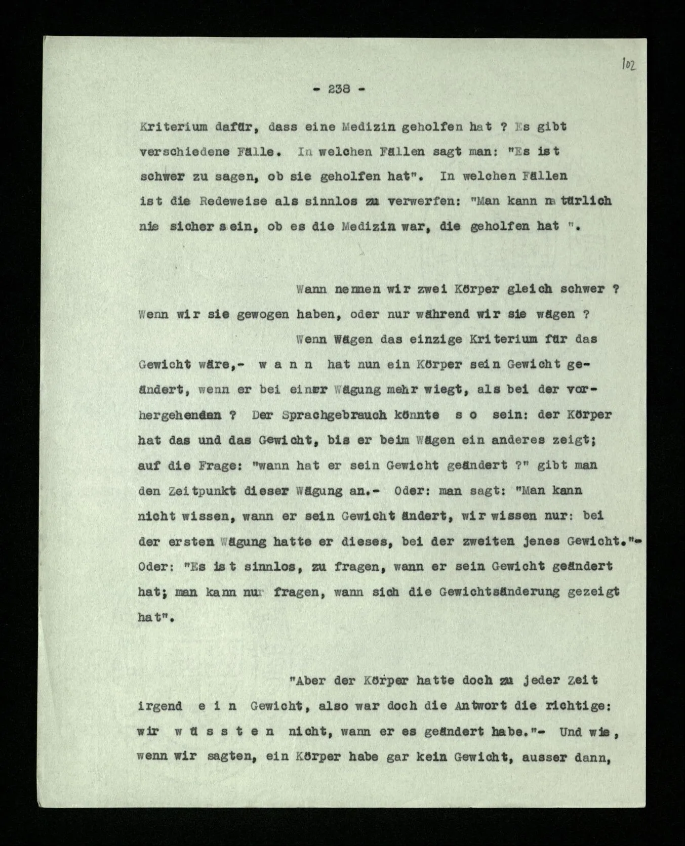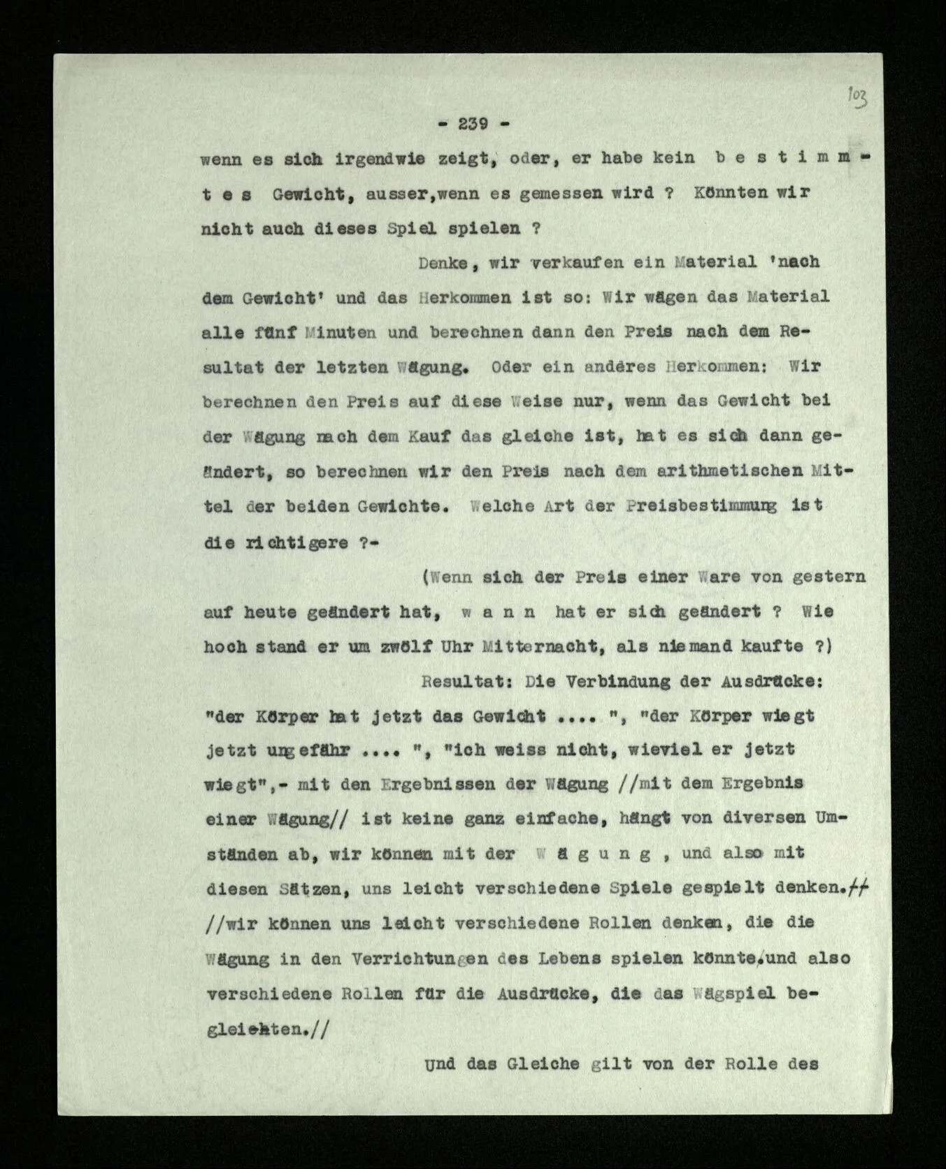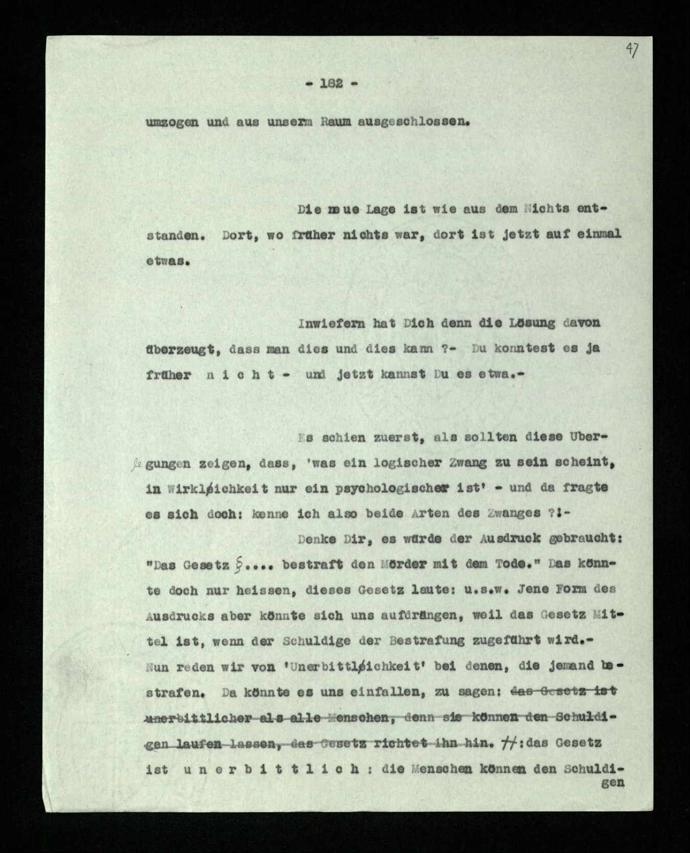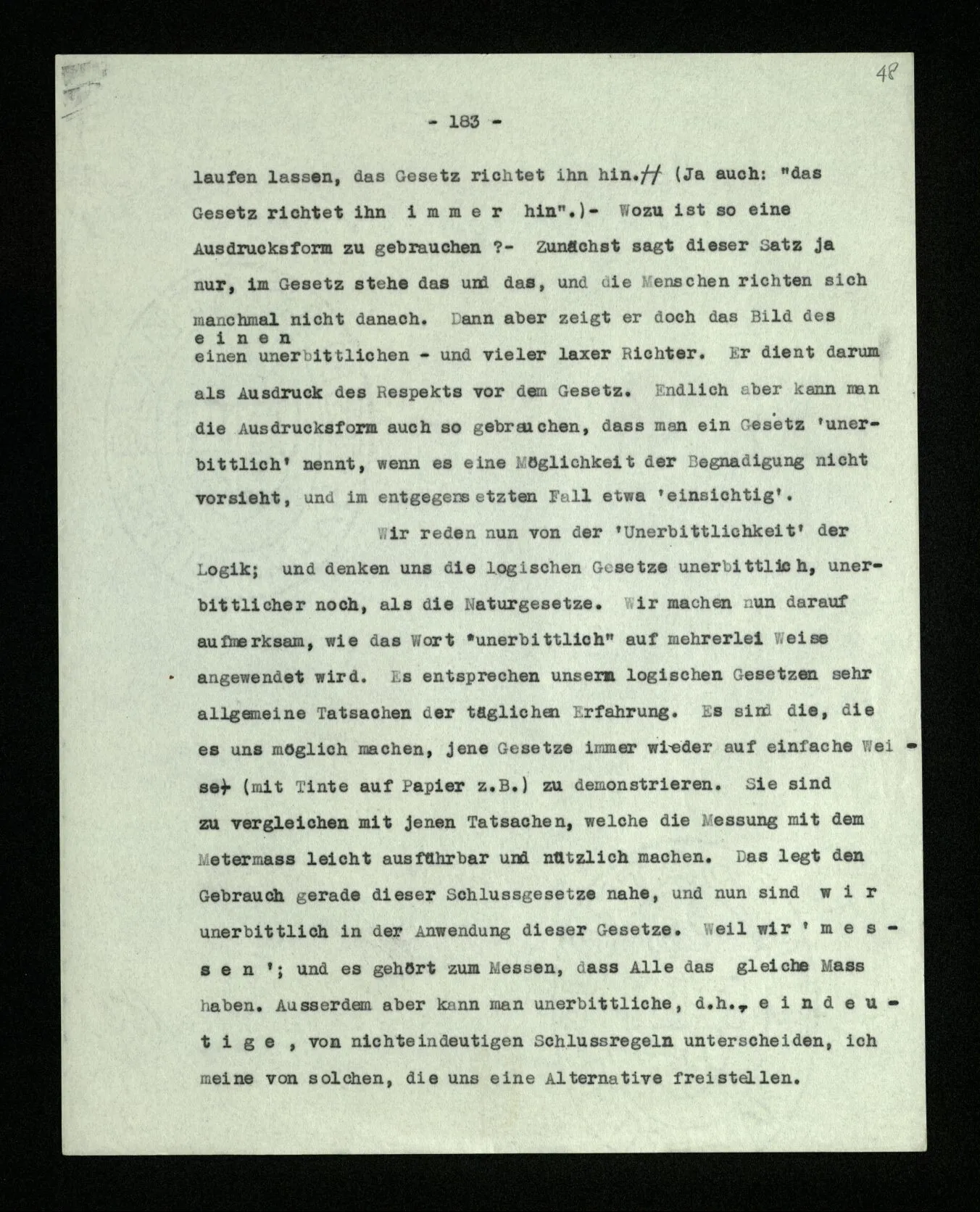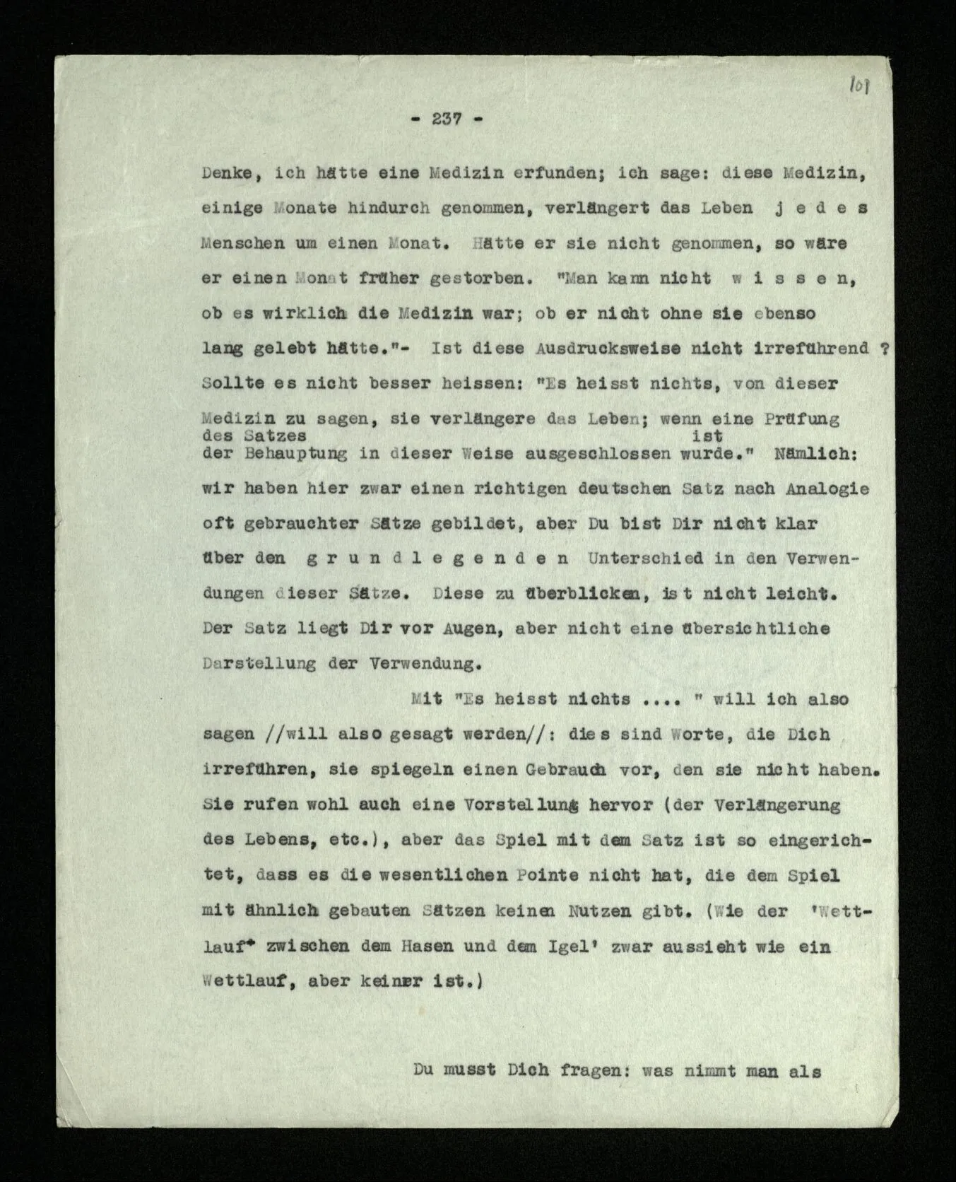 Ist eine Berechnung ein Experiment? – Ist es ein Experiment, wenn ich morgens aus dem Bett steige? Aber könnte dies nicht ein Experiment sein, – welches zeigen soll, ob ich nach so und soviel Stunden Schlafes die Kraft habe, mich zu erheben? “Du darfst doch das Gesetz jetzt nicht auf einmal anders anwenden!” – Wenn ich darauf antworte: “Ach ja, ich hatte es ja so angewandt!” oder: “Ach, so sollte ich es anwenden –!”; dann spiele ich mit. Antworte ich aber einfach: “Anders? – Das ist doch nicht anders!” – was willst Du tun?