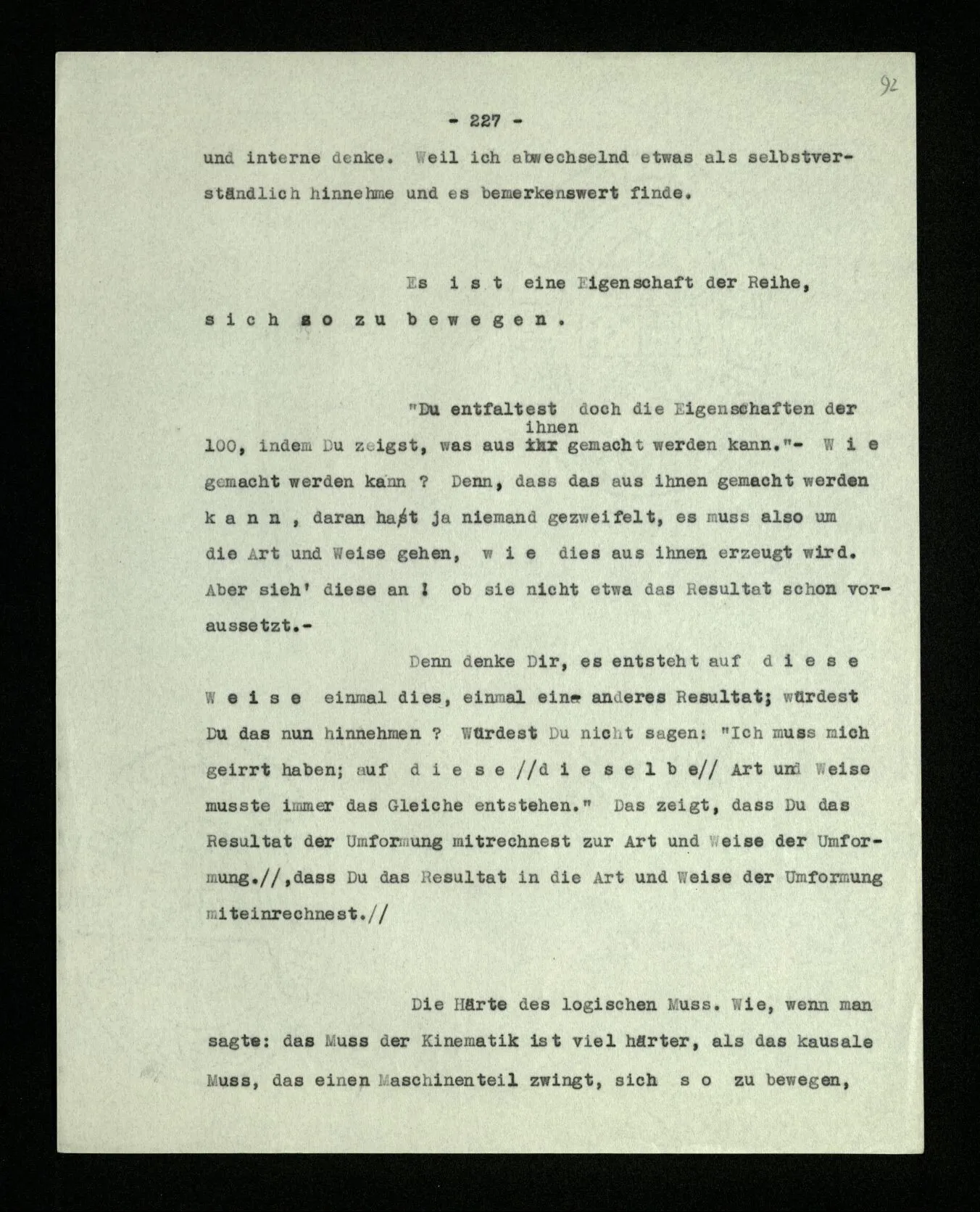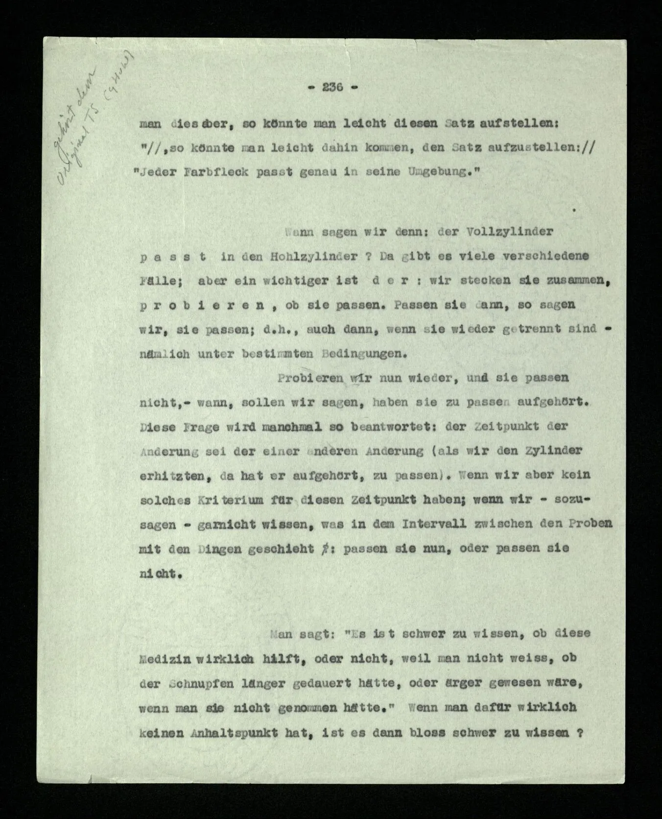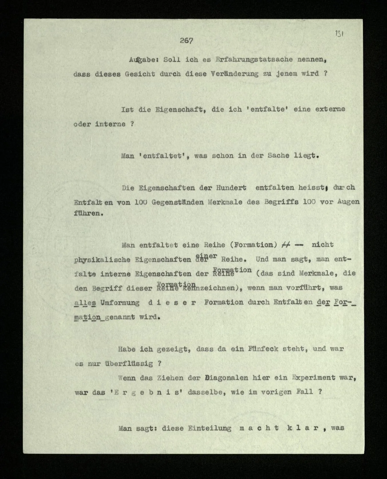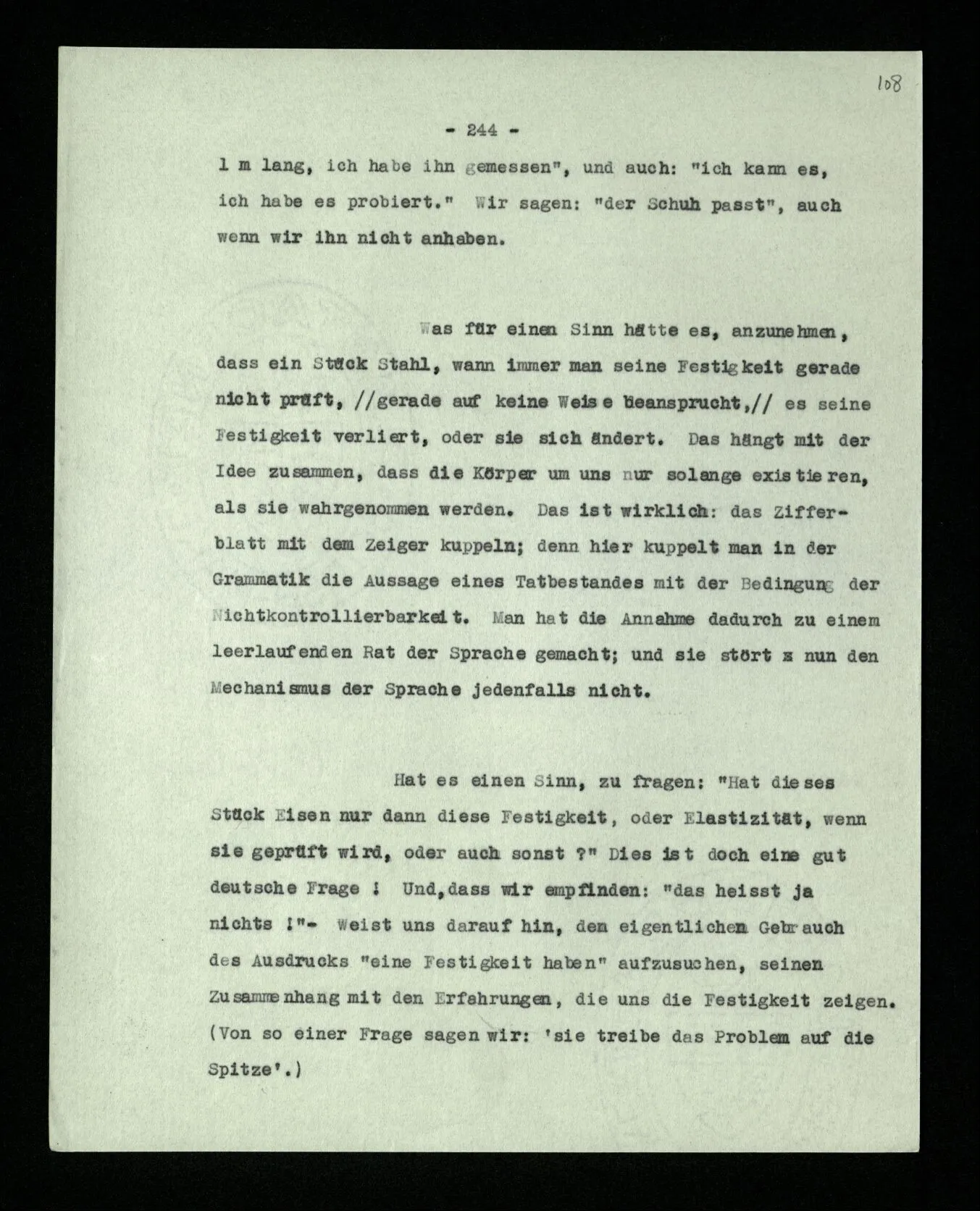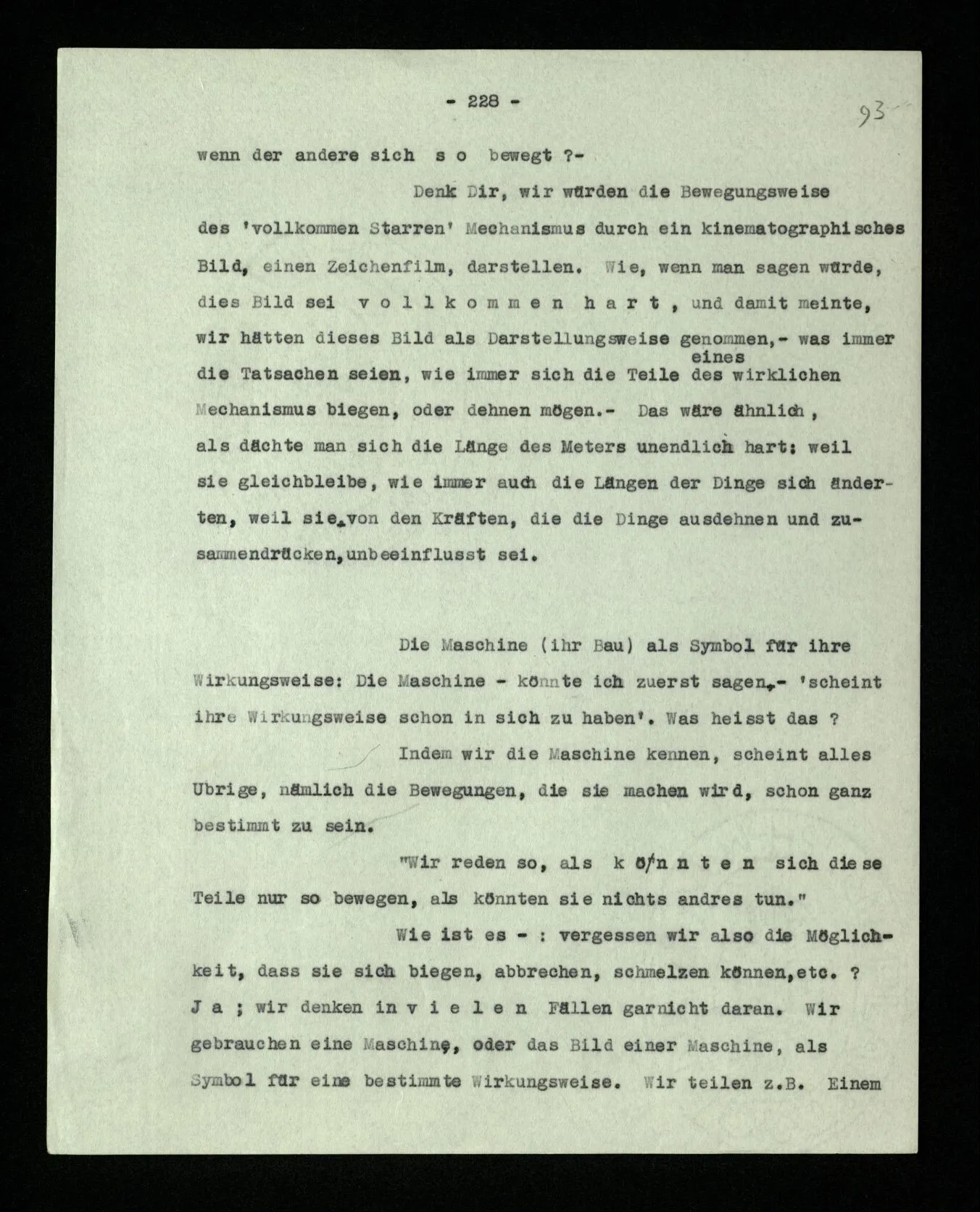 Was ist denn das Charakteristikum der ‘internen Eigenschaften’? Daß sie immer, unveränderlich in dem Ganzen bestehen, das sie bilden; gleichsam unabhängig von allen äußeren Geschehnissen. Wie die Konstruktion einer Maschine auf dem Papier nicht bricht, wenn die Maschine selbst äußeren Kräften erliegt. – Oder ich möchte sagen: daß sie nicht Wind und Wetter unterworfen sind, wie das Physikalische der Dinge; sondern unangreifbar wie Schemen.