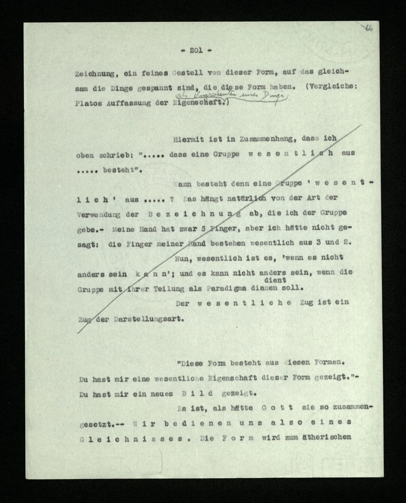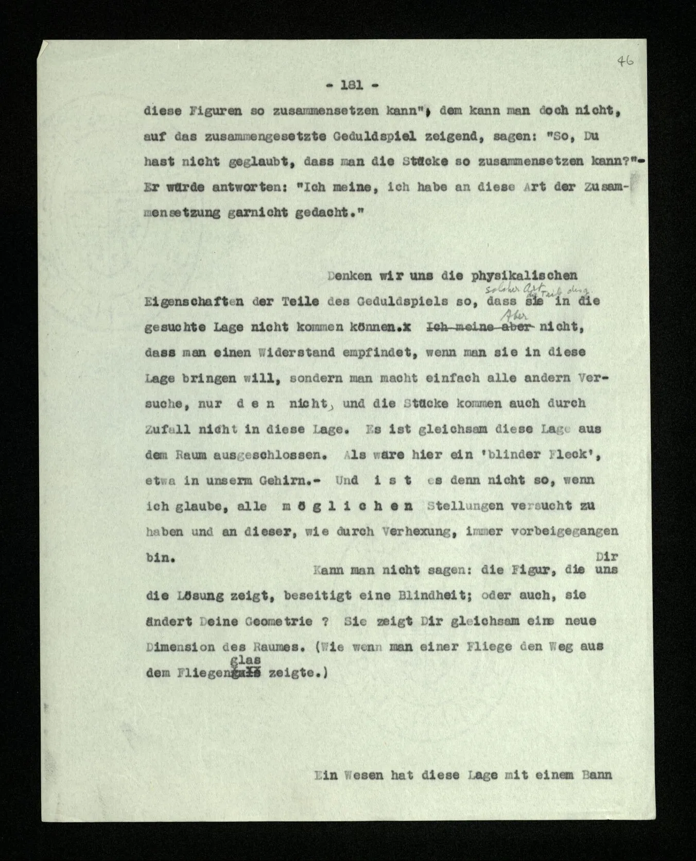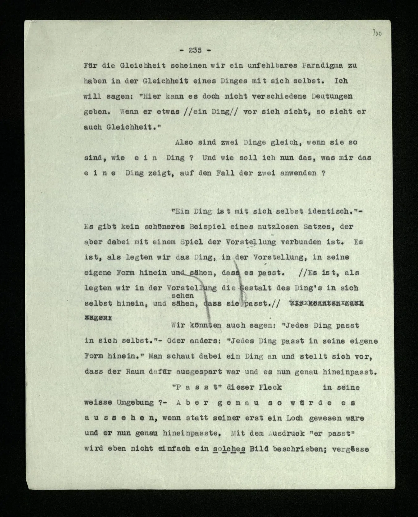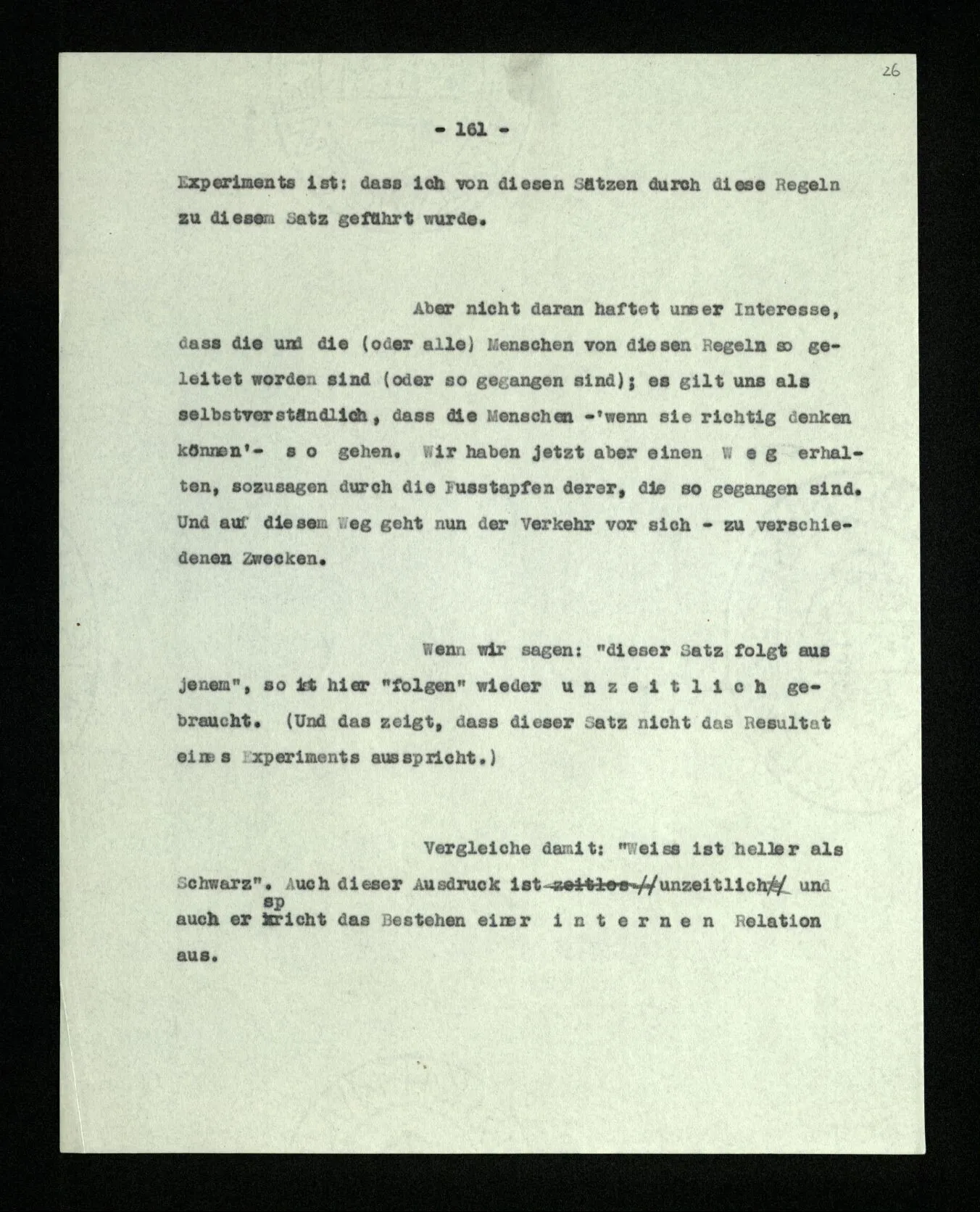 Was ist denn das Charakteristikum der ‘internen Eigenschaften’? Daß sie immer, unveränderlich in dem Ganzen bestehen, das sie bilden; gleichsam unabhängig von allen äußeren Geschehnissen. Wie die Konstruktion einer Maschine auf dem Papier nicht bricht, wenn die Maschine selbst äußeren Kräften erliegt. – Oder ich möchte sagen: daß sie nicht Wind und Wetter unterworfen sind, wie das Physikalische der Dinge; sondern unangreifbar wie Schemen.