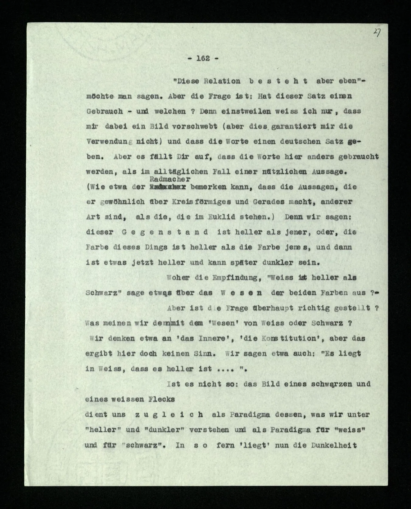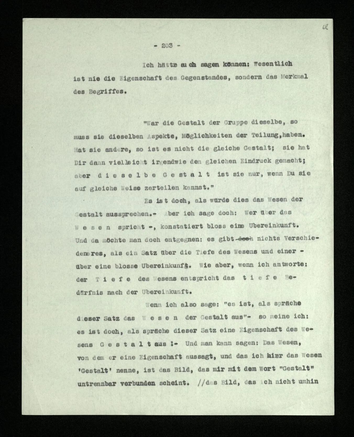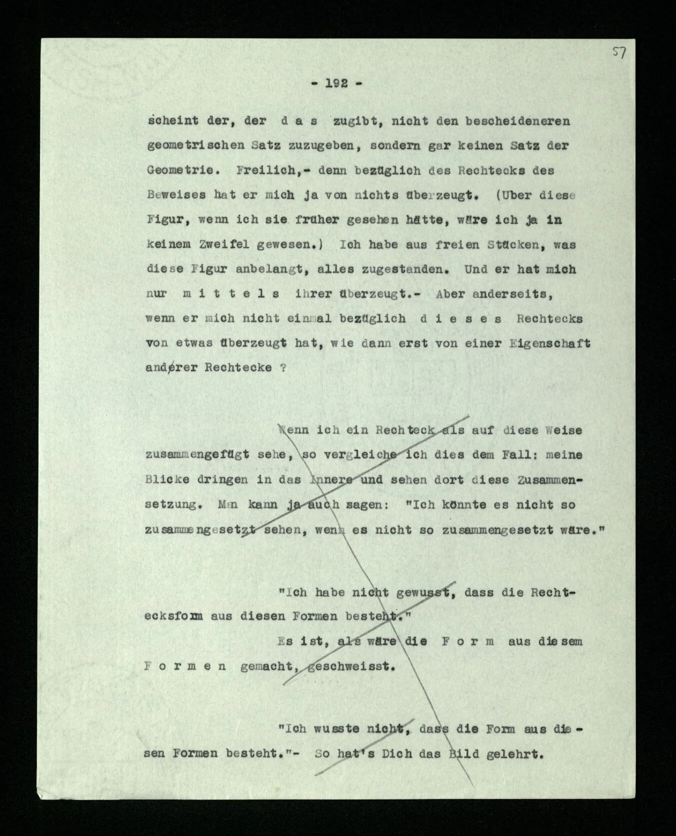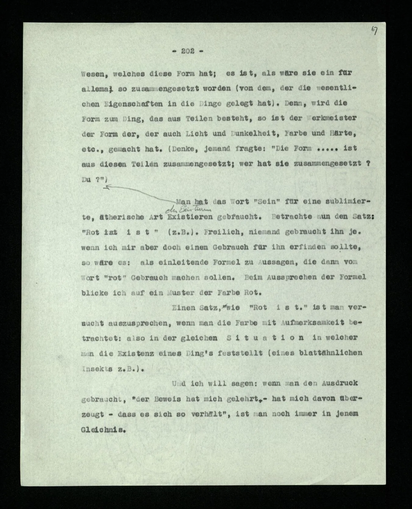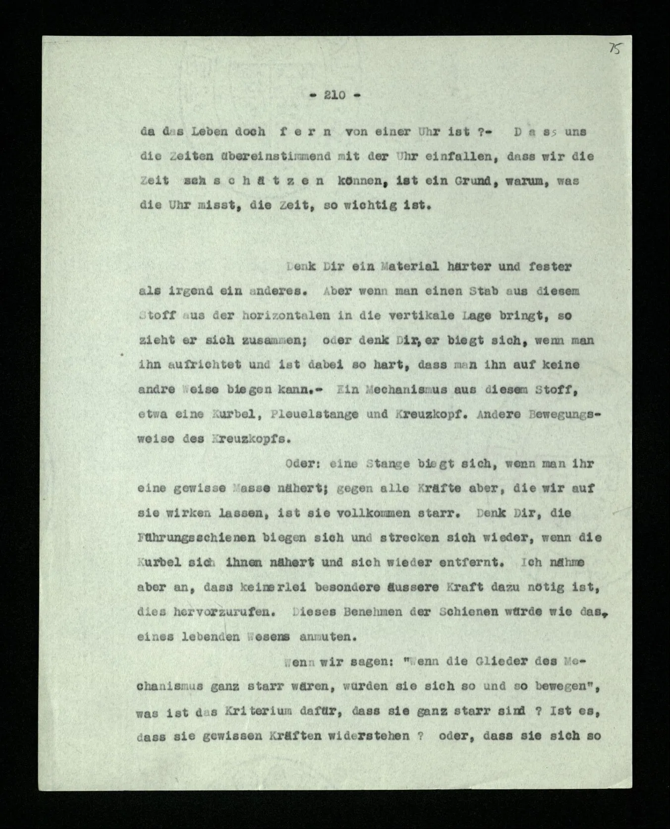 Was ist denn das Charakteristikum der ‘internen Eigenschaften’? Daß sie immer, unveränderlich in dem Ganzen bestehen, das sie bilden; gleichsam unabhängig von allen äußeren Geschehnissen. Wie die Konstruktion einer Maschine auf dem Papier nicht bricht, wenn die Maschine selbst äußeren Kräften erliegt. – Oder ich möchte sagen: daß sie nicht Wind und Wetter unterworfen sind, wie das Physikalische der Dinge; sondern unangreifbar wie Schemen.