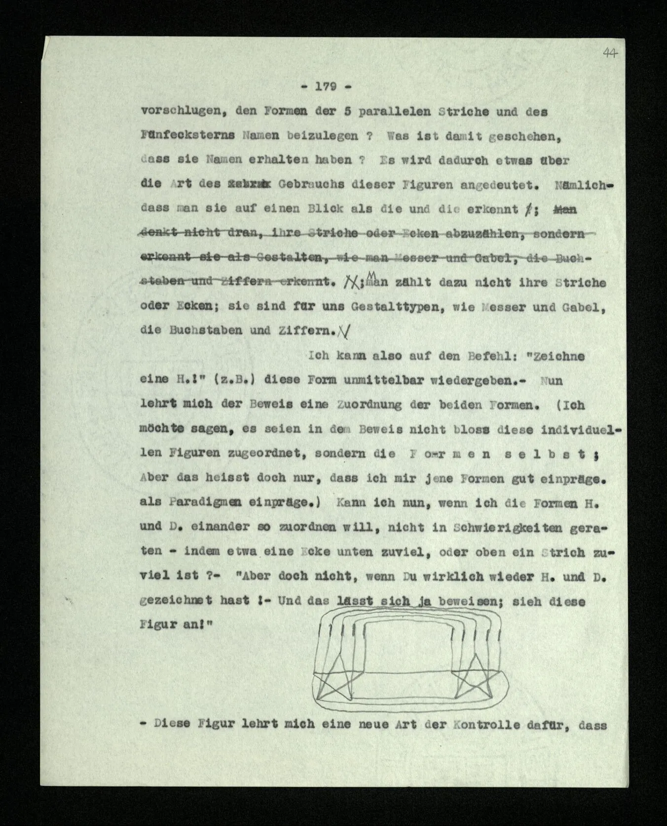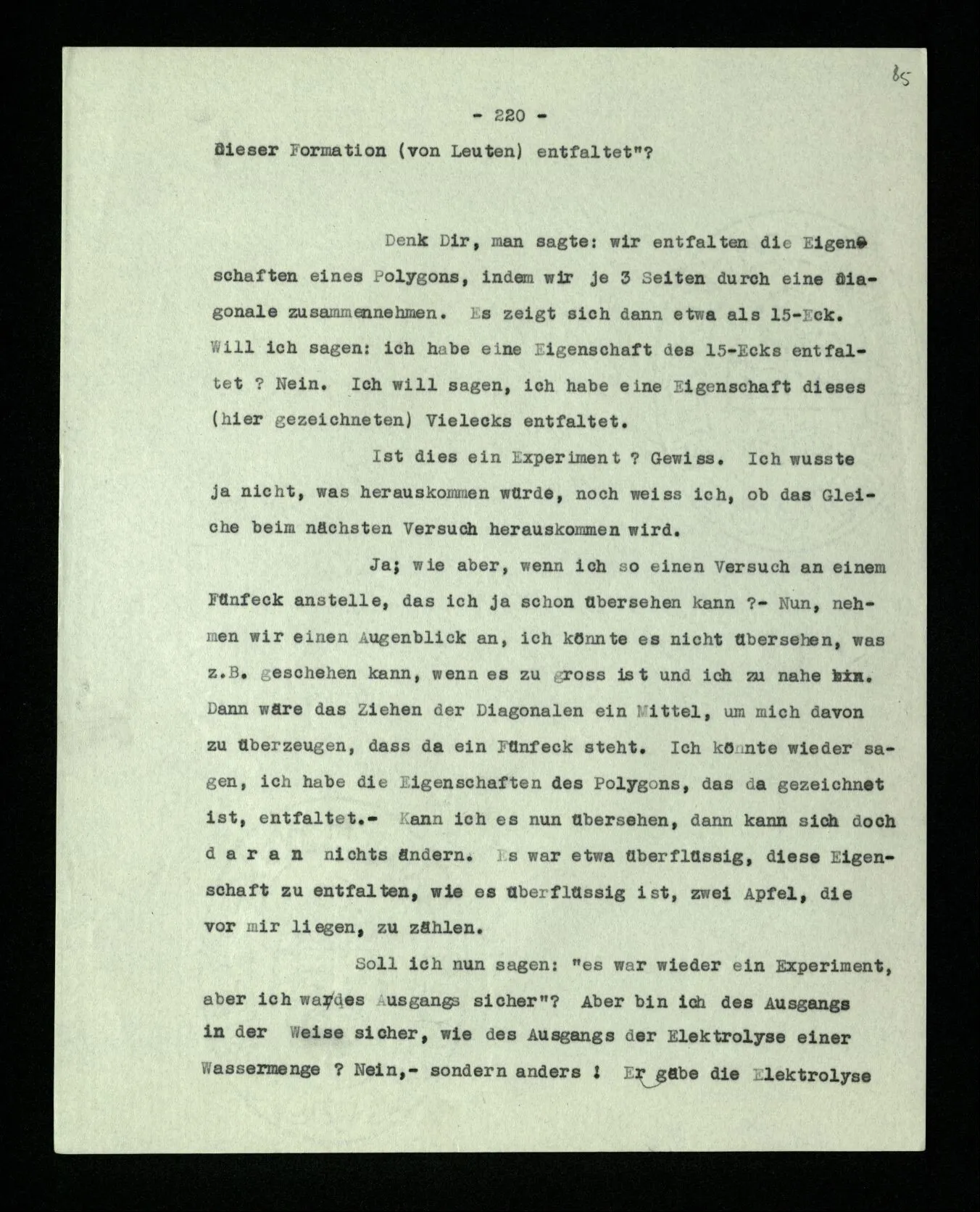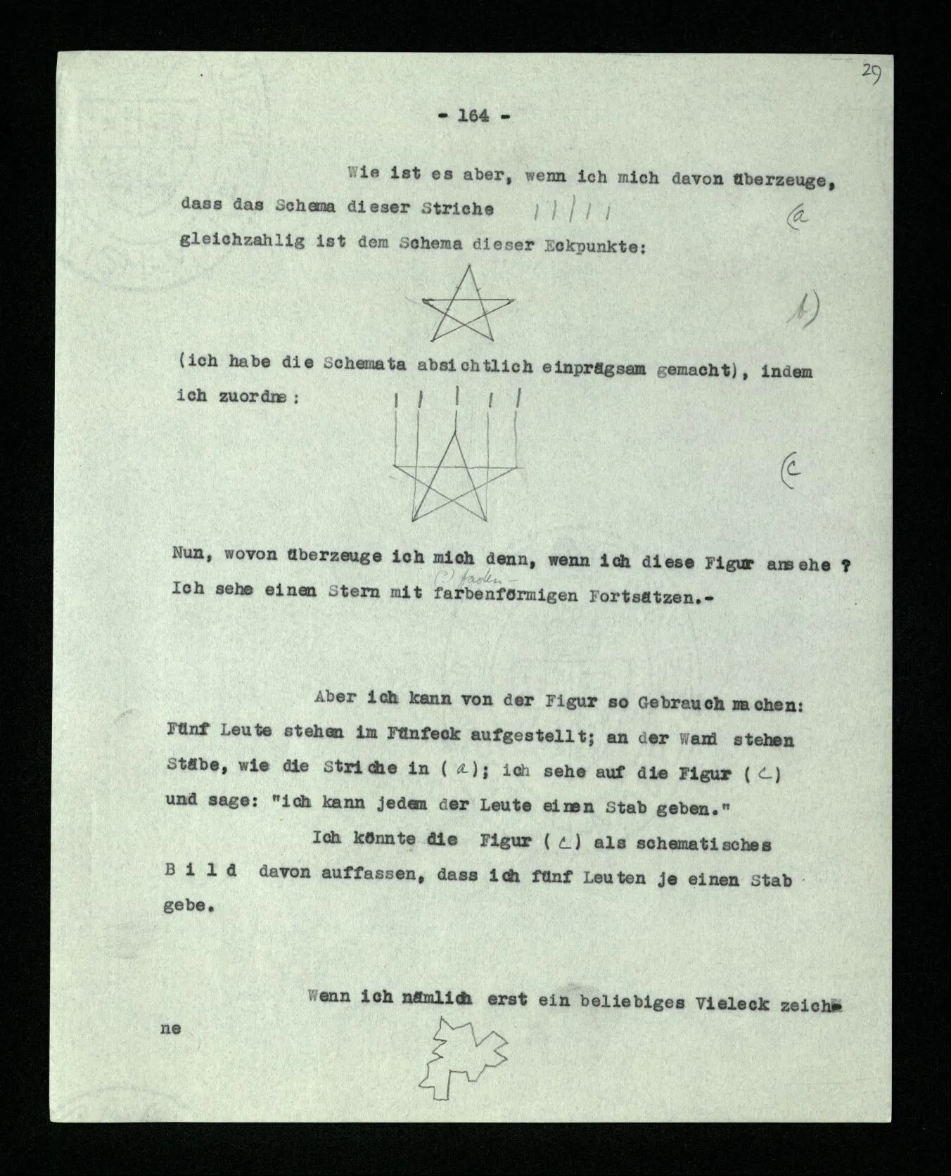 Habe ich gezeigt, daß da ein Fünfeck steht, und war es nur überflüssig? Wenn das Ziehen der Diagonalen hier ein Experiment war, war das ‘Ergebnis’ dasselbe wie im vorigen Fall? Oder: berechtigt mich das Ziehen der Diagonalen nun, zu sagen: “da steht ein Fünfeck”? – Aber kann es mich nicht dazu berechtigen, obwohl ich dieser Berechtigung garnicht bedarf? –