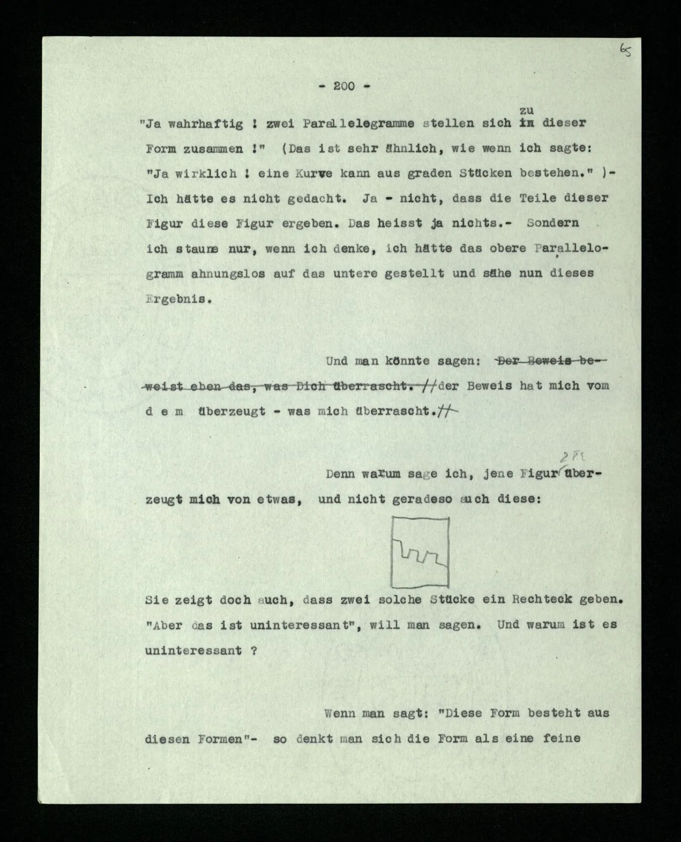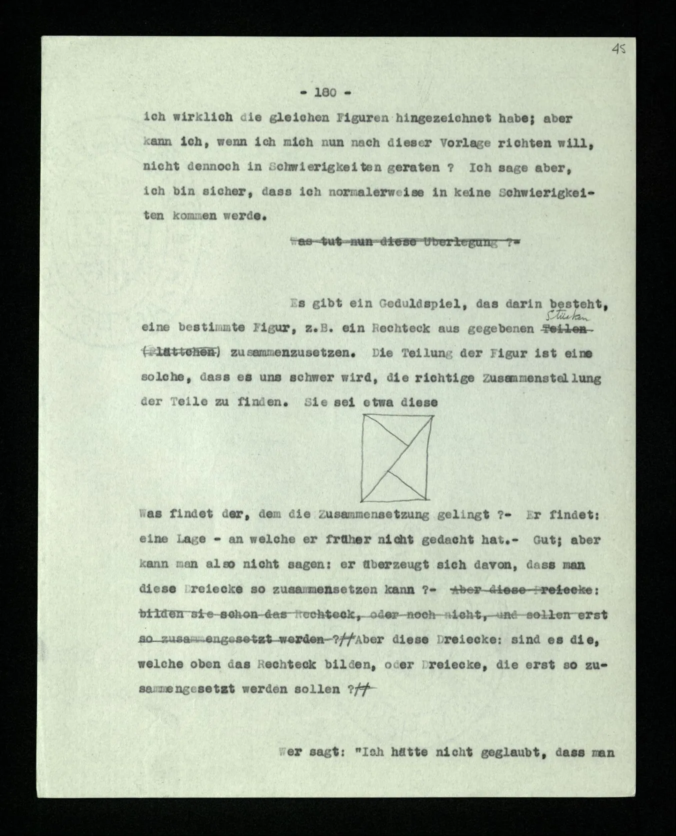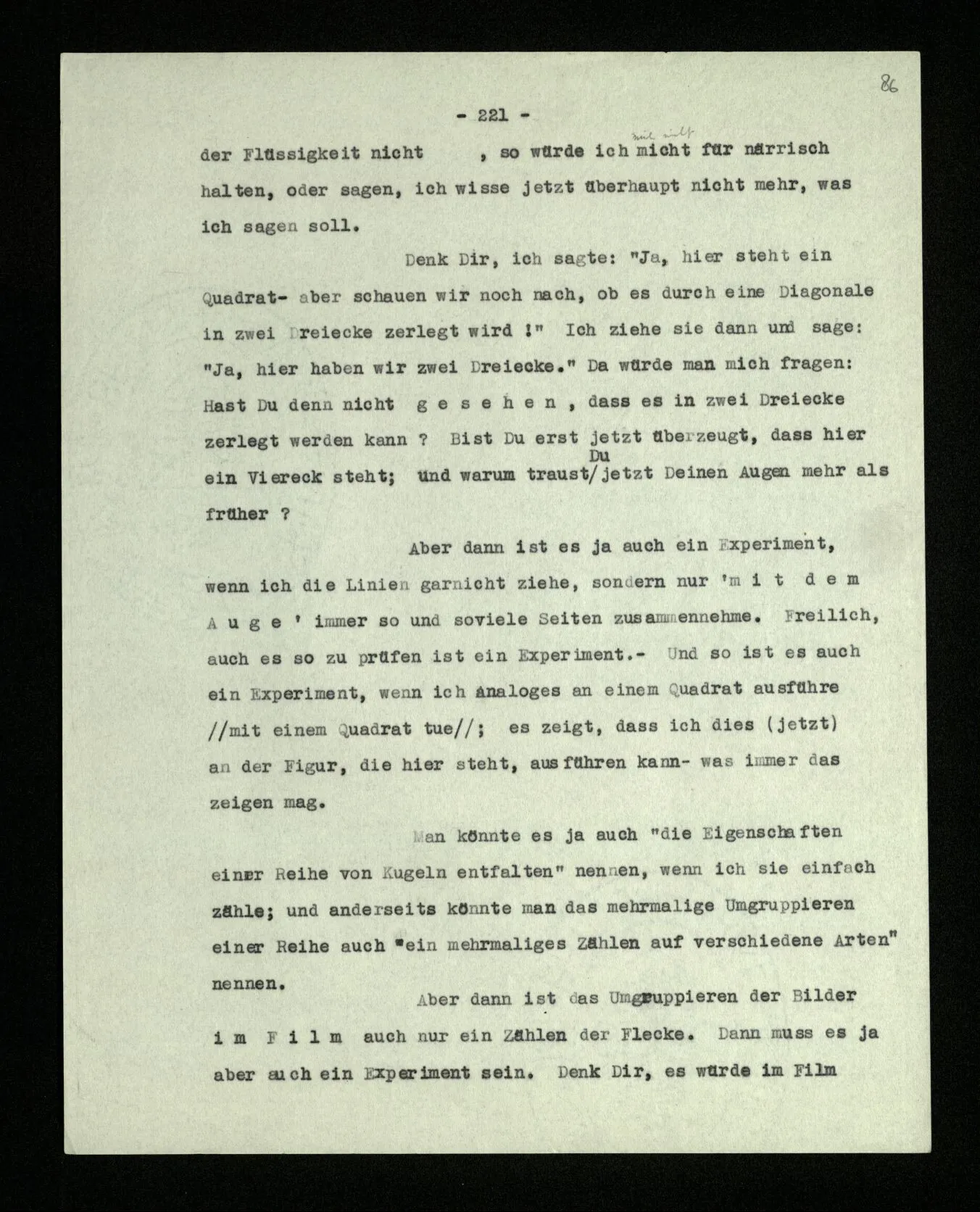 Habe ich gezeigt, daß da ein Fünfeck steht, und war es nur überflüssig? Wenn das Ziehen der Diagonalen hier ein Experiment war, war das ‘Ergebnis’ dasselbe wie im vorigen Fall? Oder: berechtigt mich das Ziehen der Diagonalen nun, zu sagen: “da steht ein Fünfeck”? – Aber kann es mich nicht dazu berechtigen, obwohl ich dieser Berechtigung garnicht bedarf? –