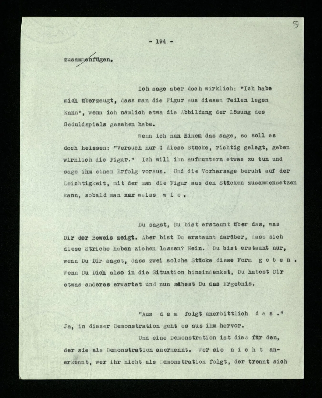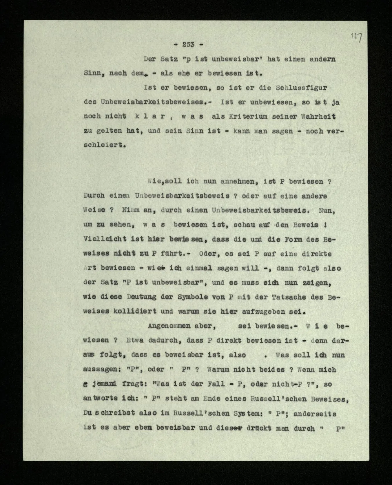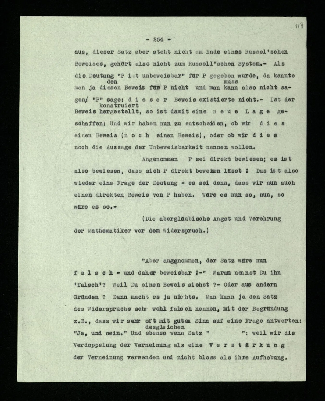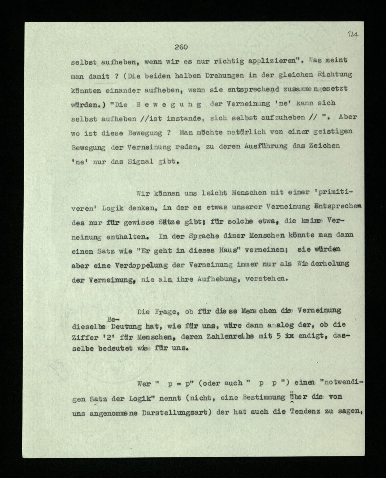 Wir können uns leicht Menschen mit einer ‘primitiveren’ Logik denken, in der es etwas unserer Verneinung Entsprechendes nur für gewisse Sätze gibt; für solche etwa, die keine Verneinung enthalten. In der Sprache dieser Menschen könnte man dann einen Satz wie “Er geht in dieses Haus” verneinen; sie würden aber eine Verdoppelung der Verneinung immer nur als Wiederholung der Verneinung, nie als ihre Aufhebung, verstehen.