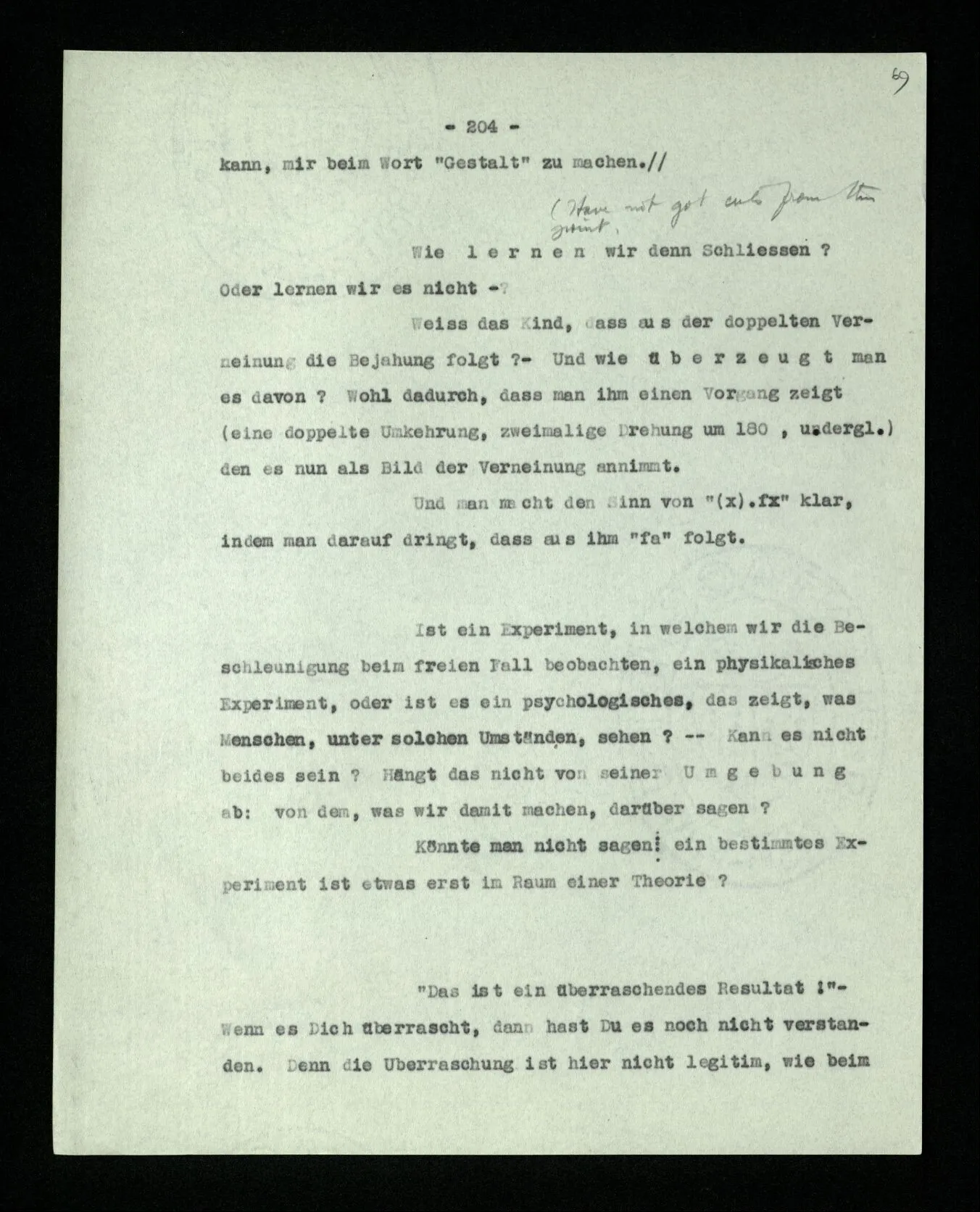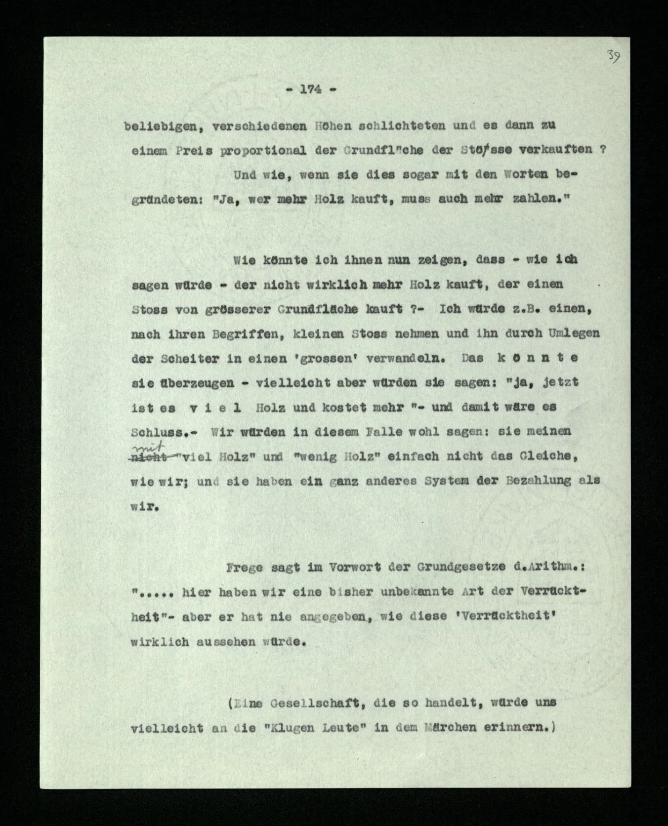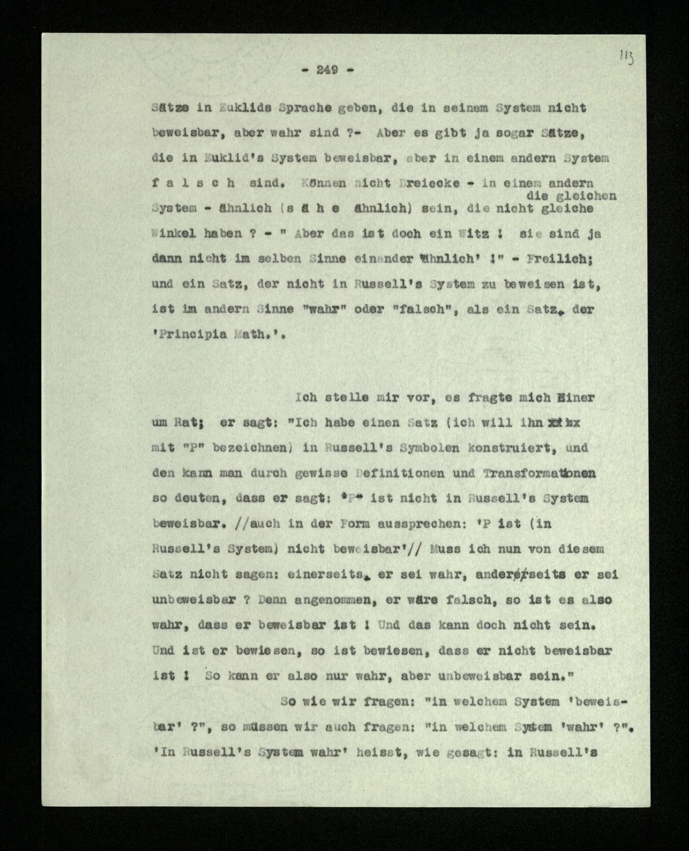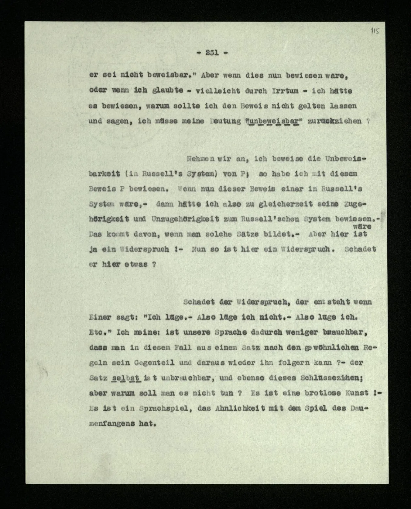 Wir können uns leicht Menschen mit einer ‘primitiveren’ Logik denken, in der es etwas unserer Verneinung Entsprechendes nur für gewisse Sätze gibt; für solche etwa, die keine Verneinung enthalten. In der Sprache dieser Menschen könnte man dann einen Satz wie “Er geht in dieses Haus” verneinen; sie würden aber eine Verdoppelung der Verneinung immer nur als Wiederholung der Verneinung, nie als ihre Aufhebung, verstehen.