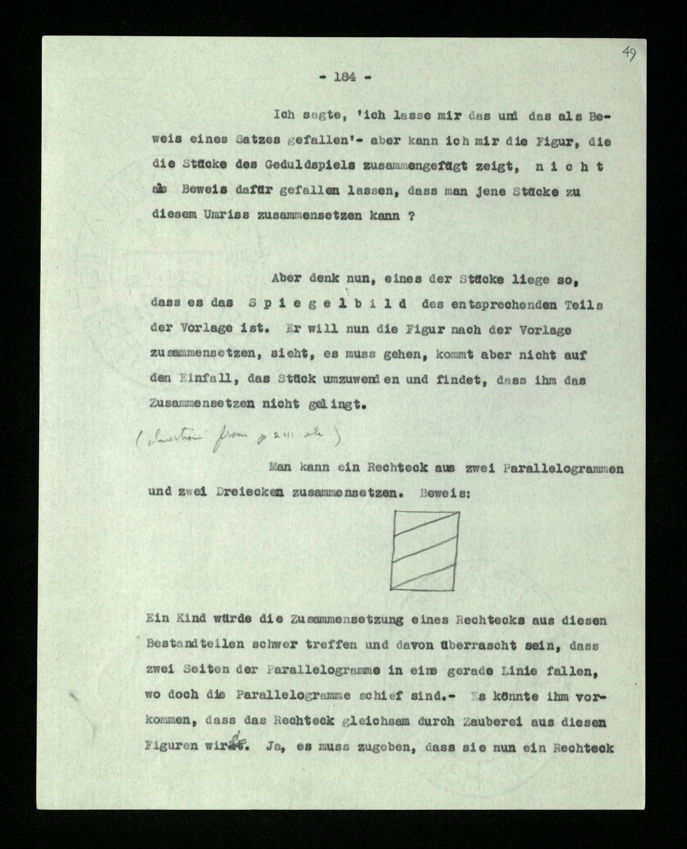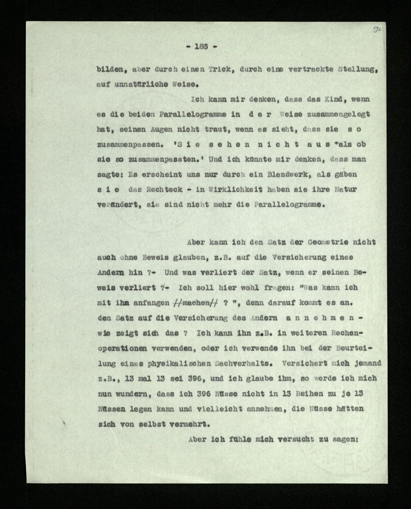 Aber inwiefern mache ich ein Experiment, wenn ich dem schon hingeschriebenen Beweis nur folge? Man könnte sagen: “Wenn Du diese Kette von Umformungen ansiehst, – kommt es Dir nicht auch so vor, als stimmten sie mit den Paradigmen?”