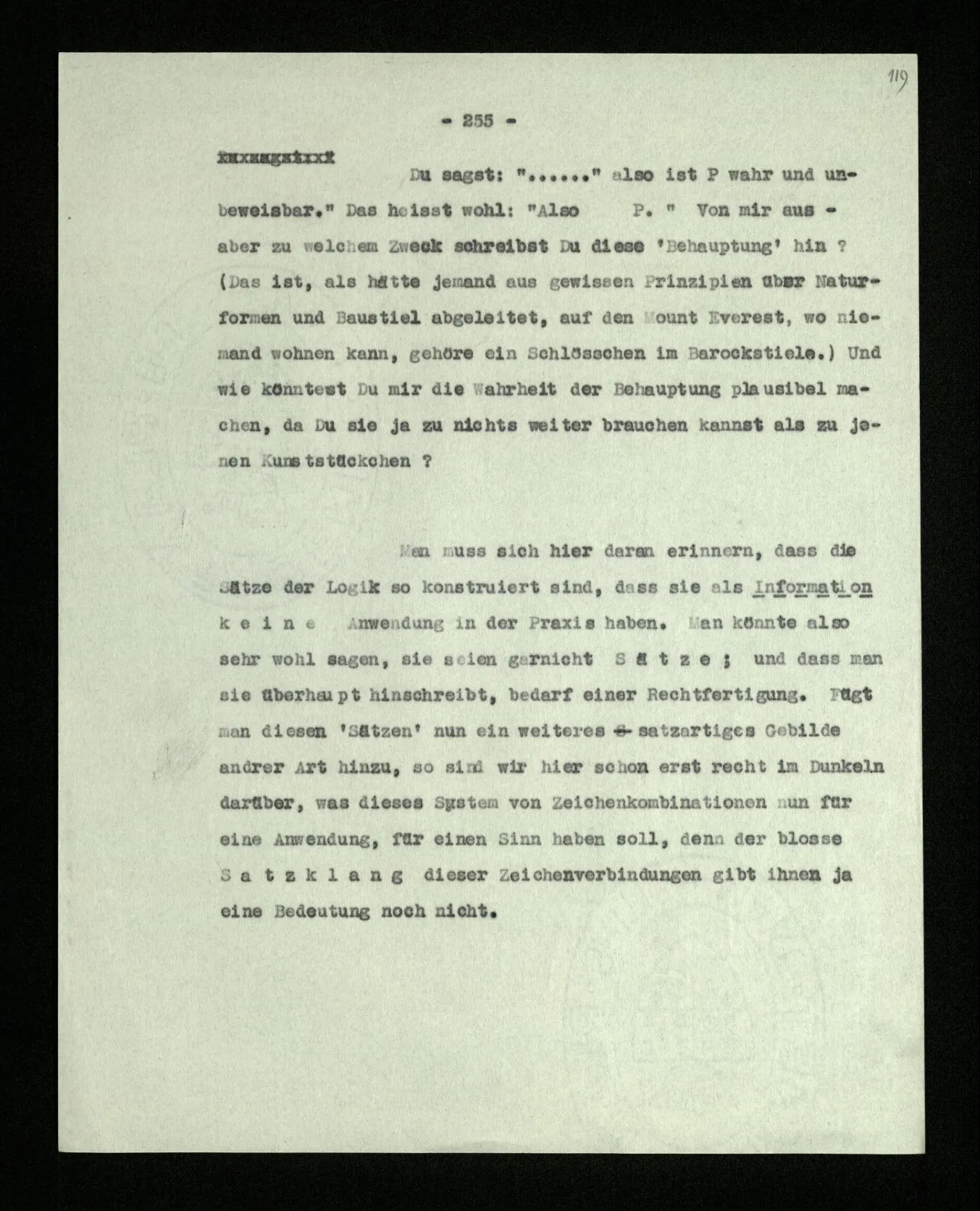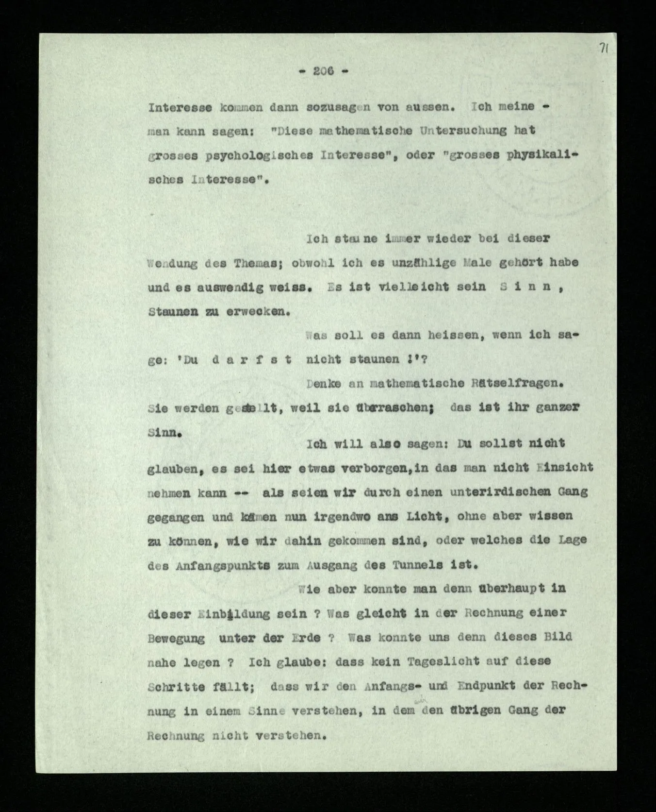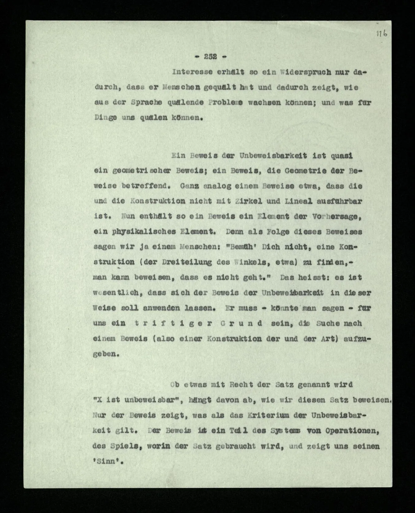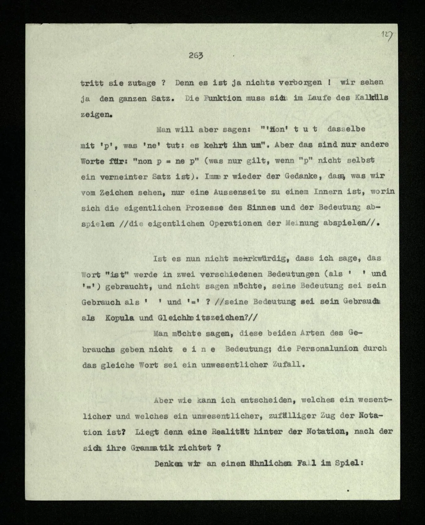 Man möchte etwa von der Funktion des Wortes in diesem Satz reden. Aber worin besteht diese Funktion? Wie tritt sie zutage? Denn es ist ja nichts verborgen! wir sehen ja den ganzen Satz. Die Funktion muß sich im Laufe des Kalküls zeigen. Man will aber sagen: “‘non’ tut dasselbe mit ‘p’, was ‘ne’ tut: es kehrt ihn um”. Aber das sind nur andere Worte für: “non p = ne p” (was nur gilt, wenn “p” nicht selbst ein verneinter Satz ist). Immer wieder der Gedanke, daß, was wir vom Zeichen sehen, nur eine Außenseite zu einem Innern ist, worin sich die eigentlichen Prozesse des Sinnes und der Bedeutung abspielen.