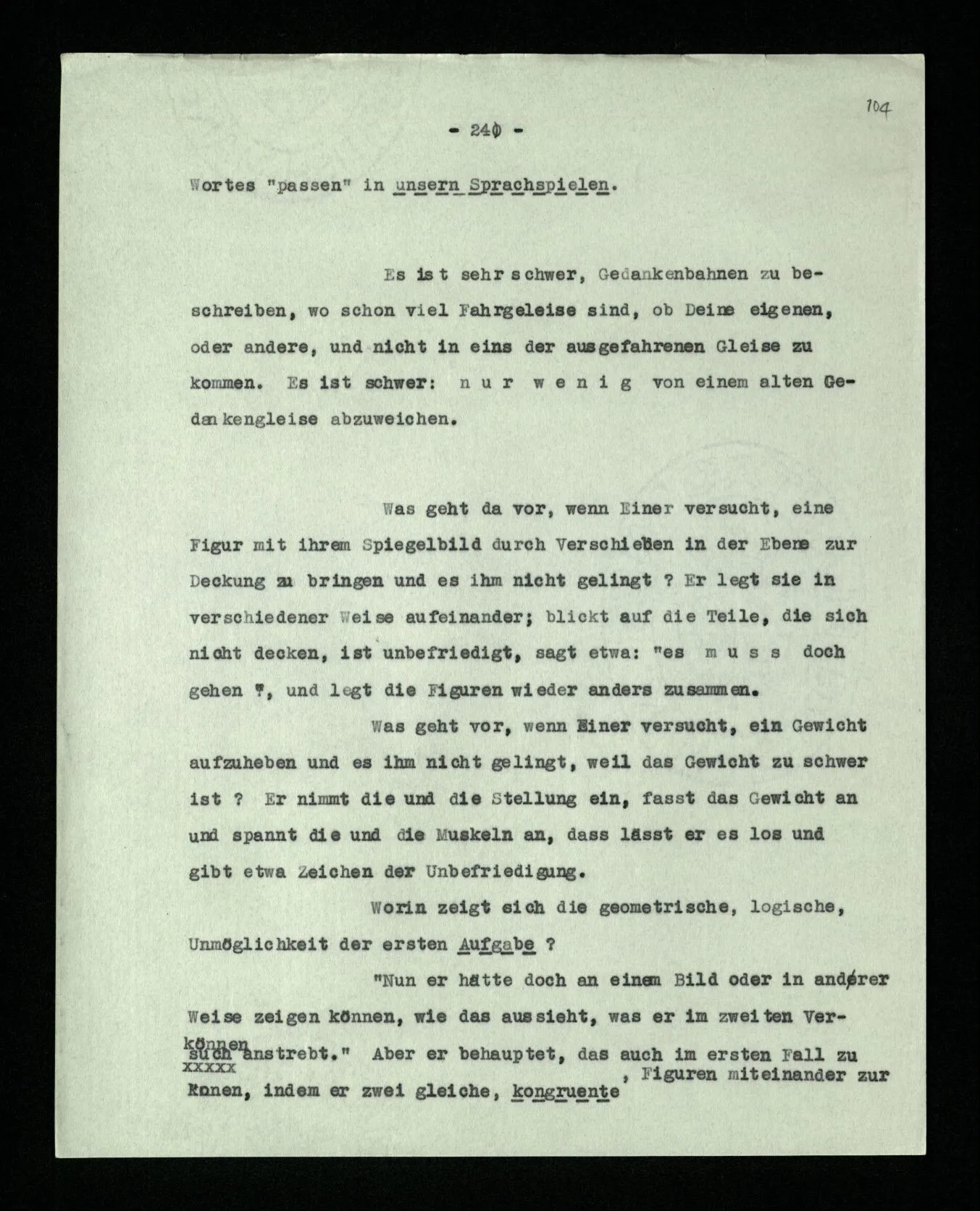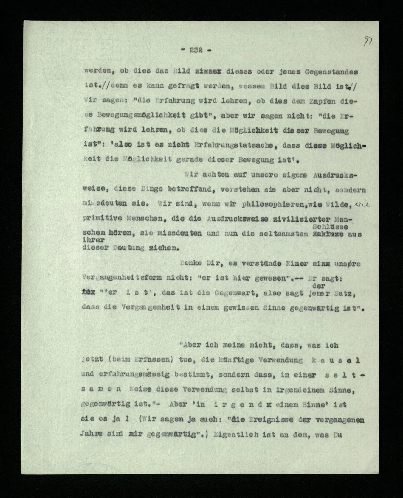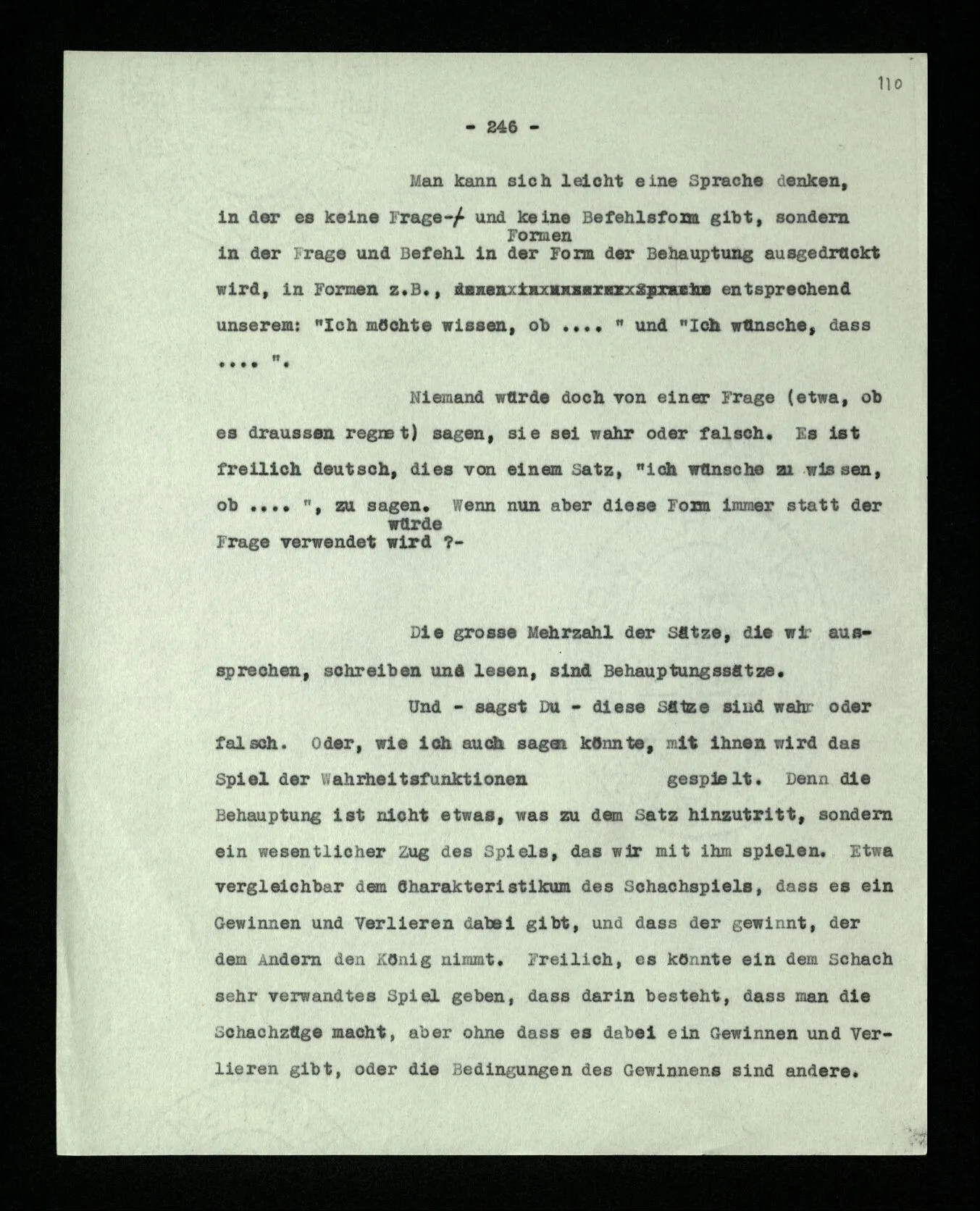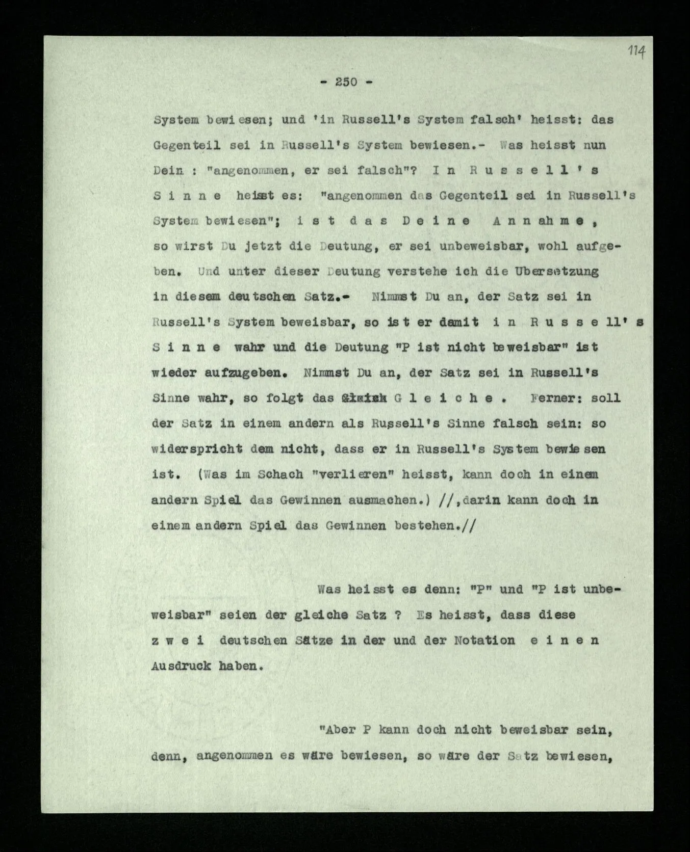 Man möchte etwa von der Funktion des Wortes in diesem Satz reden. Aber worin besteht diese Funktion? Wie tritt sie zutage? Denn es ist ja nichts verborgen! wir sehen ja den ganzen Satz. Die Funktion muß sich im Laufe des Kalküls zeigen. Man will aber sagen: “‘non’ tut dasselbe mit ‘p’, was ‘ne’ tut: es kehrt ihn um”. Aber das sind nur andere Worte für: “non p = ne p” (was nur gilt, wenn “p” nicht selbst ein verneinter Satz ist). Immer wieder der Gedanke, daß, was wir vom Zeichen sehen, nur eine Außenseite zu einem Innern ist, worin sich die eigentlichen Prozesse des Sinnes und der Bedeutung abspielen.