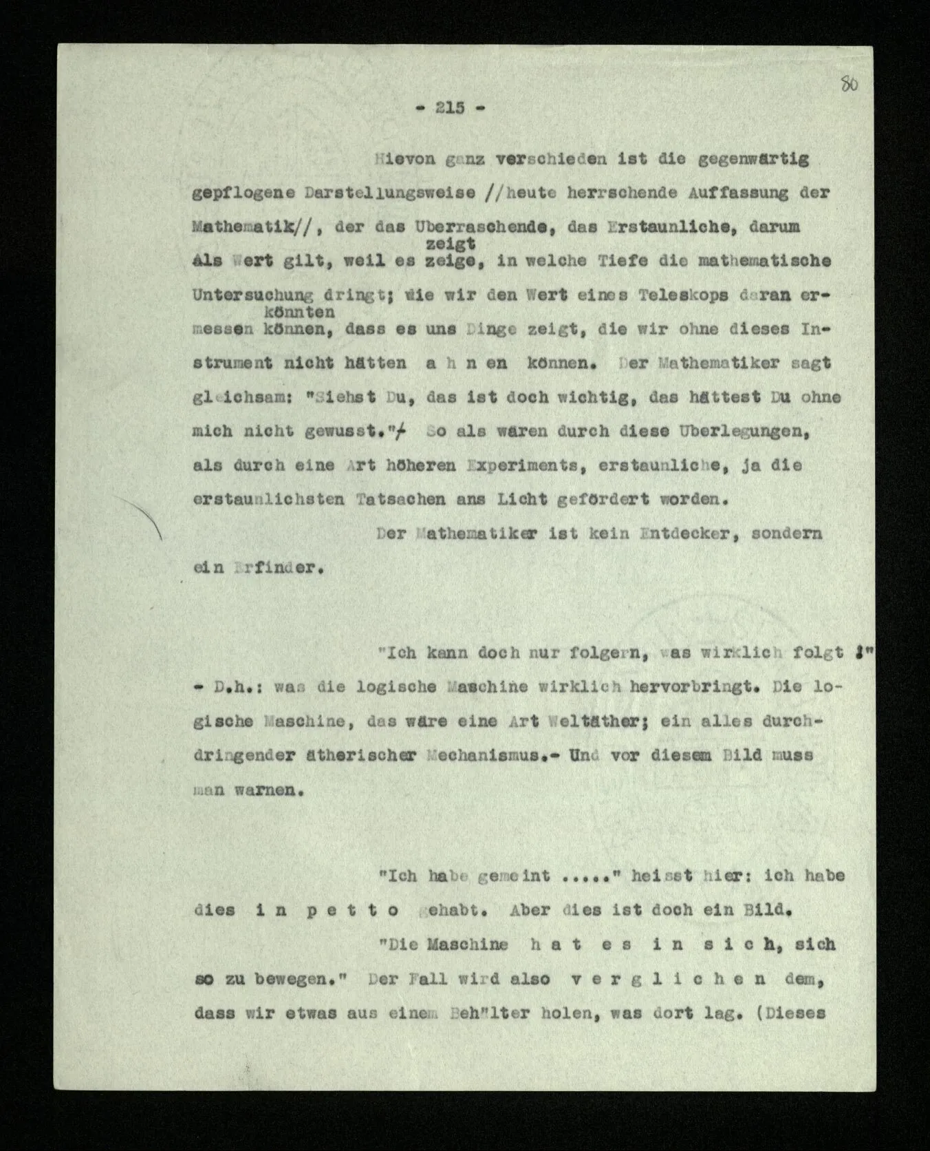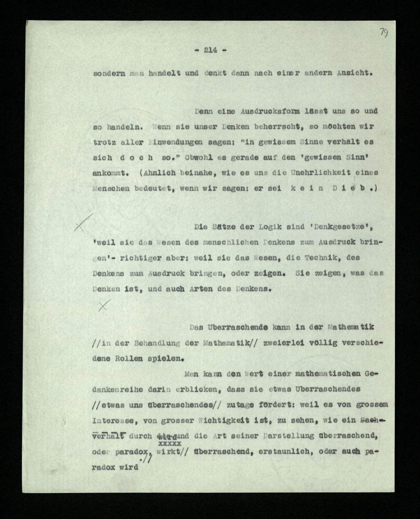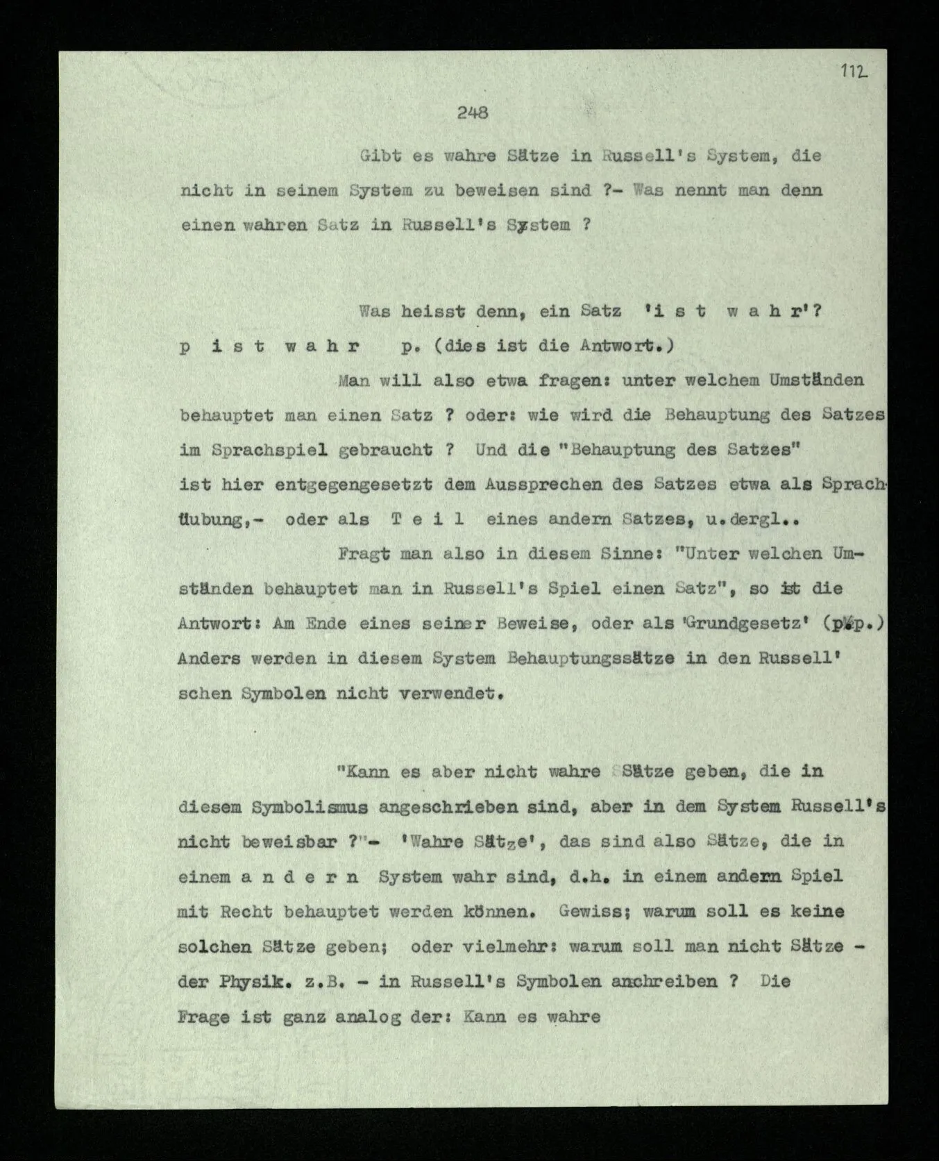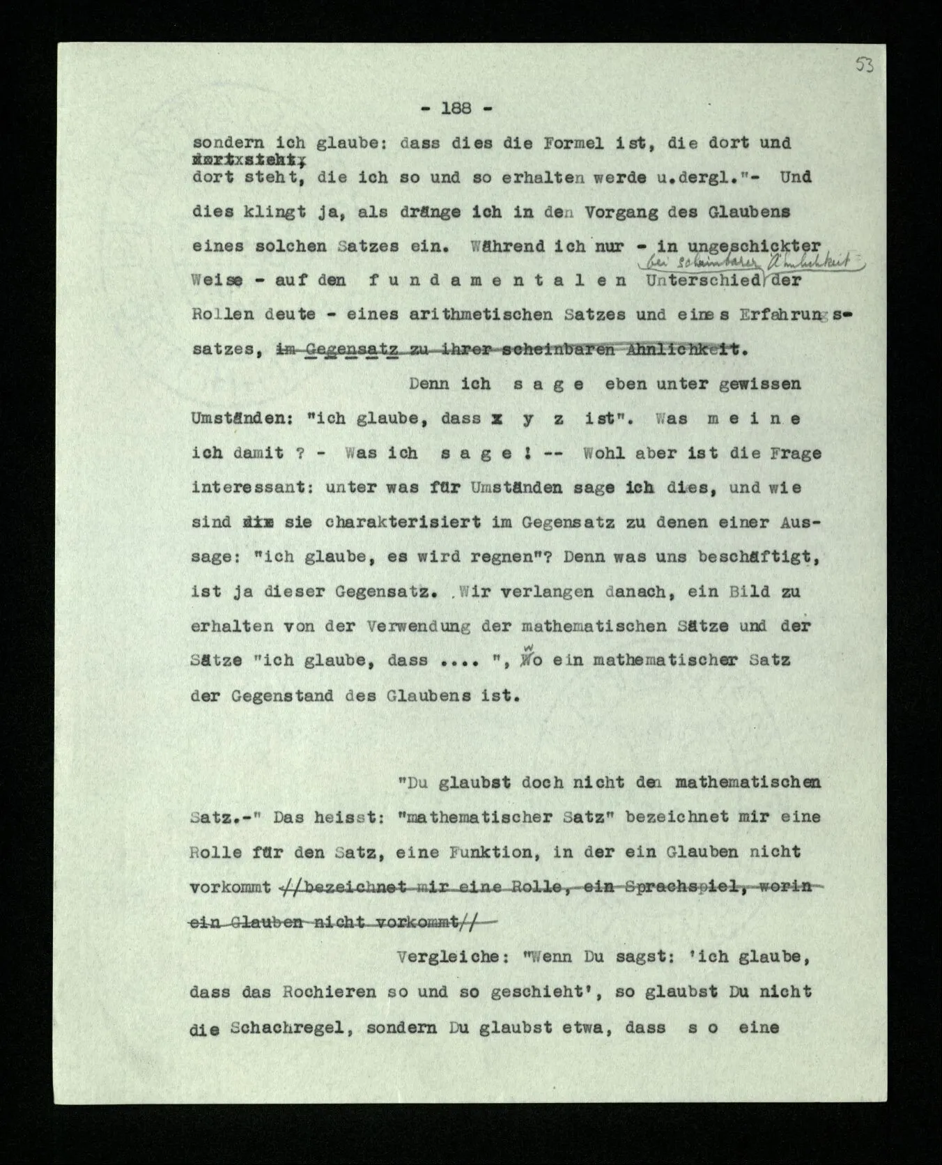 Man möchte etwa von der Funktion des Wortes in diesem Satz reden. Aber worin besteht diese Funktion? Wie tritt sie zutage? Denn es ist ja nichts verborgen! wir sehen ja den ganzen Satz. Die Funktion muß sich im Laufe des Kalküls zeigen. Man will aber sagen: “‘non’ tut dasselbe mit ‘p’, was ‘ne’ tut: es kehrt ihn um”. Aber das sind nur andere Worte für: “non p = ne p” (was nur gilt, wenn “p” nicht selbst ein verneinter Satz ist). Immer wieder der Gedanke, daß, was wir vom Zeichen sehen, nur eine Außenseite zu einem Innern ist, worin sich die eigentlichen Prozesse des Sinnes und der Bedeutung abspielen.