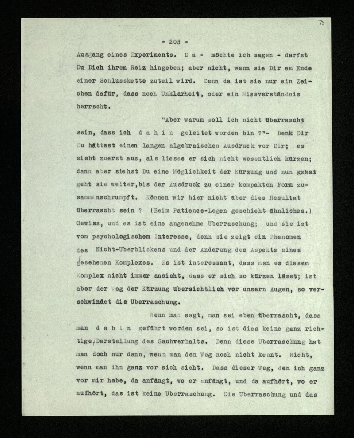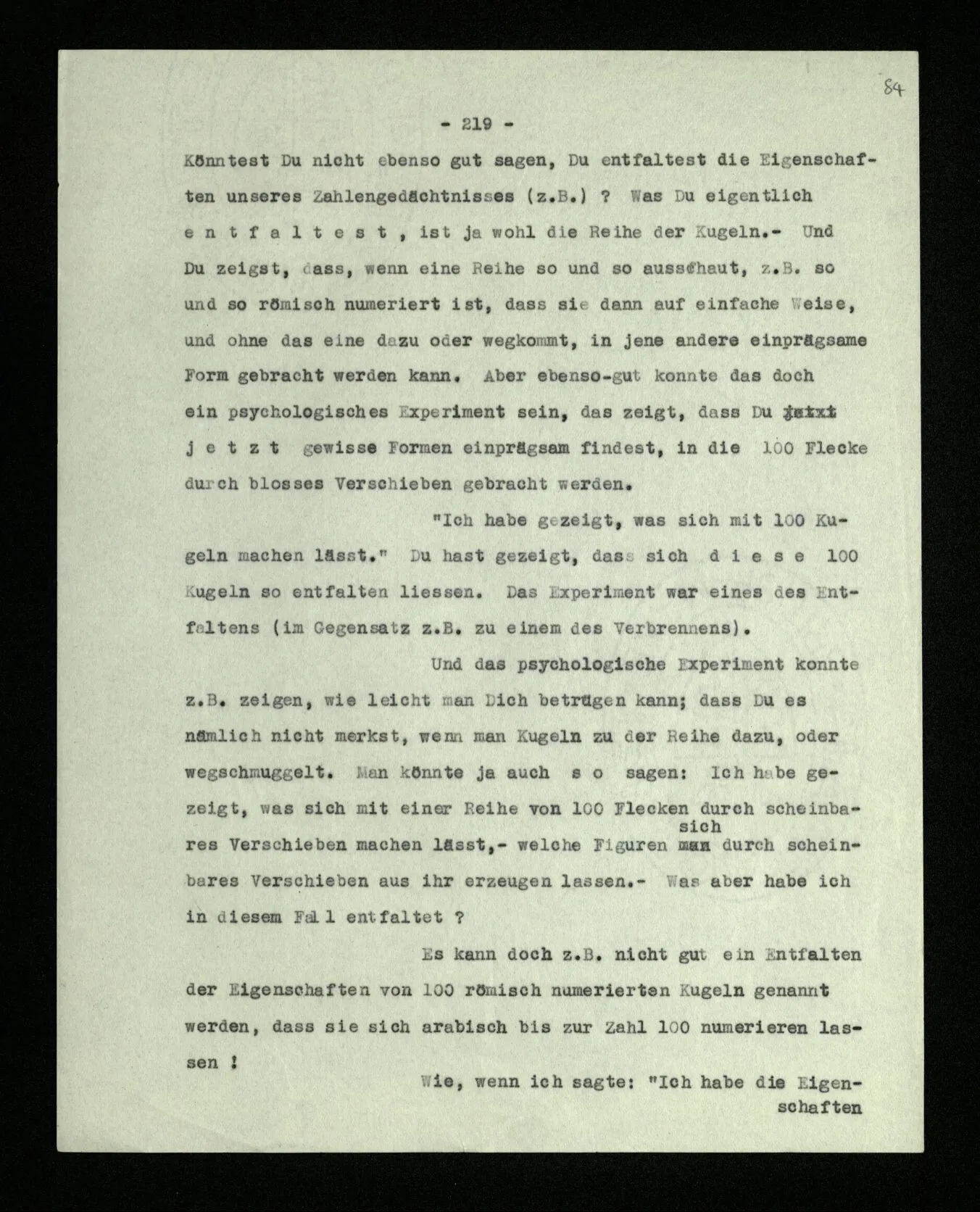 Wenn das also ein Experiment genannt werden soll, dann wohl ein psychologisches. – Der Anschein des Stimmens kann ja auf einer Sinnestäuschung beruhen. Und so ist es ja auch manchmal, wenn wir uns verrechnen. Man sagt auch: “Das kommt mir heraus.” Und es ist doch wohl ein Experiment, das zeigt, daß dies mir herauskommt.