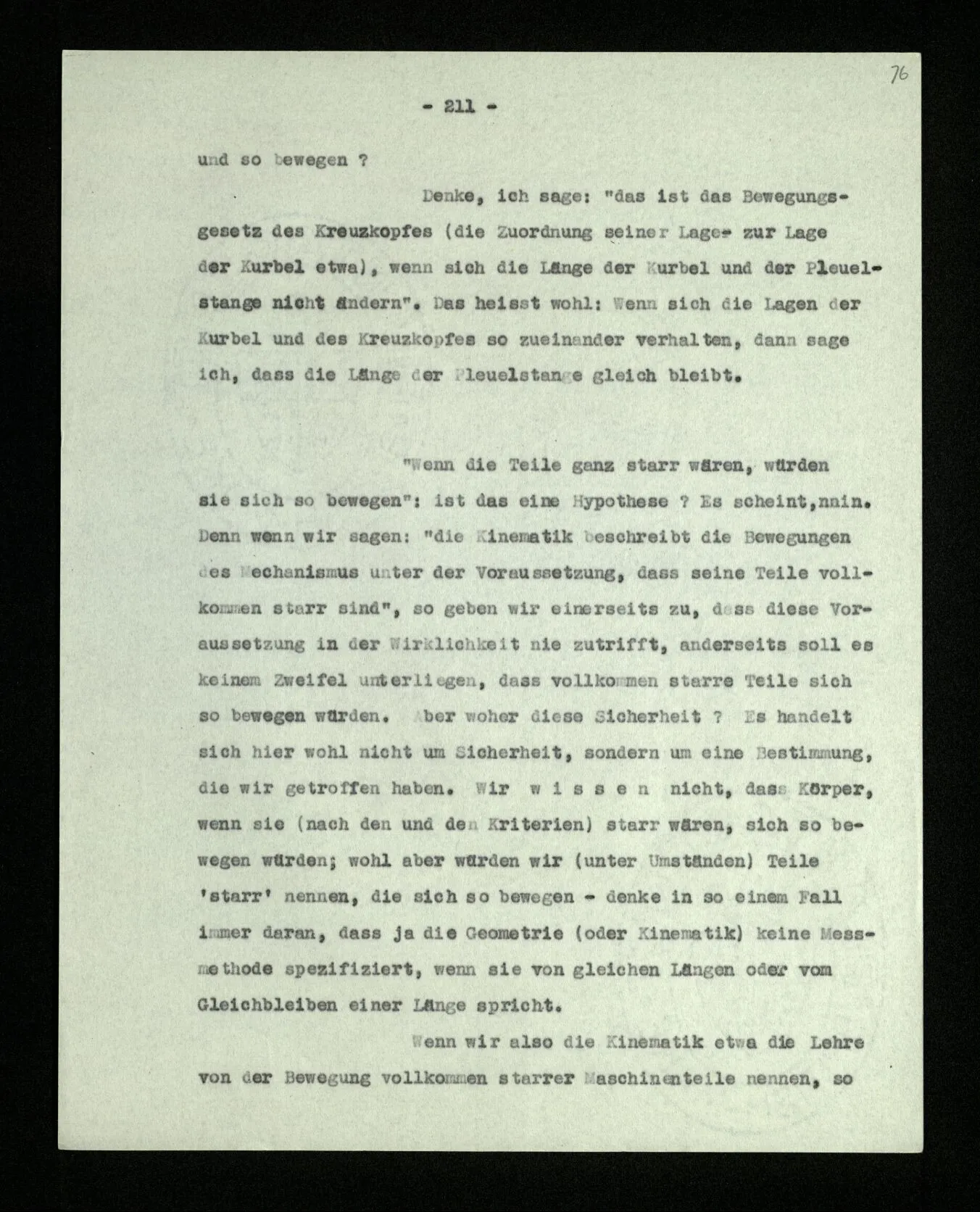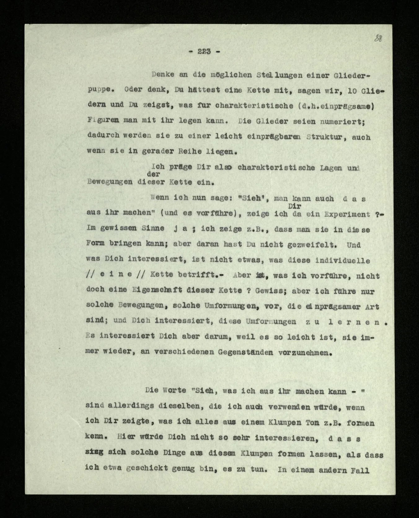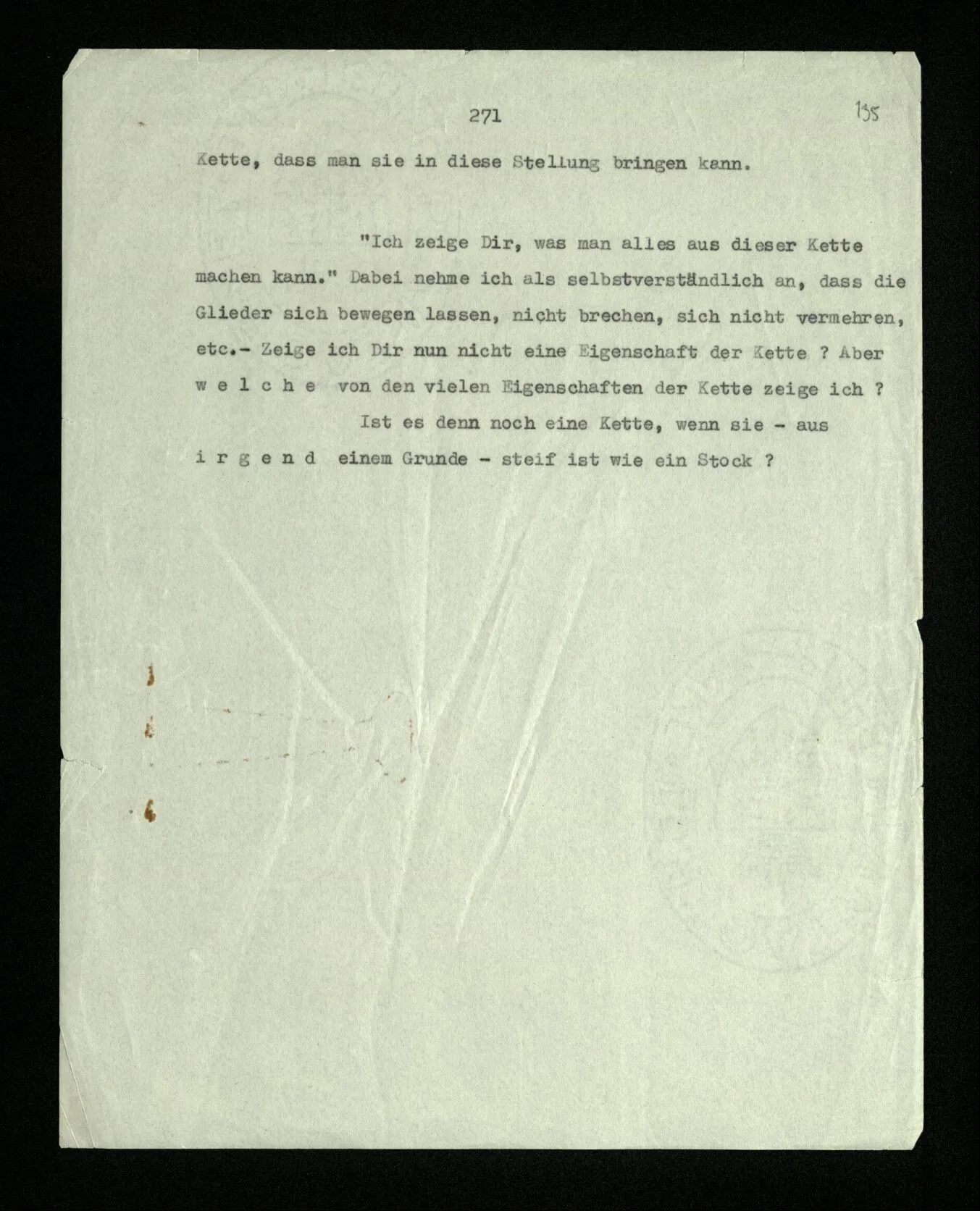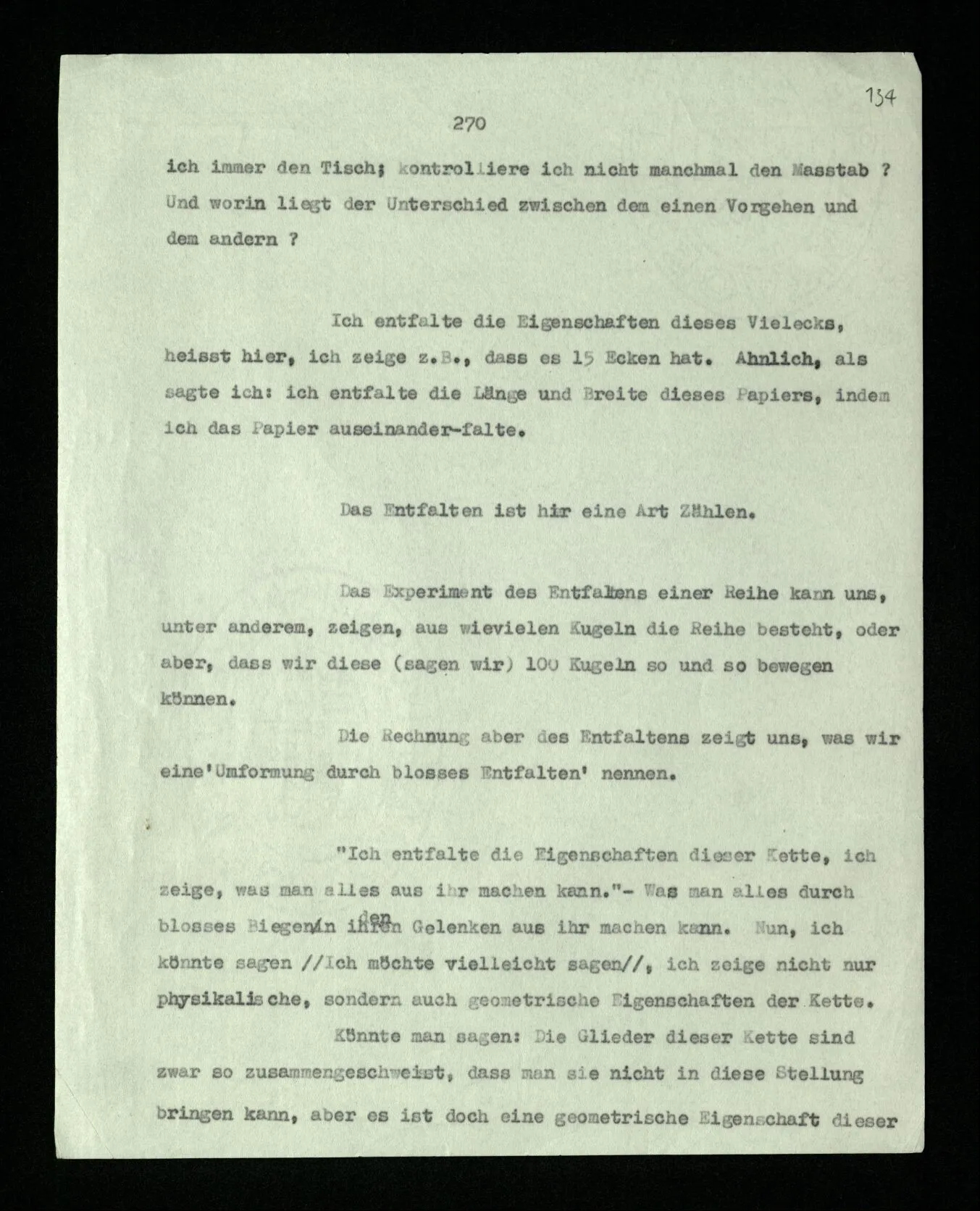 “Ich entfalte die Eigenschaften dieser Kette, ich zeige, was man alles aus ihr machen kann.” – Was man alles durch bloßes Biegen in ihren Gelenken aus ihr machen kann. Nun, ich könnte sagen, ich zeige nicht nur physikalische, sondern auch geometrische Eigenschaften der Kette. Könnte man sagen: Die Glieder dieser Kette sind zwar so zusammengeschweißt, daß man sie nicht in diese Stellung bringen kann, aber es ist doch eine geometrische Eigenschaft dieser Kette, daß man sie in diese Stellung bringen kann.