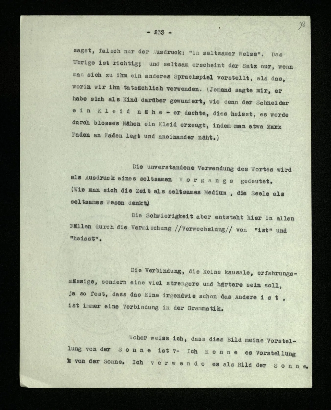 Ist es nun nicht merkwürdig, daß ich sage, das Wort “ist” werde in zwei verschiedenen Bedeutungen (als ‘ε’ und ‘ = ’) gebraucht, und nicht sagen möchte, seine Bedeutung sei sein Gebrauch als ‘ε’ und ‘ = ’? Man möchte sagen, diese beiden Arten des Gebrauchs geben nicht eine Bedeutung; die Personalunion durch das gleiche Wort sei ein unwesentlicher Zufall.