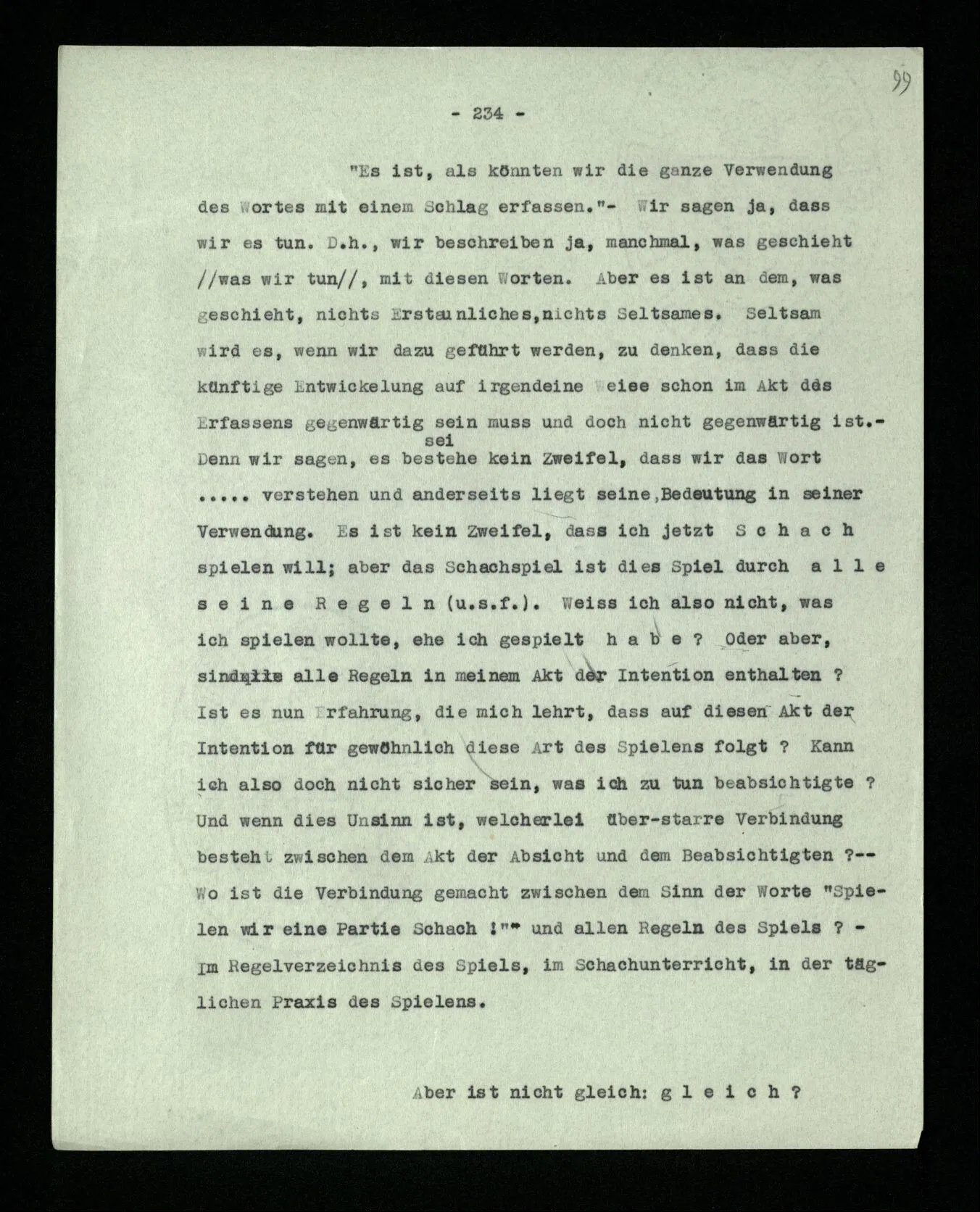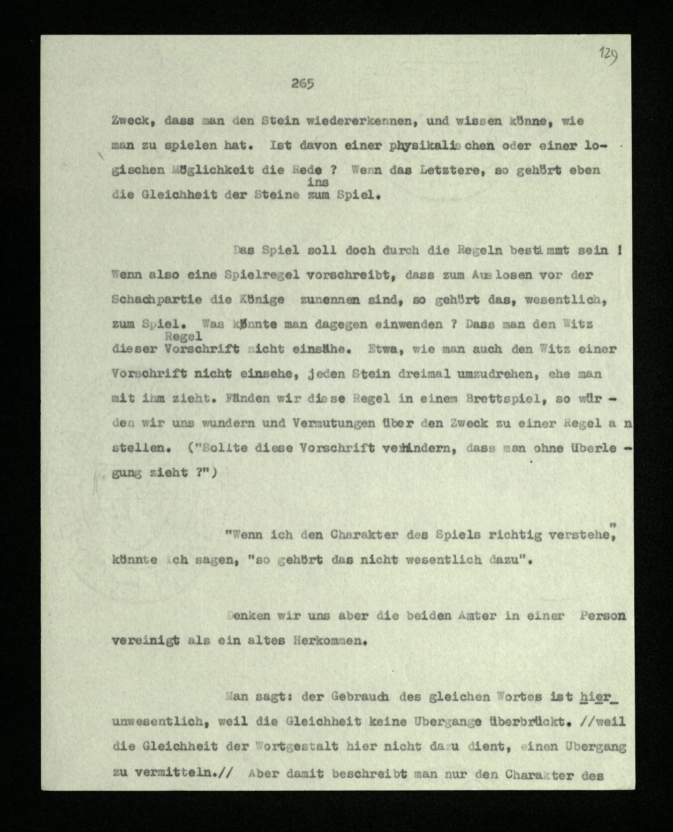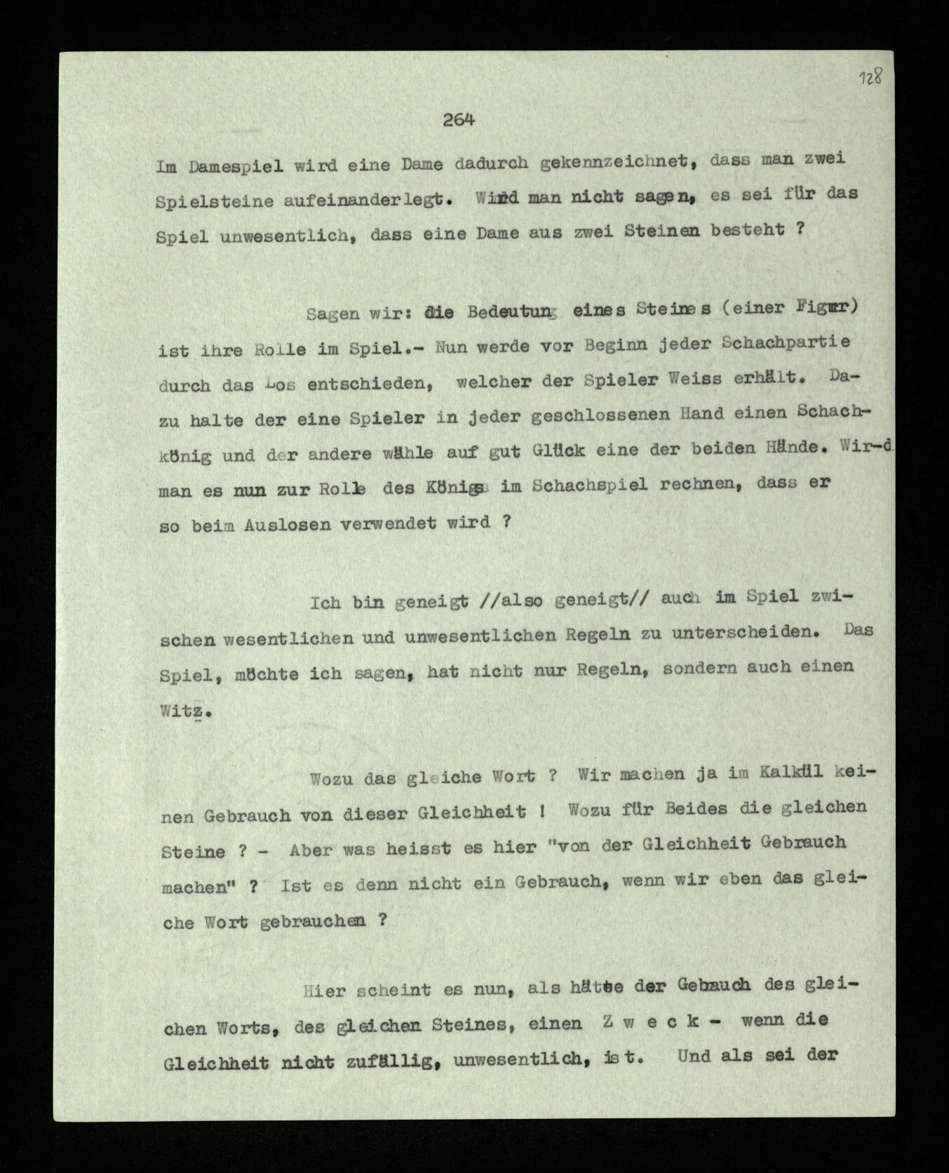 Das Spiel soll doch durch die Regeln bestimmt sein! Wenn also eine Spielregel vorschreibt, daß zum Auslosen vor der Schachpartie die Könige zu nehmen sind, so gehört das, wesentlich, zum Spiel. Was könnte man dagegen einwenden? Daß man den Witz dieser Vorschrift nicht einsähe. Etwa, wie man auch den Witz einer Vorschrift nicht einsähe, jeden Stein dreimal umzudrehen, ehe man mit ihm zieht. Fänden wir diese Regel in einem Brettspiel, so würden wir uns wundern und Vermutungen über den Zweck zu einer Regel anstellen. (“Sollte diese Vorschrift verhindern, daß man ohne Überlegung zieht?”)
