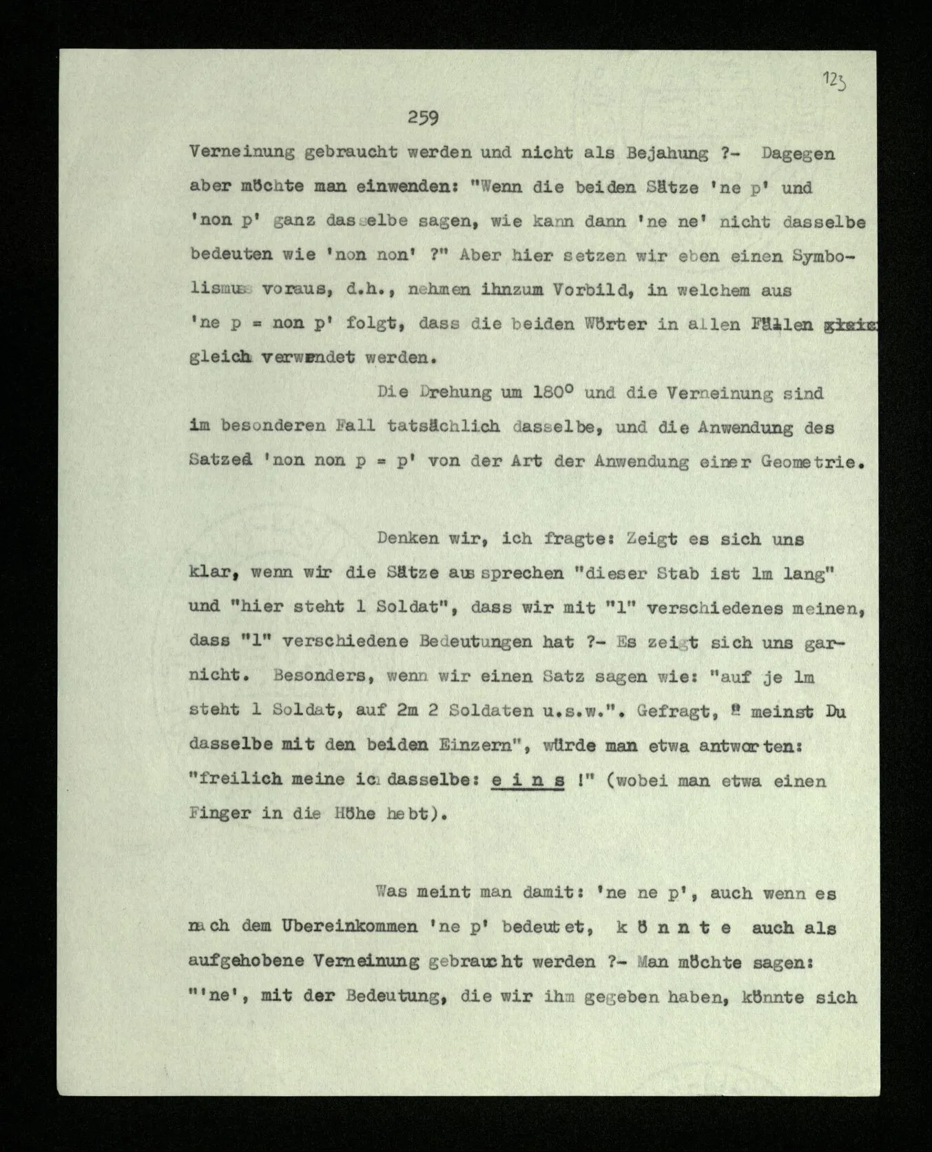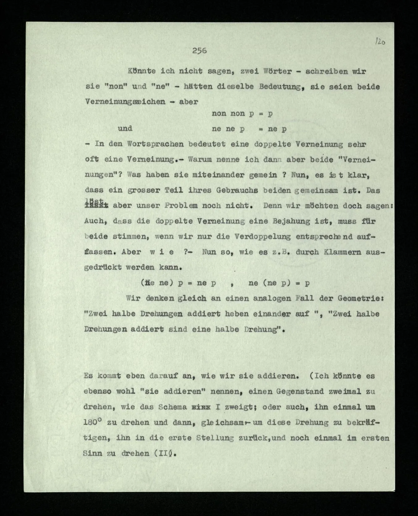 Soll ich nun sagen: die Bedeutung von “non” und “ne” sei etwas verschieden? Sie seien verschiedene Abarten der Verneinung? – Das würde niemand sagen. Denn, würde man einwenden, heißt dann “geh nicht in dieses Zimmer!” vielleicht nicht genau dasselbe, wenn wir die Regel aufstellen “nicht nicht” solle als Verneinung gebraucht werden und nicht als Bejahung? – Dagegen aber möchte man einwenden: “Wenn die beiden Sätze ‘ne p’ und ‘non p’ ganz dasselbe sagen, wie kann dann ‘ne ne’ nicht dasselbe bedeuten wie ‘non non’?” Aber hier setzen wir eben einen Symbolismus voraus, d.h., nehmen ihn zum Vorbild, in welchem aus ‘ne p = non p’ folgt, daß die beiden Wörter in allen Fällen gleich verwendet werden. Die Drehung um 180˚ und die Verneinung sind im besonderen Fall tatsächlich dasselbe, und die Anwendung des Satzes ‘non non p = p’ von der Art der Anwendung einer Geometrie.
