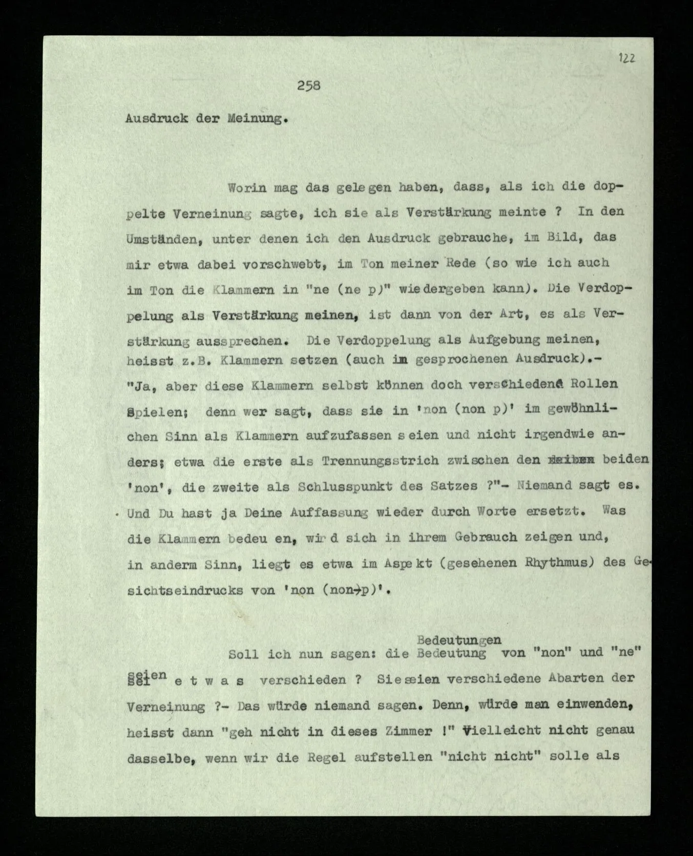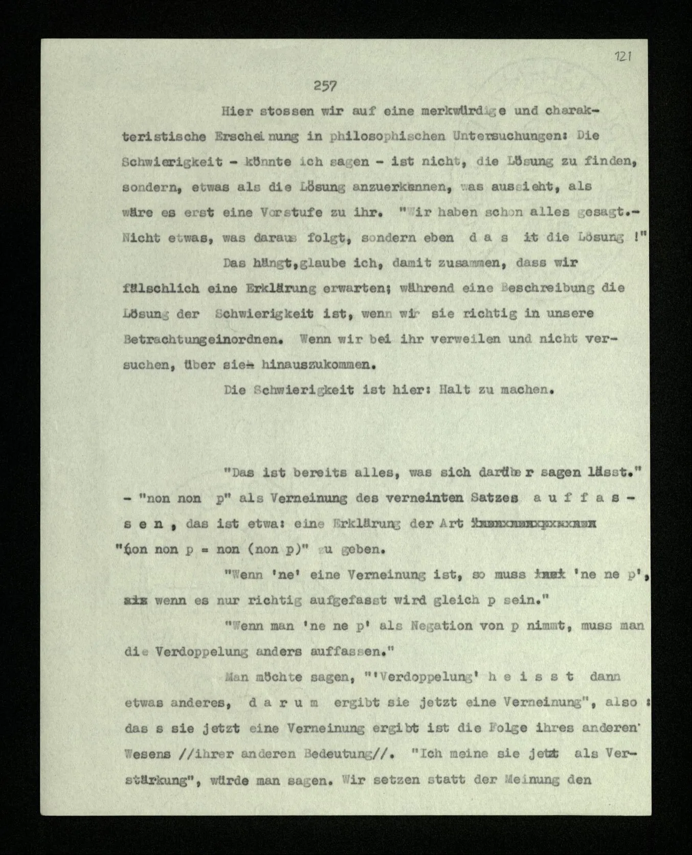 Worin mag das gelegen haben, daß, als ich die doppelte Verneinung sagte, ich sie als Verstärkung meinte? In den Umständen, unter denen ich den Ausdruck gebrauche, im Bild, das mir etwa dabei vorschwebt, im Ton meiner Rede (so wie ich auch im Ton die Klammern in “ne (ne p)” wiedergeben kann). Die Verdoppelung als Verstärkung meinen, ist dann von der Art, es als Verstärkung aussprechen. Die Verdoppelung als Aufhebung meinen, heißt z.B. Klammern setzen (auch im gesprochenen Ausdruck). – “Ja, aber diese Klammern selbst können doch verschiedene Rollen spielen; denn wer sagt, daß sie in ‘non (non p)’ im gewöhnlichen Sinn als Klammern aufzufassen seien und nicht irgendwie anders; etwa die erste als Trennungsstrich zwischen den beiden ‘non’, die zweite als Schlußpunkt des Satzes?” – Niemand sagt es. Und Du hast ja Deine Auffassung wieder durch Worte ersetzt. Was die Klammern bedeuten, wird sich in ihrem Gebrauch zeigen und, in anderm Sinn, liegt es etwa im Aspekt (gesehenen Rhythmus) des Gesichtseindrucks von ‘non (non-p)’.