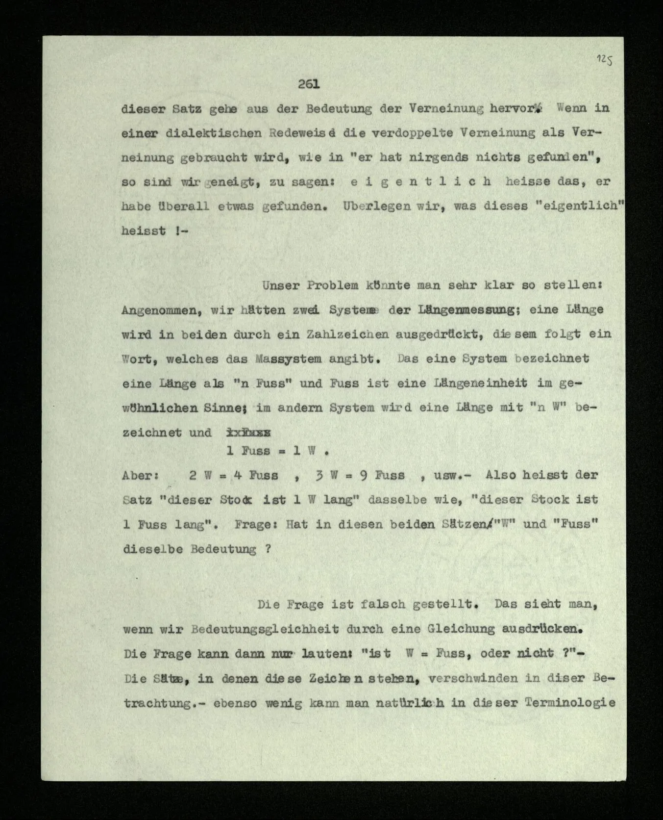 Unser Problem könnte man sehr klar so stellen: Angenommen, wir hätten zwei Systeme der Längenmessung; eine Länge wird in beiden durch ein Zahlzeichen ausgedrückt, diesem folgt ein Wort, welches das Maßsystem angibt. Das eine System bezeichnet eine Länge als “n Fuß” und Fuß ist eine Längeneinheit im gewöhnlichen Sinne; im andern System wird eine Länge mit “n W” bezeichnet und