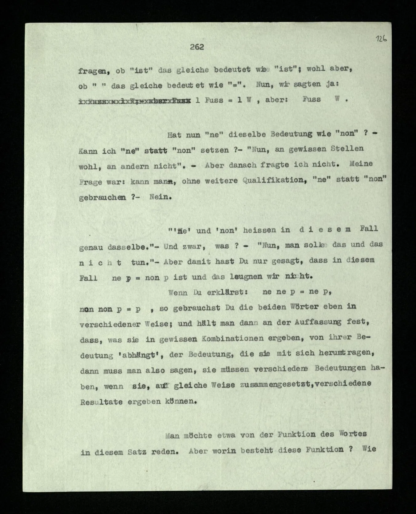 “‘ne’ und ‘non’ heißen in diesem Fall genau dasselbe.” – Und zwar, was? – “Nun, man solle das und das nicht tun.” – Aber damit hast Du nur gesagt, daß in diesem Fall ne p = non p ist und das leugnen wir nicht. Wenn Du erklärst ne ne p = ne p, non non p = p, so gebrauchst Du die beiden Wörter eben in verschiedener Weise; und hält man dann an der Auffassung fest, daß, was sie in gewissen Kombinationen ergeben, von ihrer Bedeutung ‘abhängt’, der Bedeutung, die sie mit sich herumtragen, dann muß man also sagen, sie müssen verschiedene Bedeutungen haben, wenn sie, auf gleiche Weise zusammengesetzt, verschiedene Resultate ergeben können.