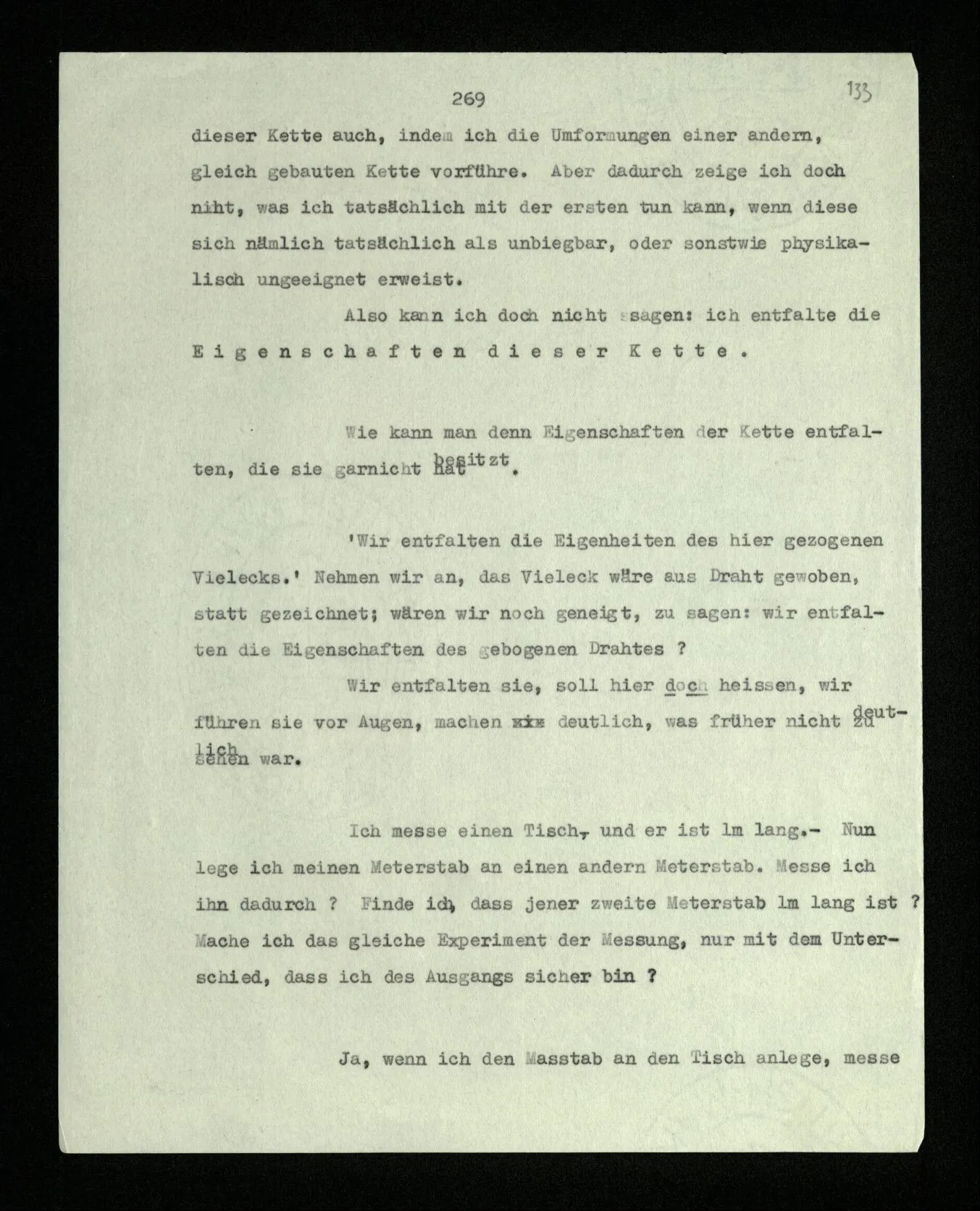 Ich entfalte doch die geometrischen Eigenschaften dieser Kette auch, indem ich die Umformungen einer andern, gleich gebauten Kette vorführe. Aber dadurch zeige ich doch nicht, was ich tatsächlich mit der ersten tun kann, wenn diese sich nämlich tatsächlich als unbiegbar, oder sonstwie physikalisch ungeeignet erweist. Also kann ich doch nicht sagen: ich entfalte die Eigenschaften dieser Kette.