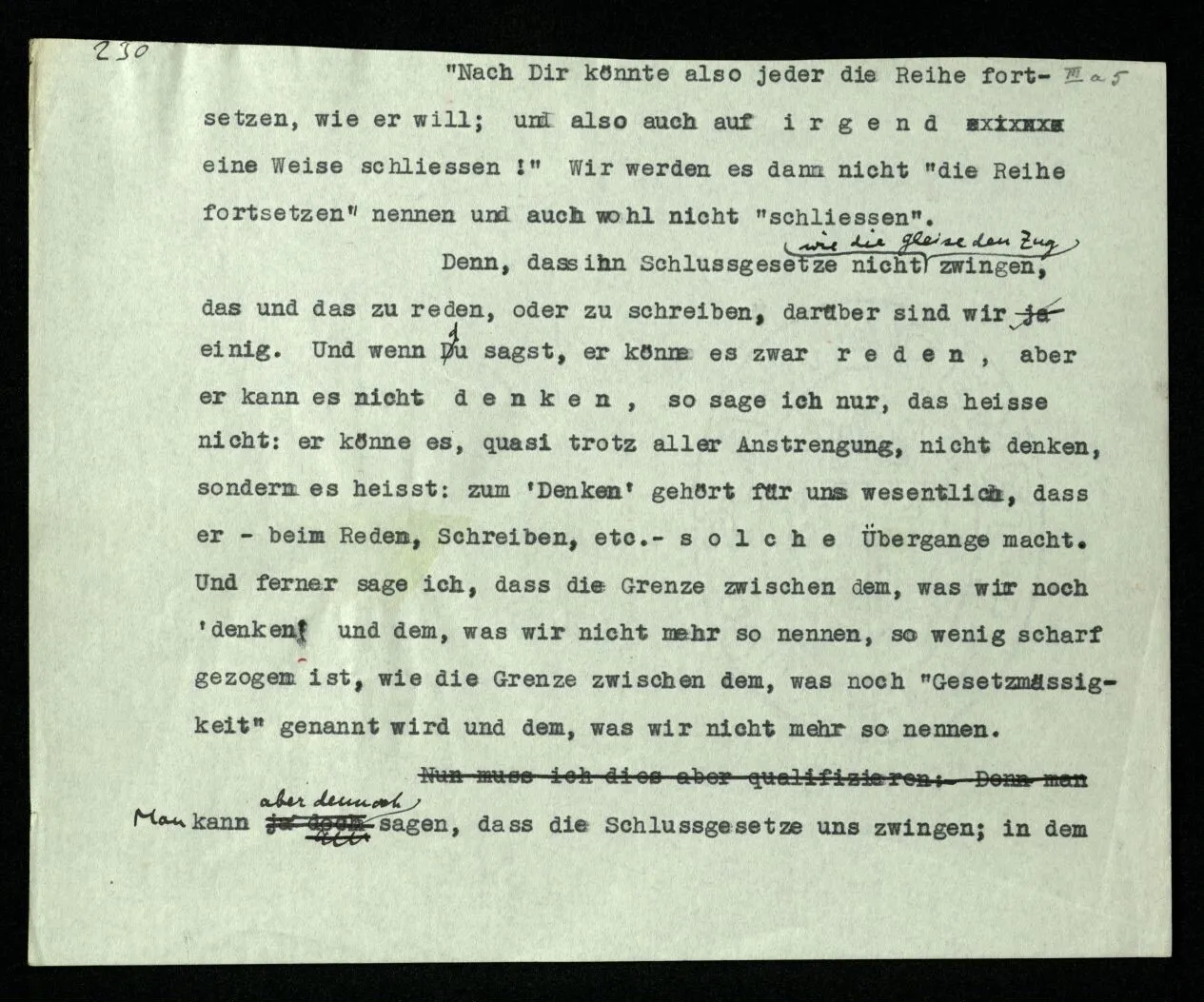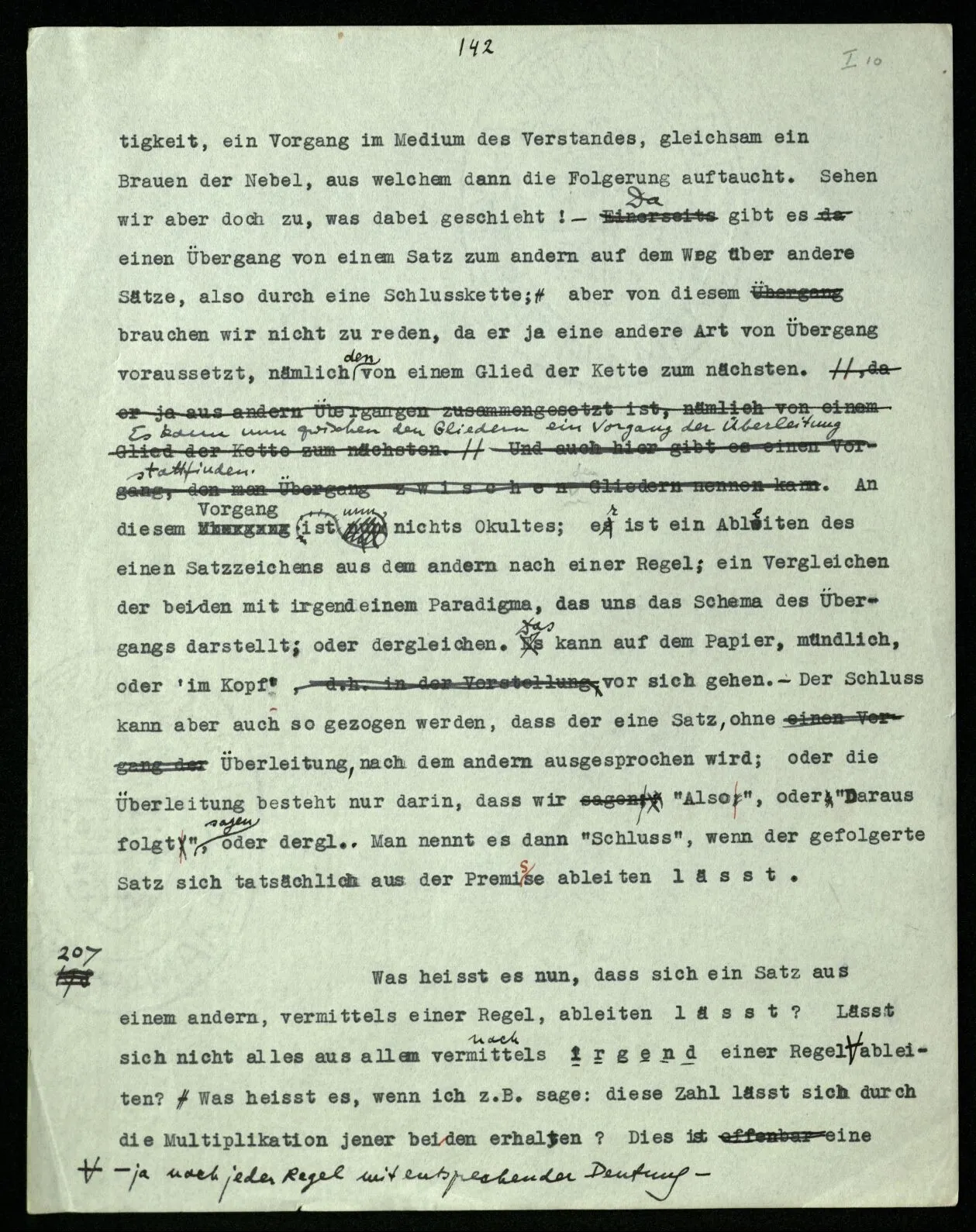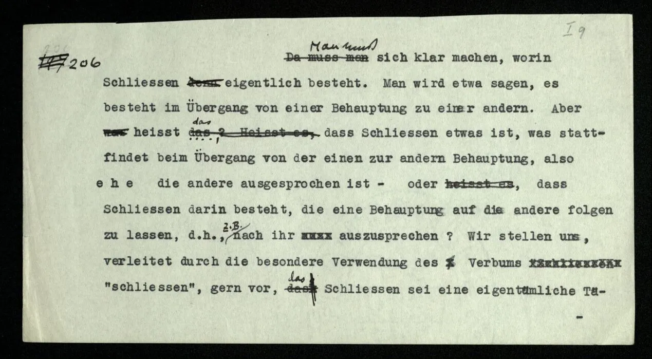 206 Man muß sich klar machen, worin Schließen eigentlich besteht. Man wird etwa sagen, es besteht im Übergang von einer Behauptung zu einer andern. Aber heißt das, daß Schließen etwas ist, was stattfindet beim Übergang von der einen zur andern Behauptung, also ehe die andere ausgesprochen ist – oder, daß Schließen darin besteht, die eine Behauptung auf die andere folgen zu lassen, d.h., z.B. nach ihr auszusprechen? Wir stellen uns, verleitet durch die besondere Verwendung des Verbums “schließen”, gern vor, das Schließen sei eine eigentümliche Tätigkeit, ein Vorgang im Medium des Verstandes, gleichsam ein Brauen der Nebel, aus welchem dann die Folgerung auftaucht. Sehen wir aber doch zu, was dabei geschieht! – Da gibt es einen Übergang von einem Satz zum andern auf dem Weg über andere Sätze, also durch eine Schlußkette, aber von diesem brauchen wir nicht zu reden, da er ja eine andere Art von Übergang voraussetzt, nämlich den von einem Glied der Kette zum nächsten. Es kann nun zwischen den Gliedern ein Vorgang der Überleitung stattfinden. An diesem Vorgang ist nun nichts Okkultes; er ist ein Ableiten des einen Satzzeichens aus dem andern nach einer Regel; ein Vergleichen der beiden mit irgendeinem Paradigma, das uns das Schema des Übergangs darstellt; oder dergleichen. Das kann auf dem Papier, mündlich, oder ‘im Kopf’ vor sich gehen. – Der Schluß kann aber auch so gezogen werden, daß der eine Satz, ohne Überleitung, nach dem andern ausgesprochen wird; oder die Überleitung besteht nur darin, daß wir “Also”, oder “Daraus folgt” sagen, oder dergl. Man nennt es dann “Schluß”, wenn der gefolgerte Satz sich tatsächlich aus der Prämisse ableiten läßt.
