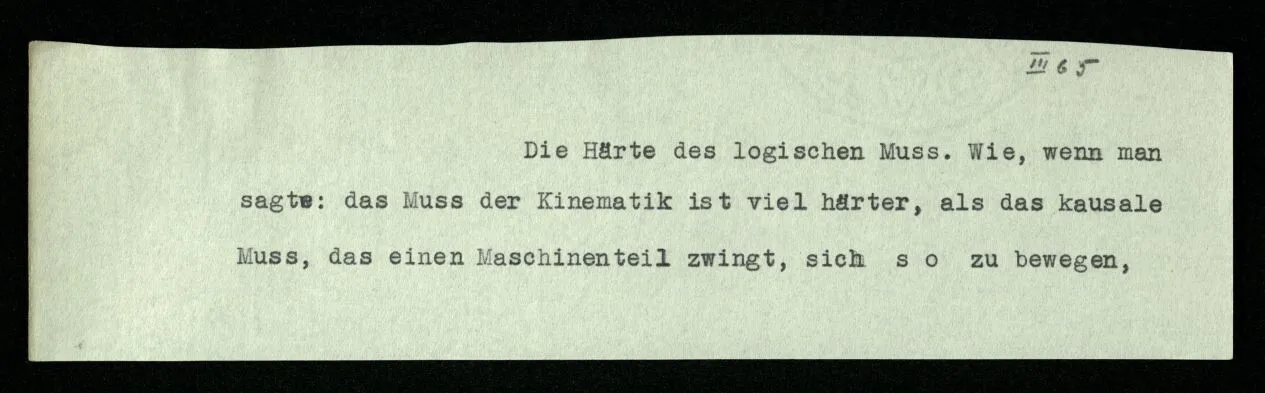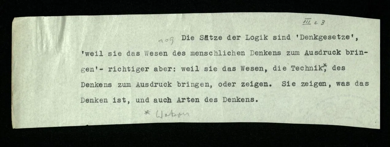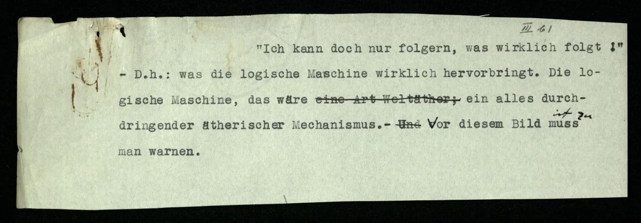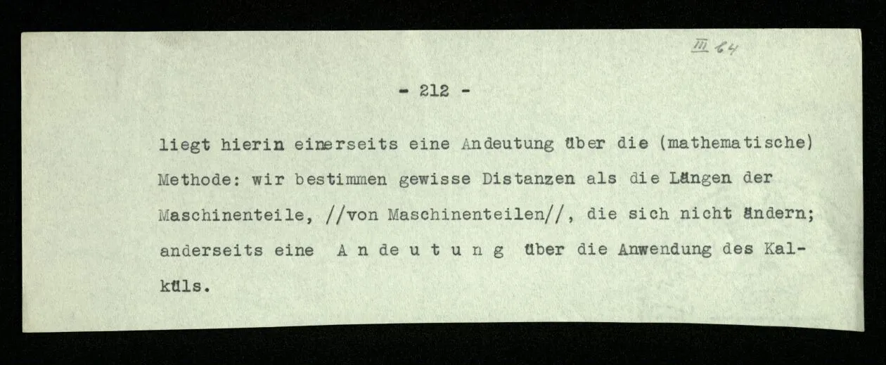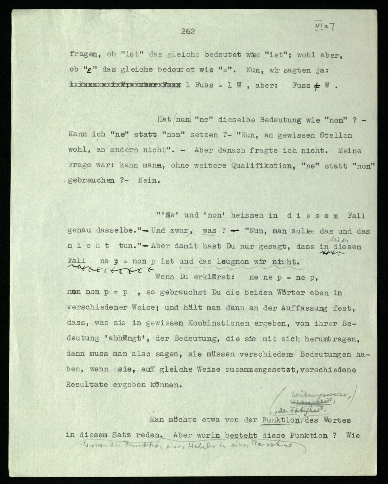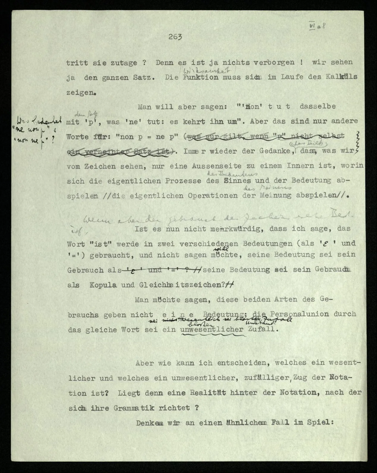 Man möchte etwa von der Funktion, der Tätigkeit, Wirkungsweise des Wortes in diesem Satz reden wie von der Funktion eines Hebels in einer Maschine. Aber worin besteht diese Funktion? Wie tritt sie zutage? Denn es ist ja nichts verborgen! wir sehen ja den ganzen Satz. Die Funktion muß sich im Laufe des Kalküls zeigen. Man will aber sagen: “‘non’ tut dasselbe mit ‘p’, was ‘ne’ tut: es kehrt ihn um”. Aber das sind nur andere Worte für: “non p = ne p”. Immer wieder der Gedanke, das Bild daß, was wir vom Zeichen sehen, nur eine Außenseite zu einem Innern ist, worin sich die eigentlichen Prozesse des Sinnes und der Bedeutung abspielen.
